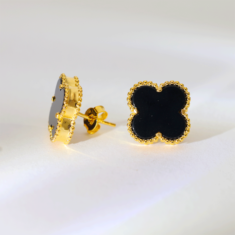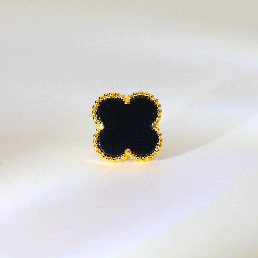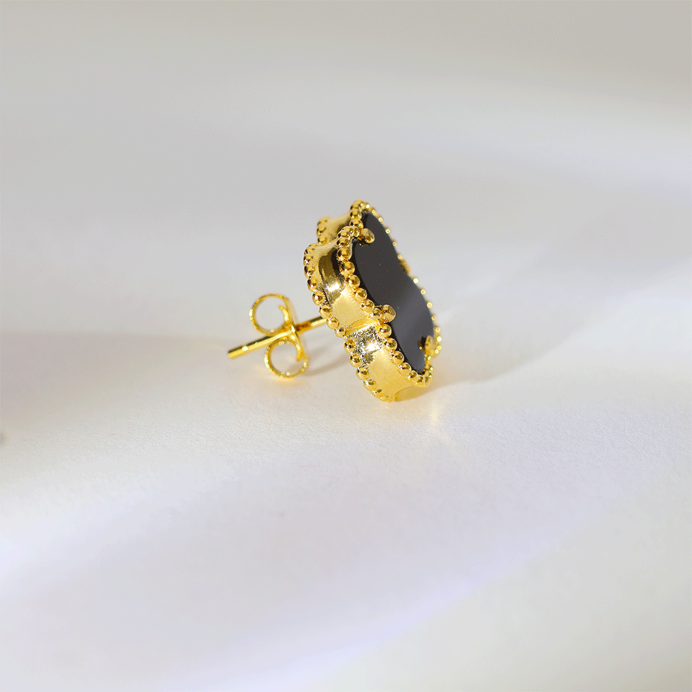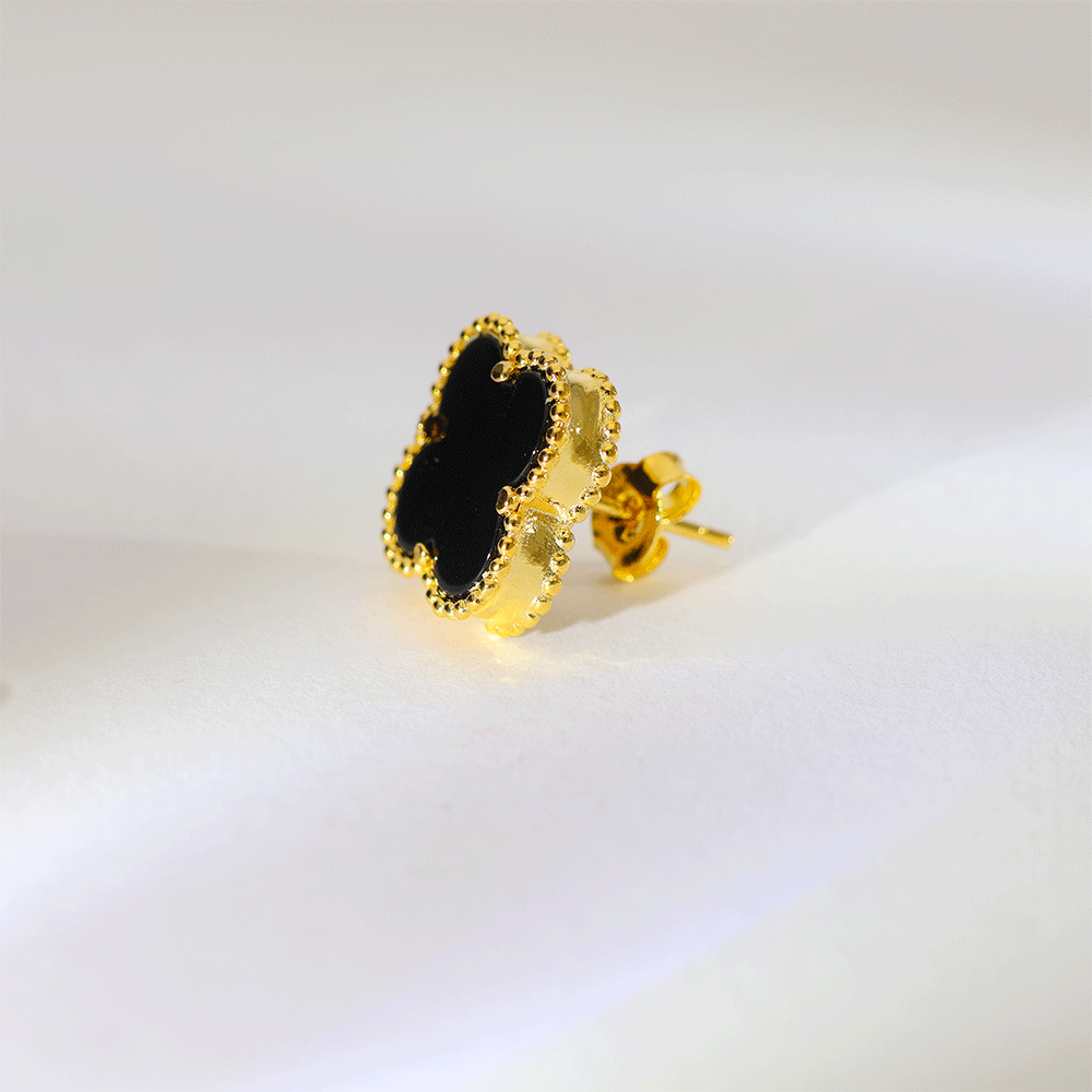 Design: A stylish clover-shaped earring with a smooth black center and a shiny golden bead border for a rich look.