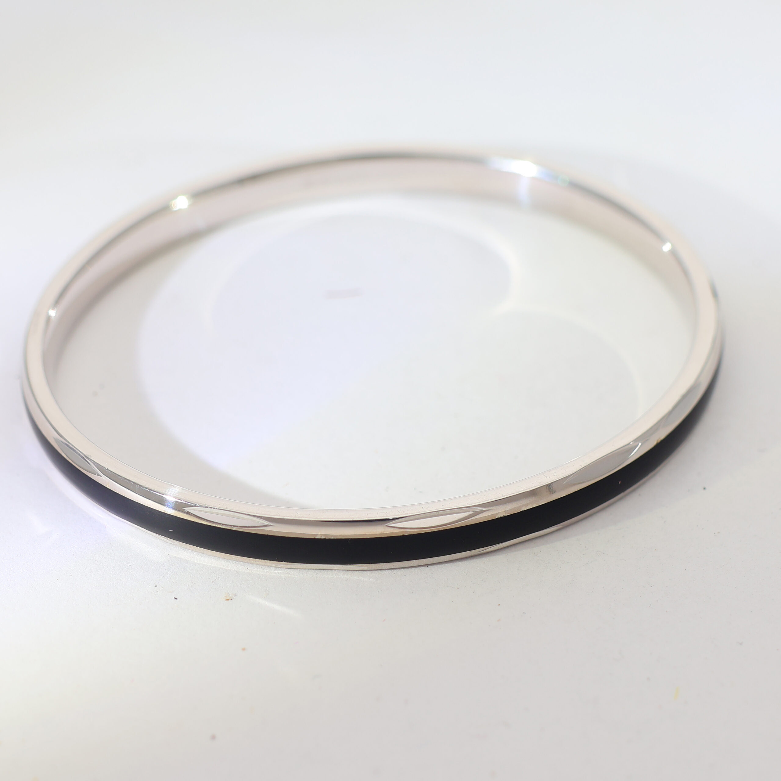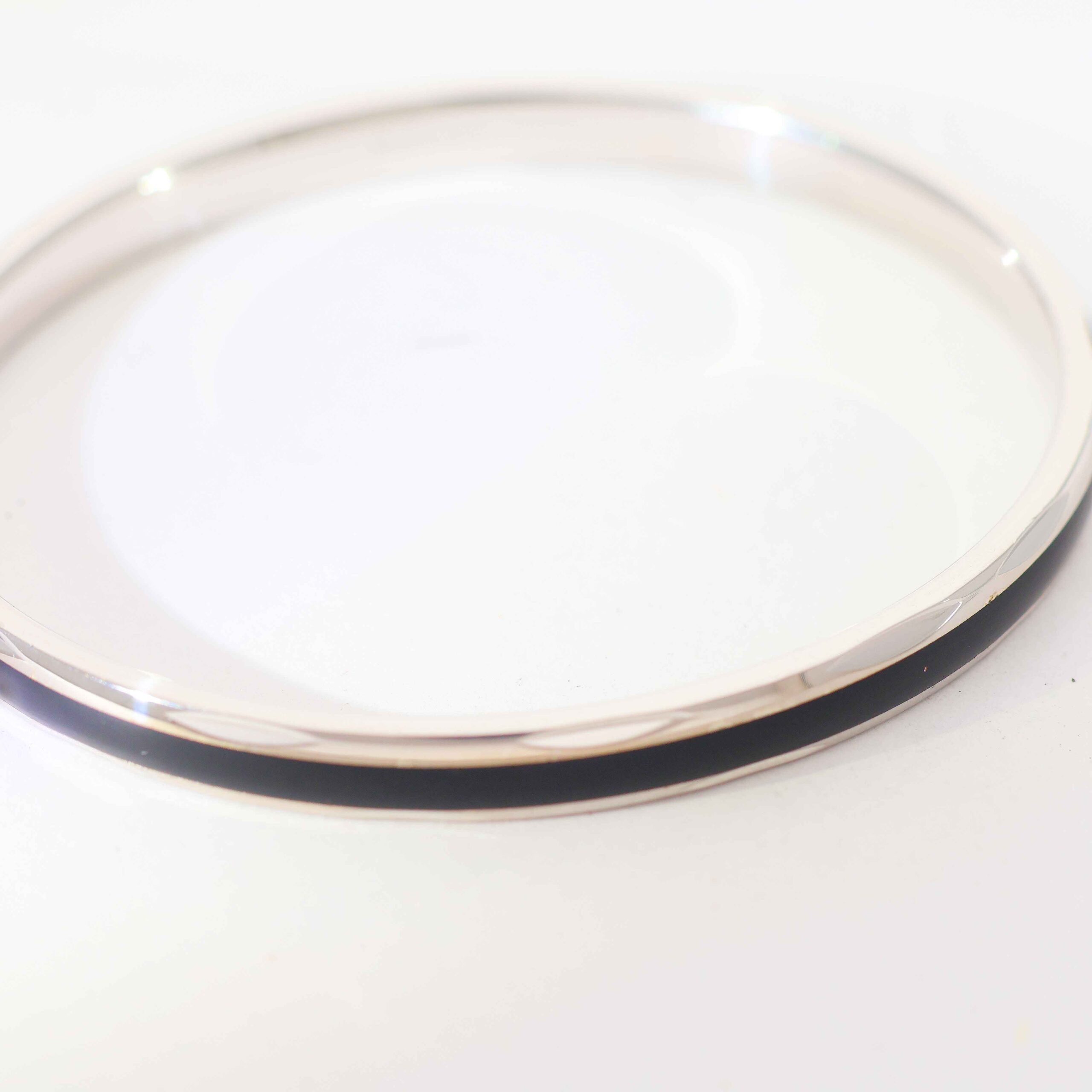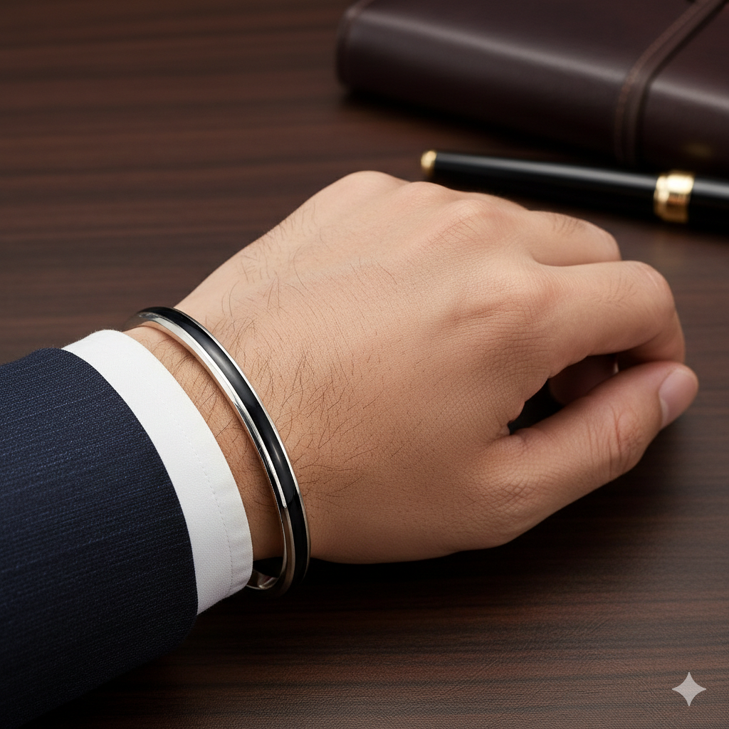 A polished silver round kadha featuring a smooth surface with a black enamel center stripe that creates a bold and contemporary gents kadha design.