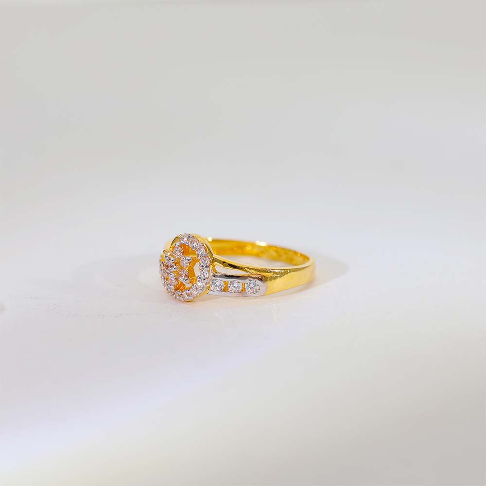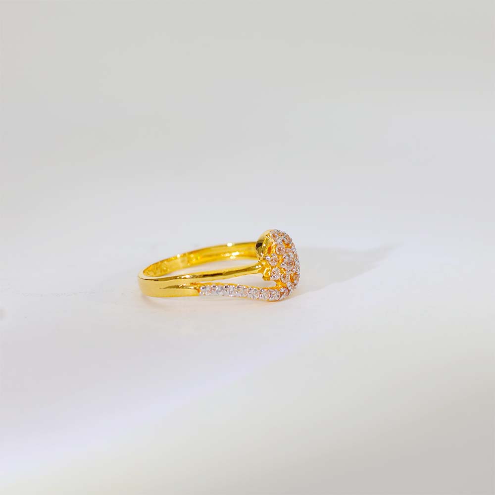 This ladies gold ring features a floral swirl center with sparkling stones and a slim band that feels light and graceful on the finger.