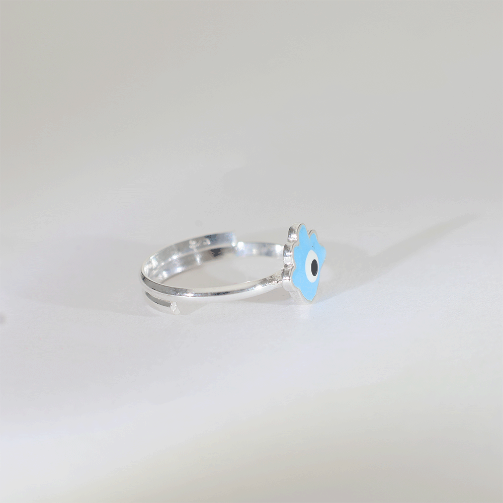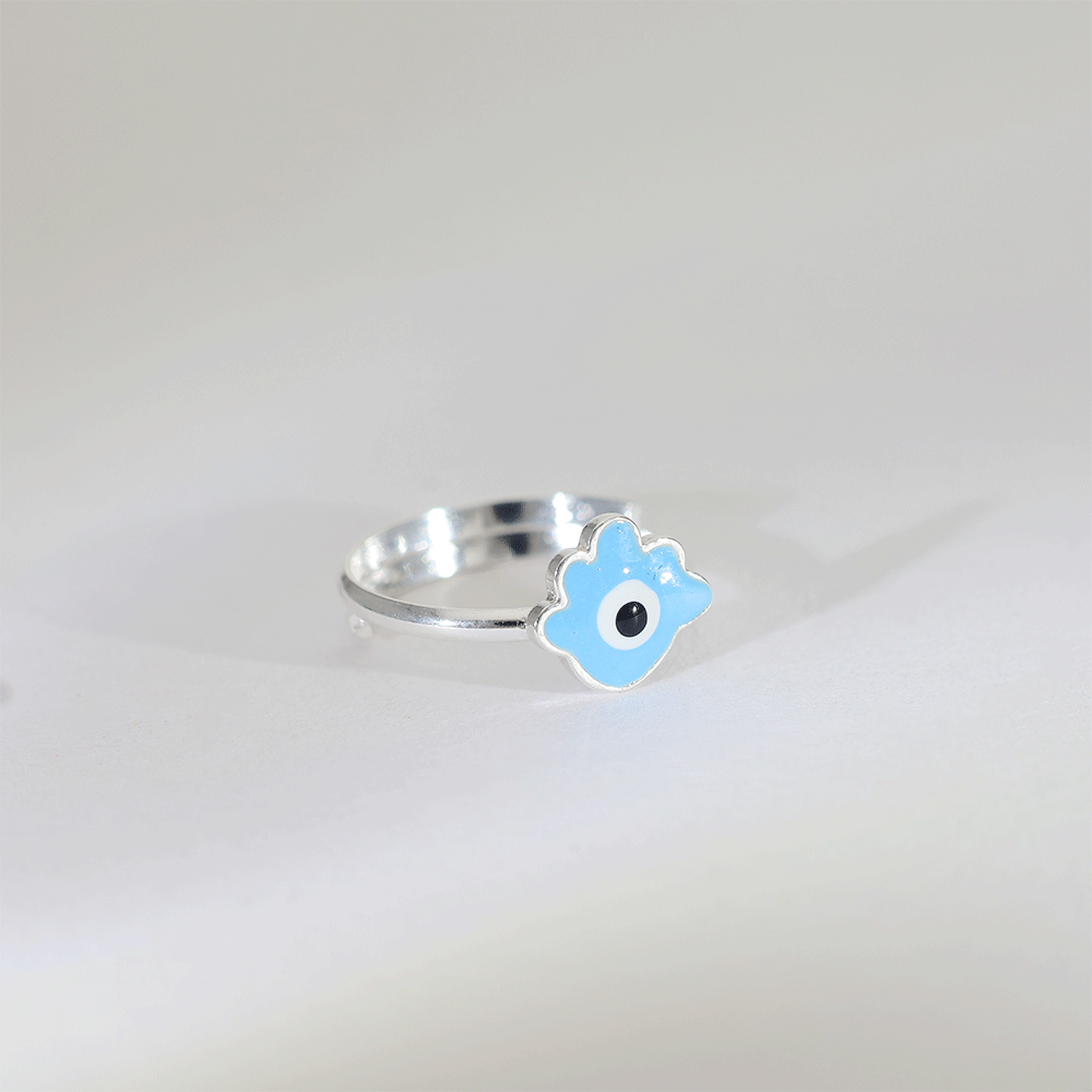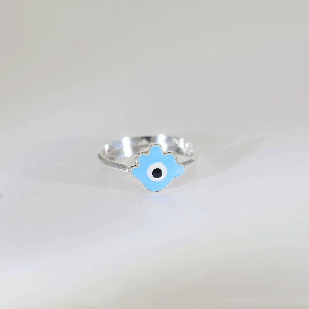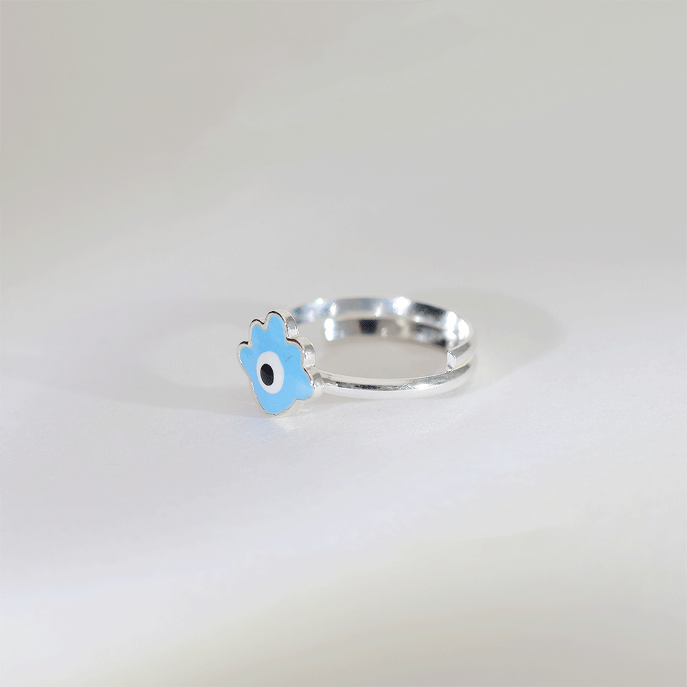 Design: A polished 92.5 silver baby ring featuring a blue evil eye enamel charm, designed to offer both style and protection.