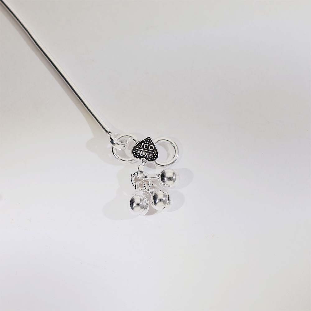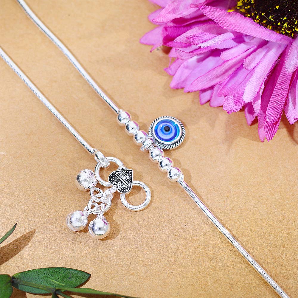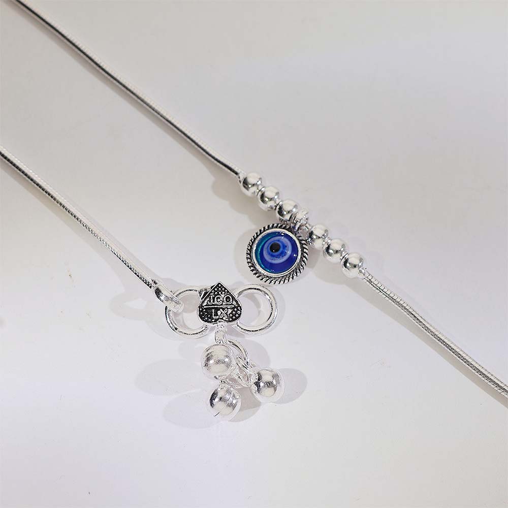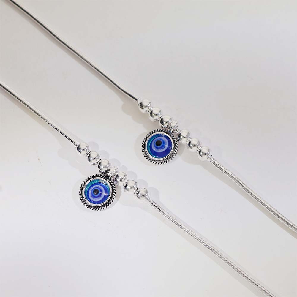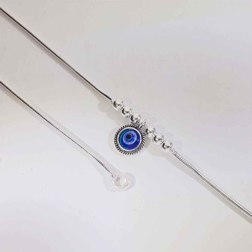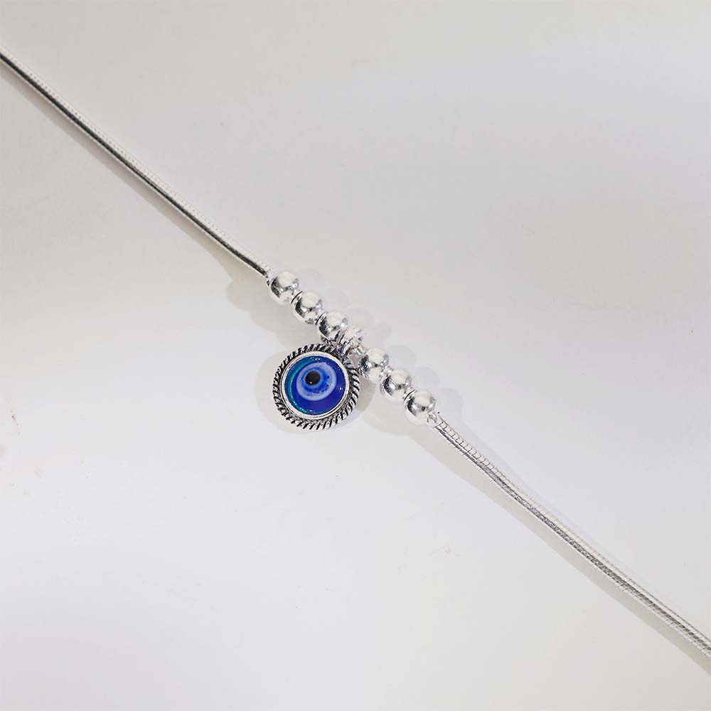 Features a sleek silver chain with round silver beads and a bright blue evil eye centerpiece.