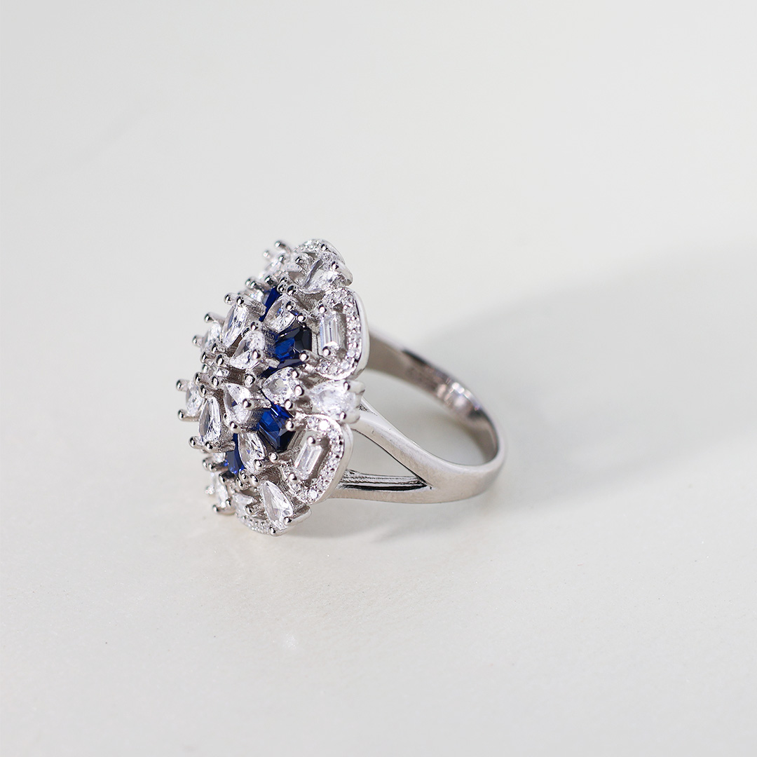 Vivid Blue Sapphires: Interspersed among the clear stones are vibrant blue sapphires. These sapphires provide a striking contrast in color and add a touch of regal elegance to the ring.