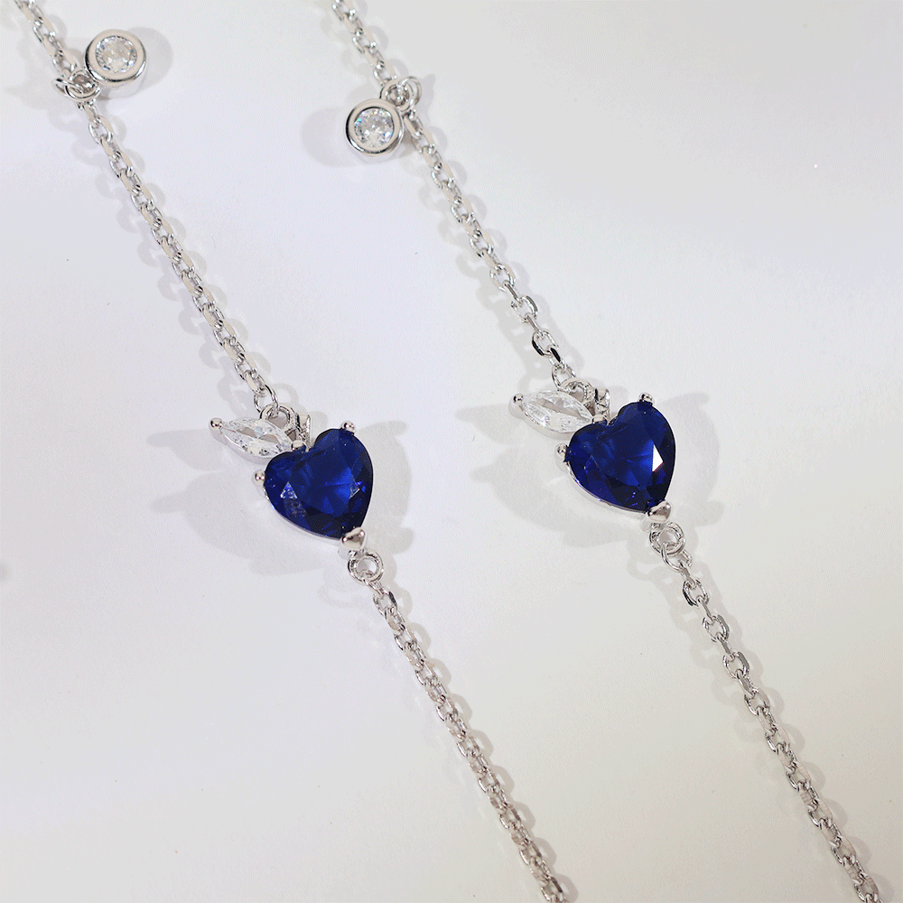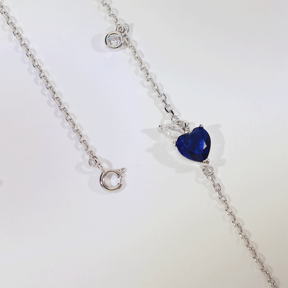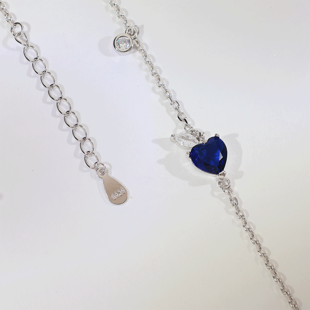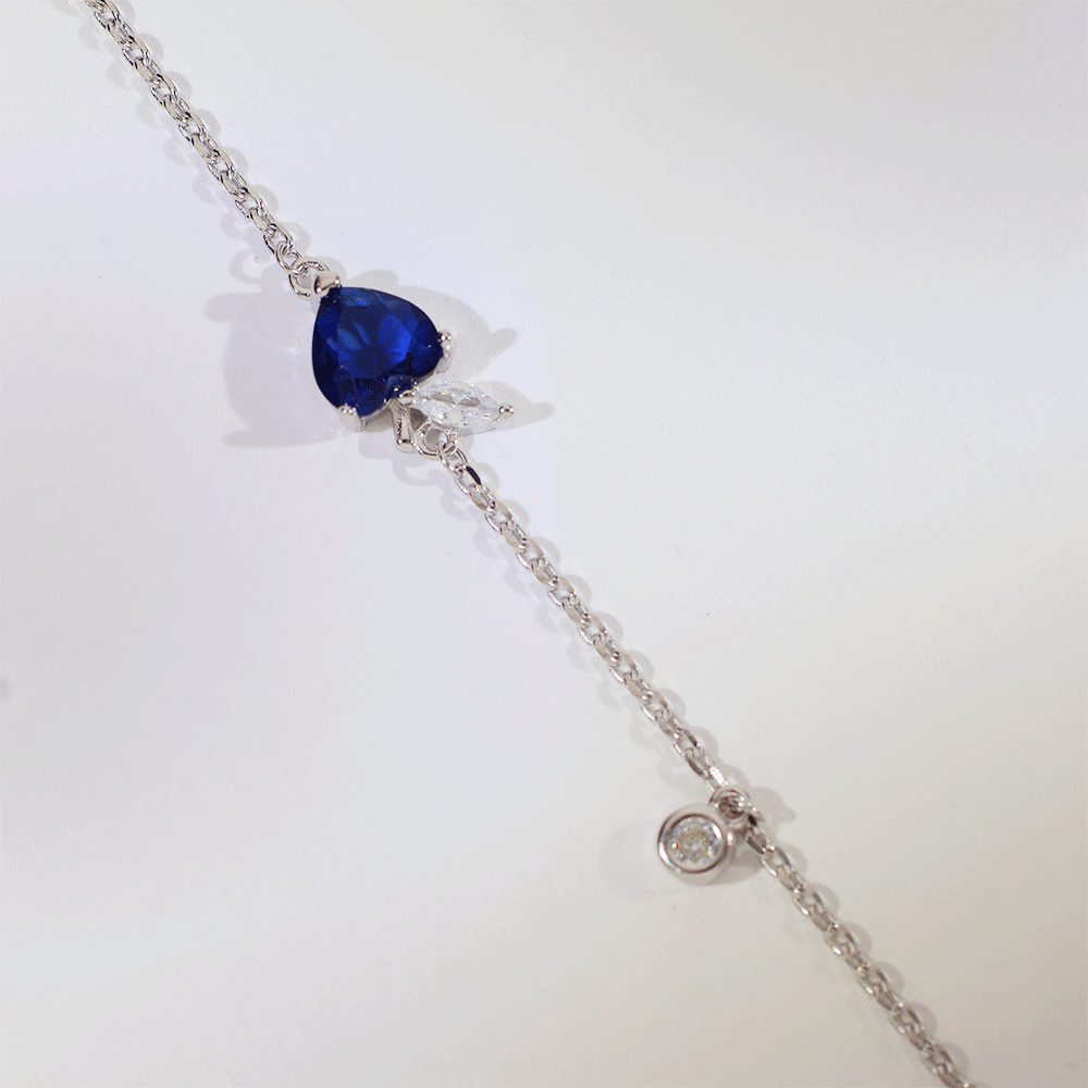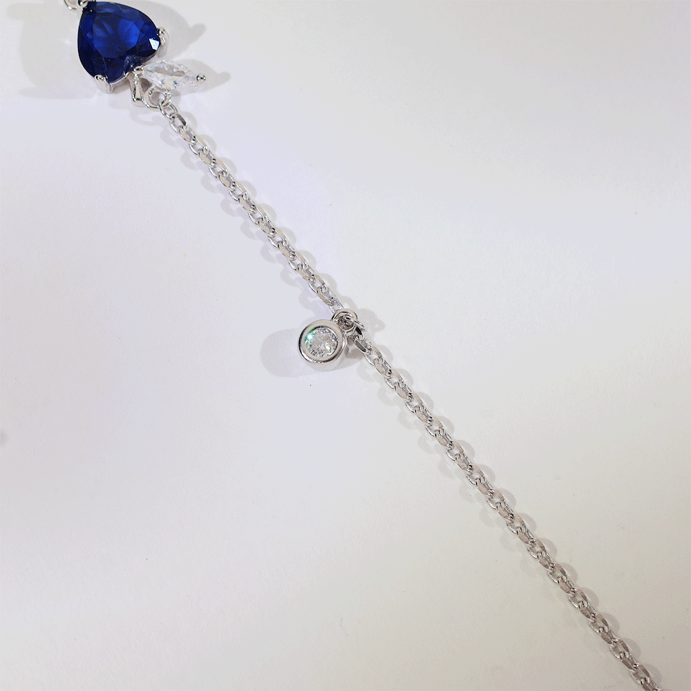 Design: A delicate anklet with a deep blue heart stone and a small shining drop charm for a soft elegant look.