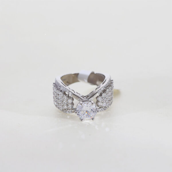 Dynamic Swirl Design: The most striking feature is the ring’s dynamic, swirling design. Multiple rows of smaller diamonds or diamond simulants are pavé set in a spiral pattern, creating a sense of movement and a cascade of sparkle.