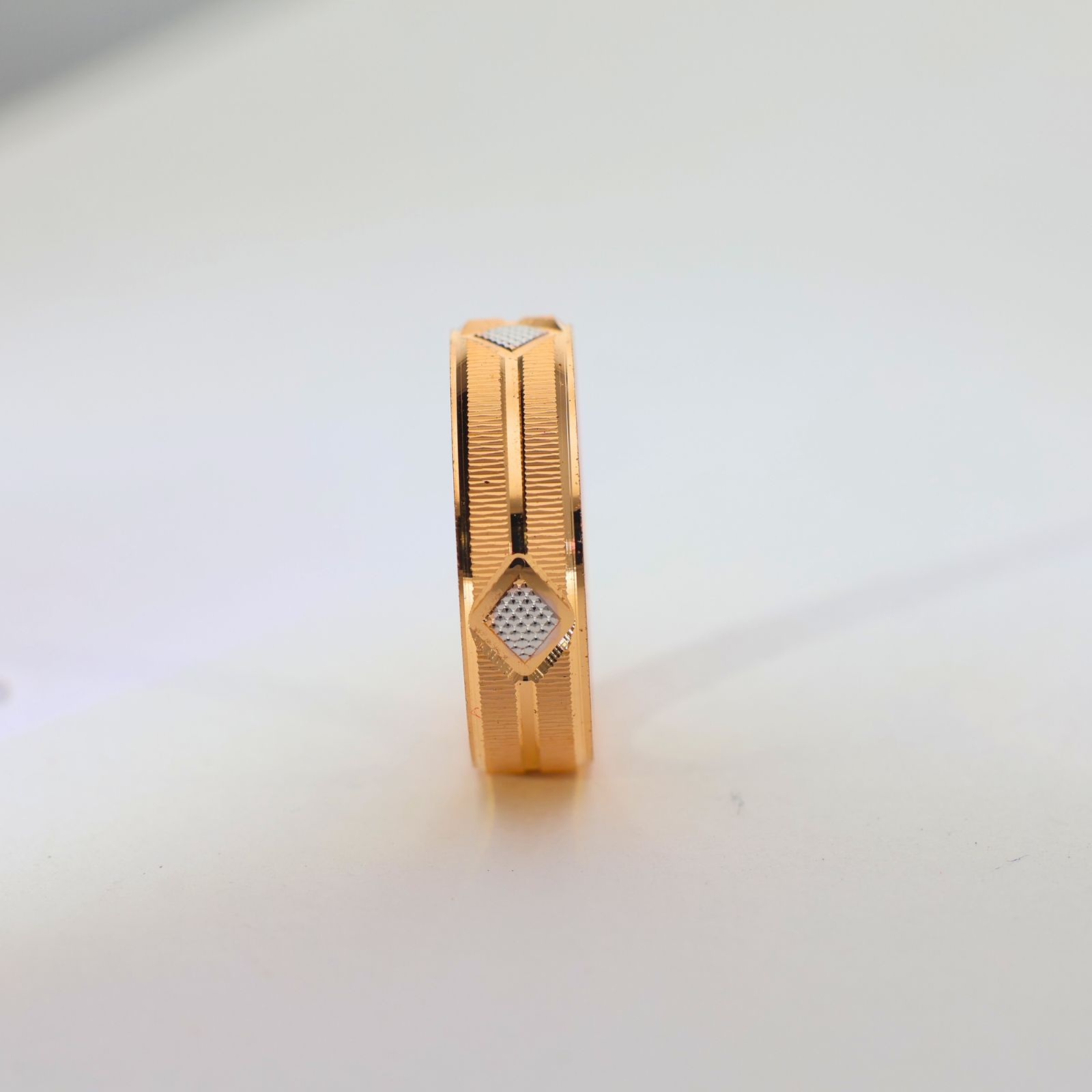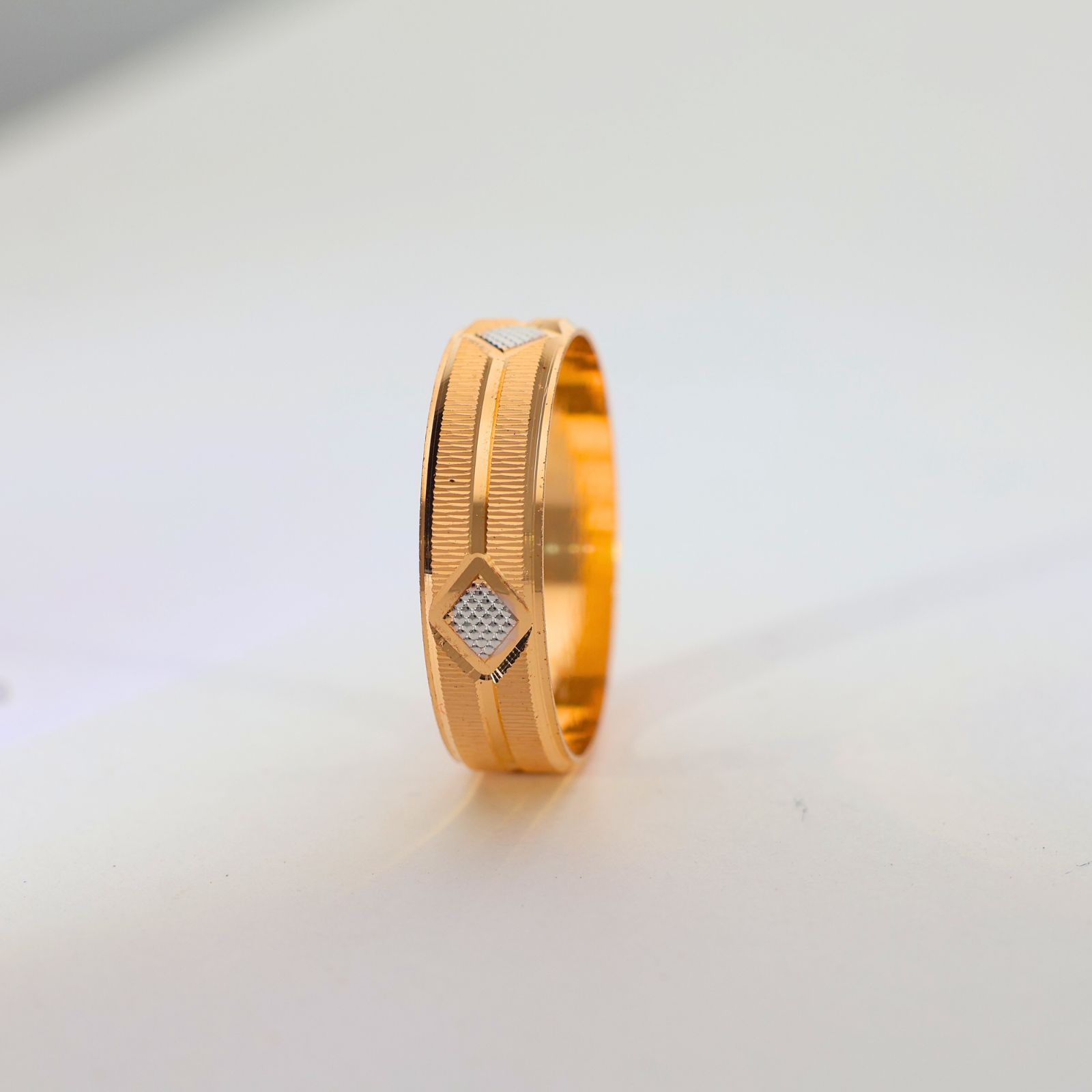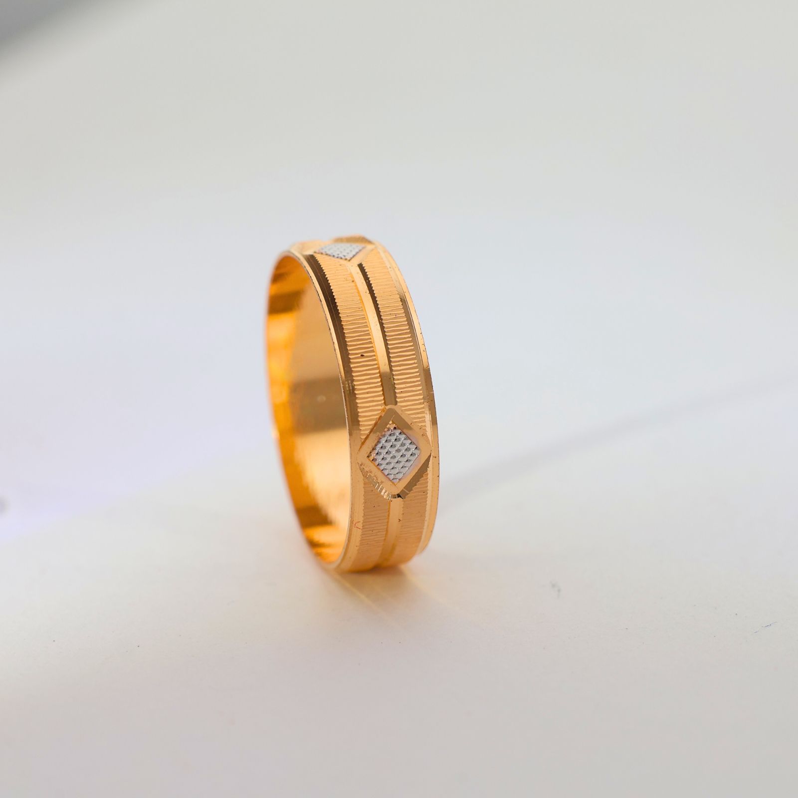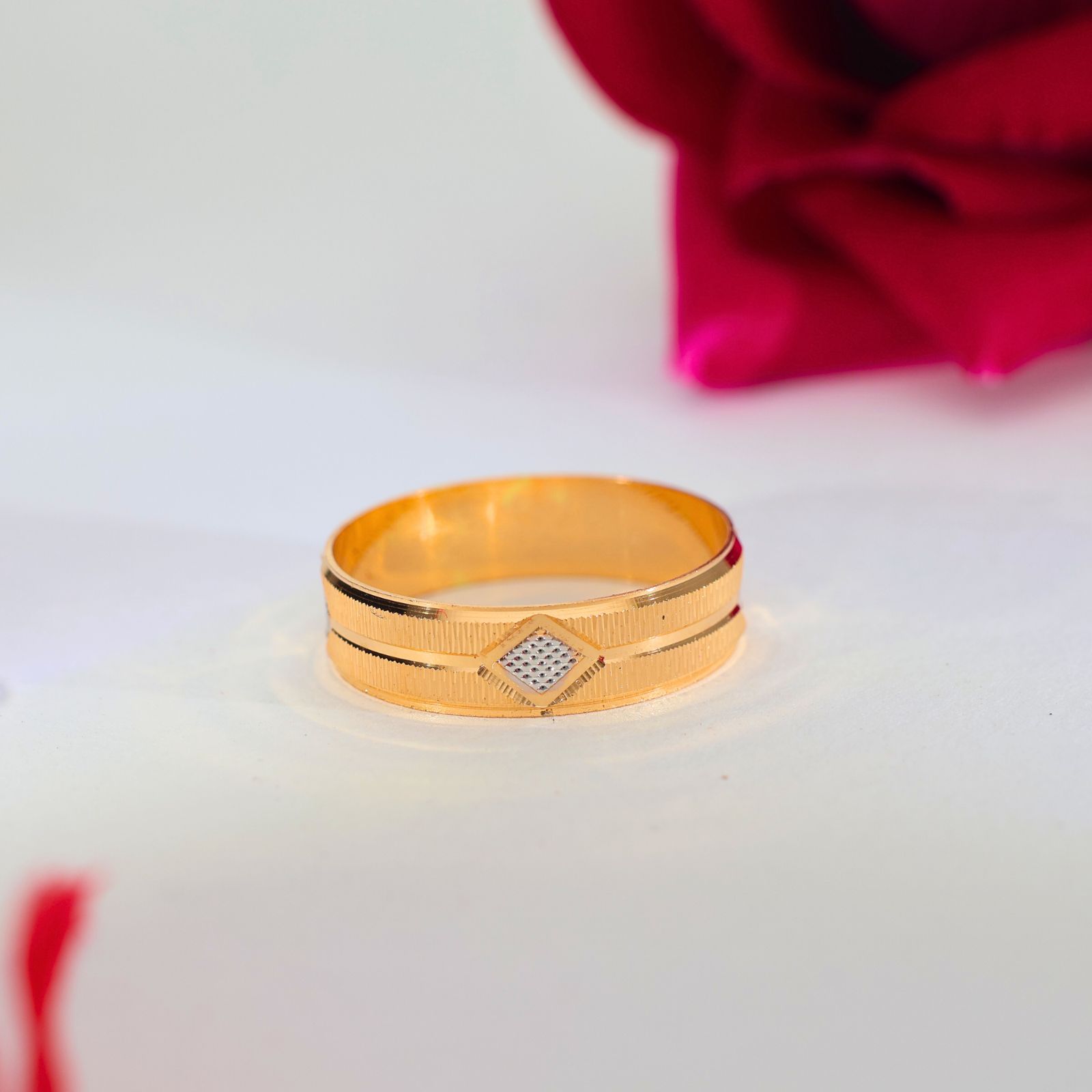 Design: Crafted with a smooth gold band and a small diamond-shaped textured center, giving it a refined and modern look.