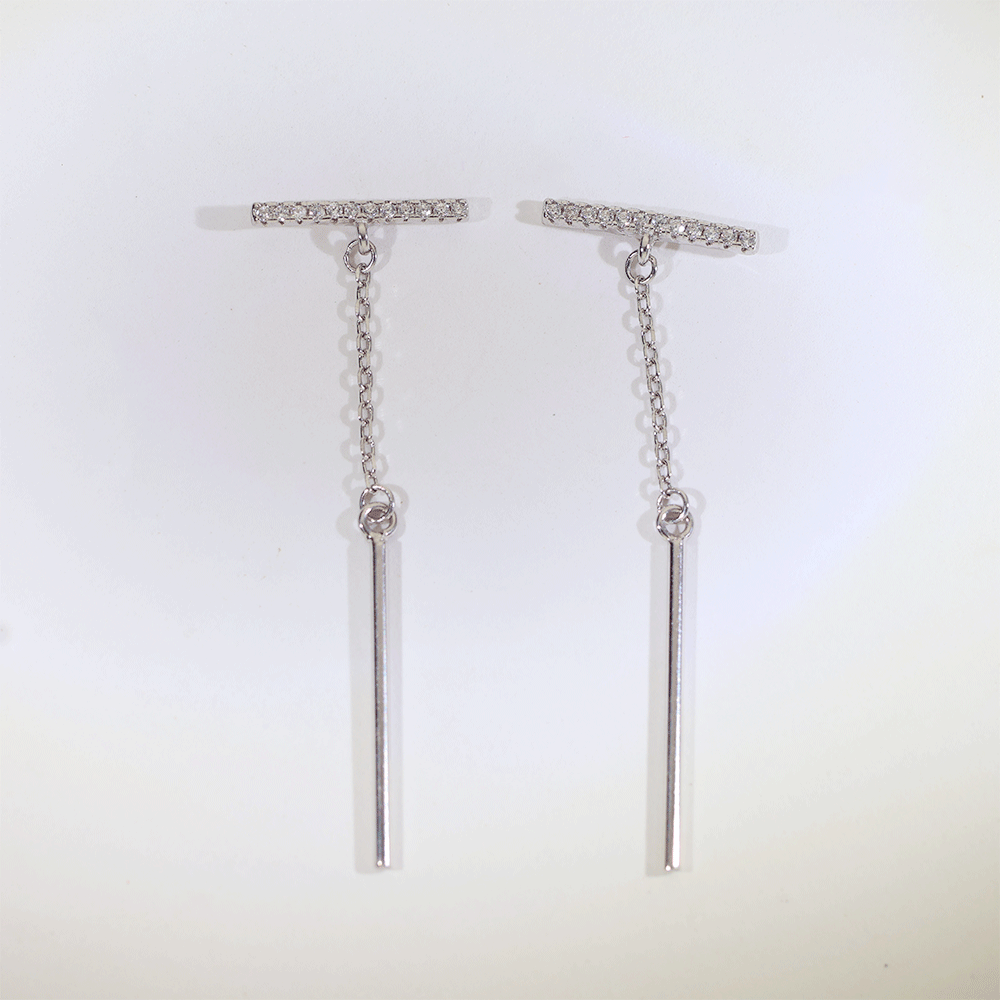 Design: These earrings have a stylish top bar with fine stones, connected to a chain and long drop piece that adds a graceful flow.