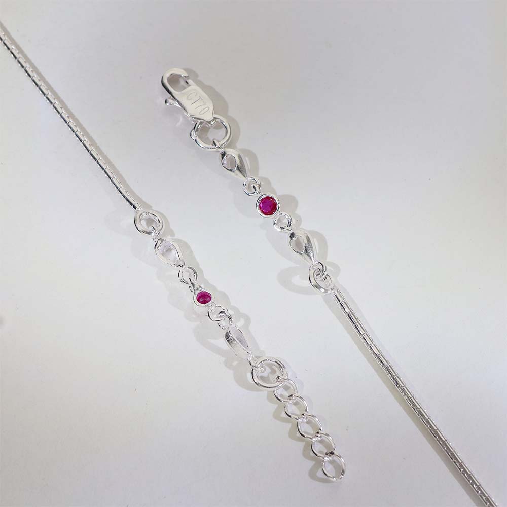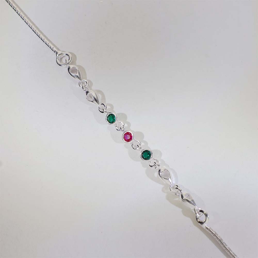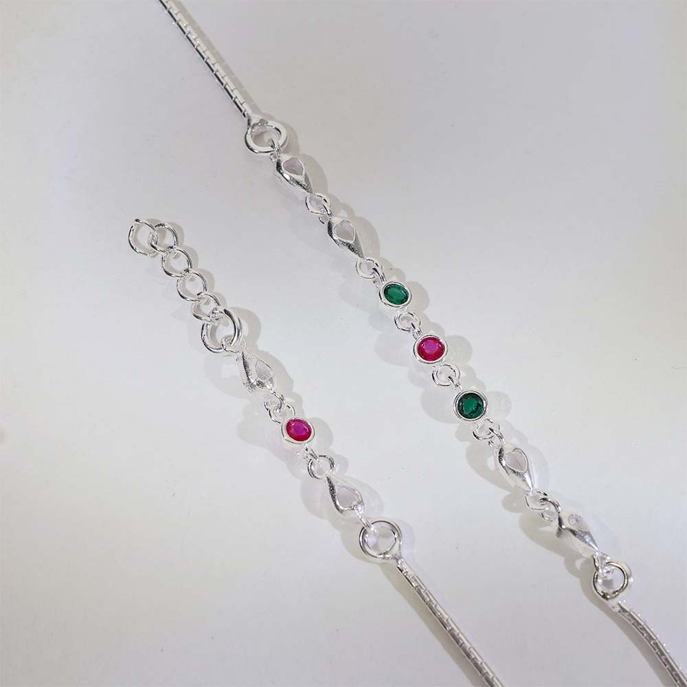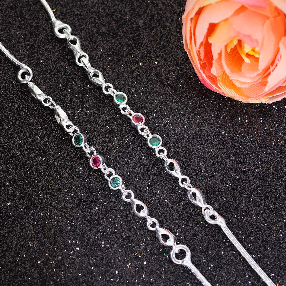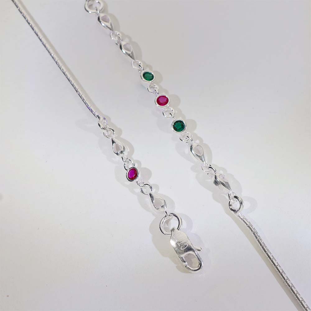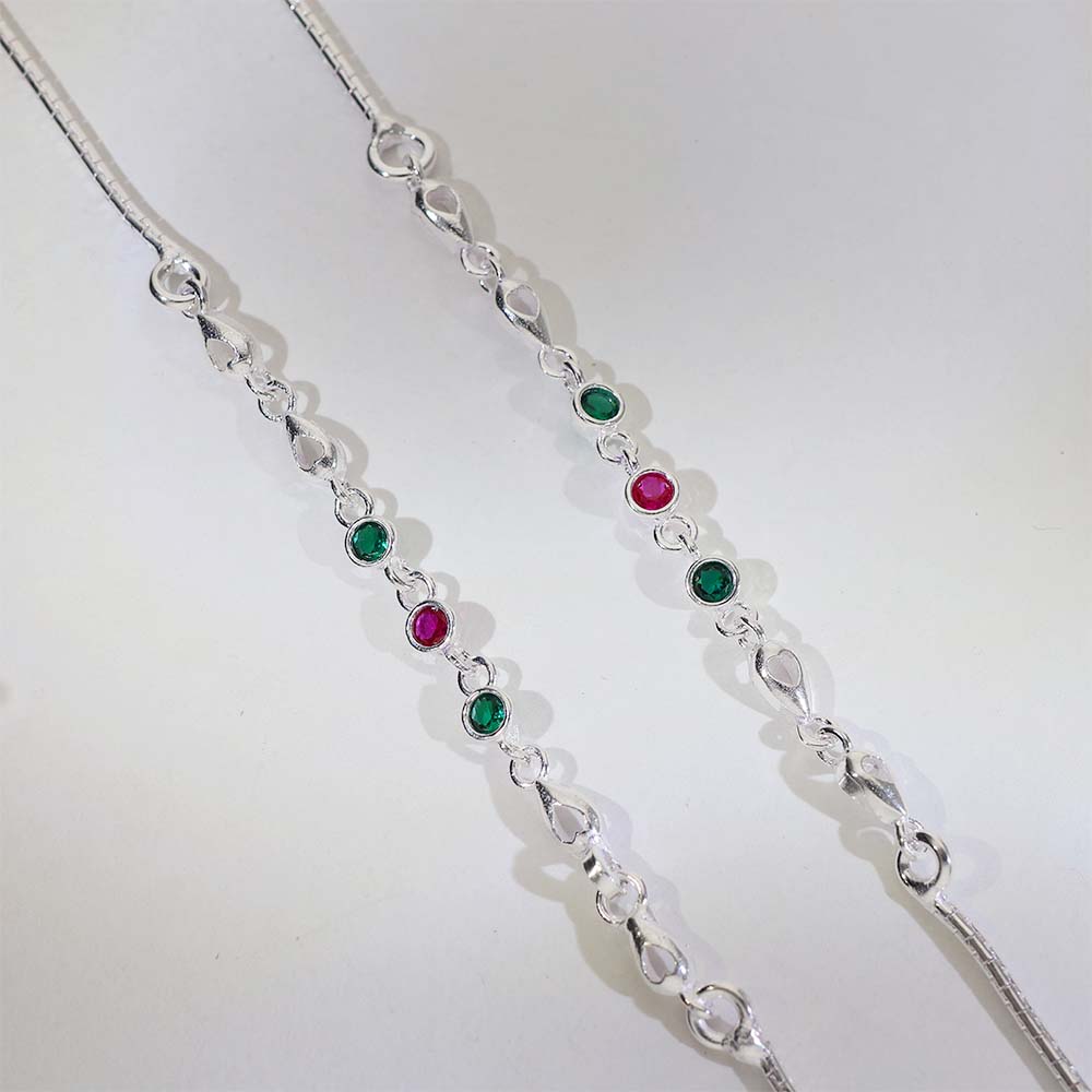 Design: Fine silver anklets with heart-shaped links and small round pink and green stones placed evenly for balanced beauty.
