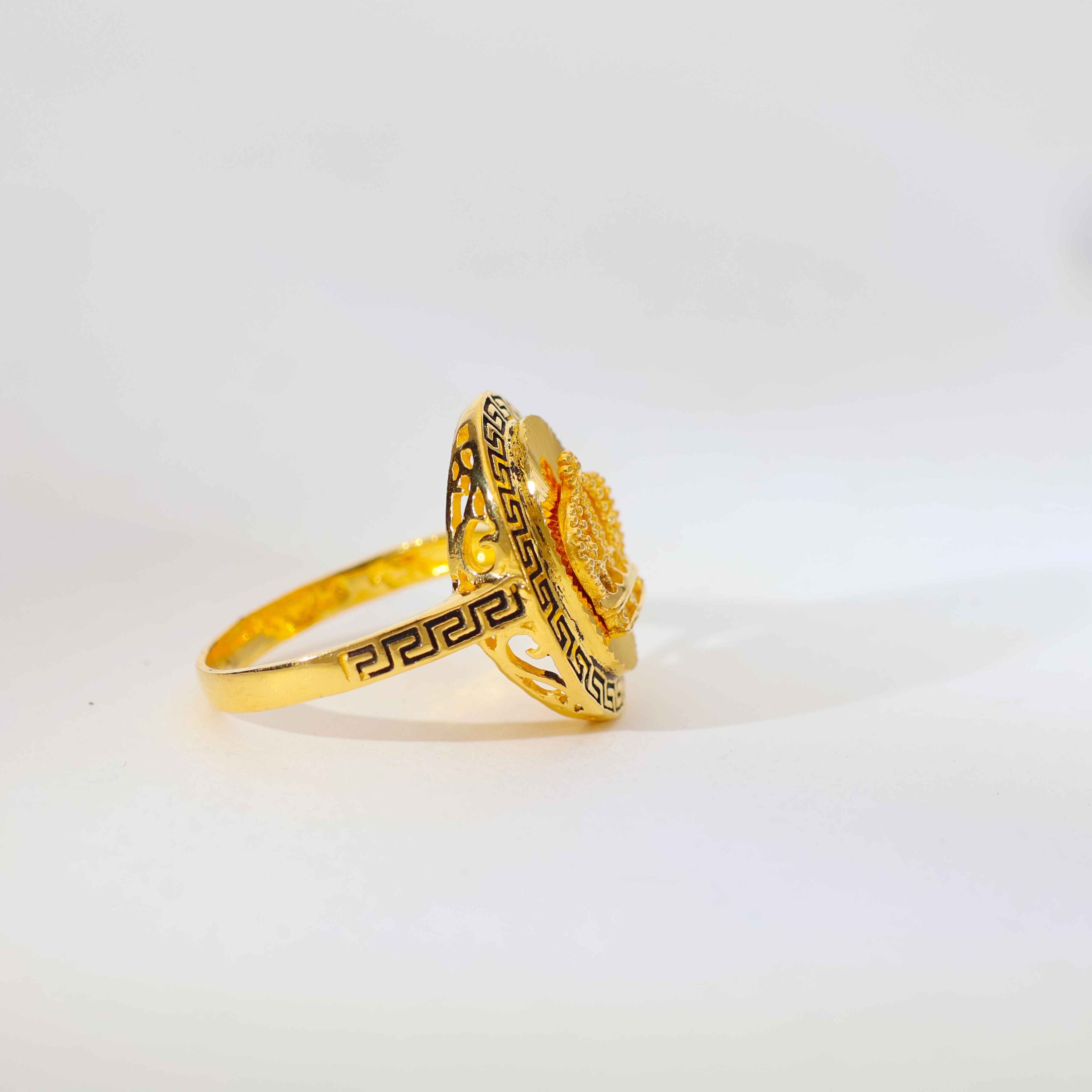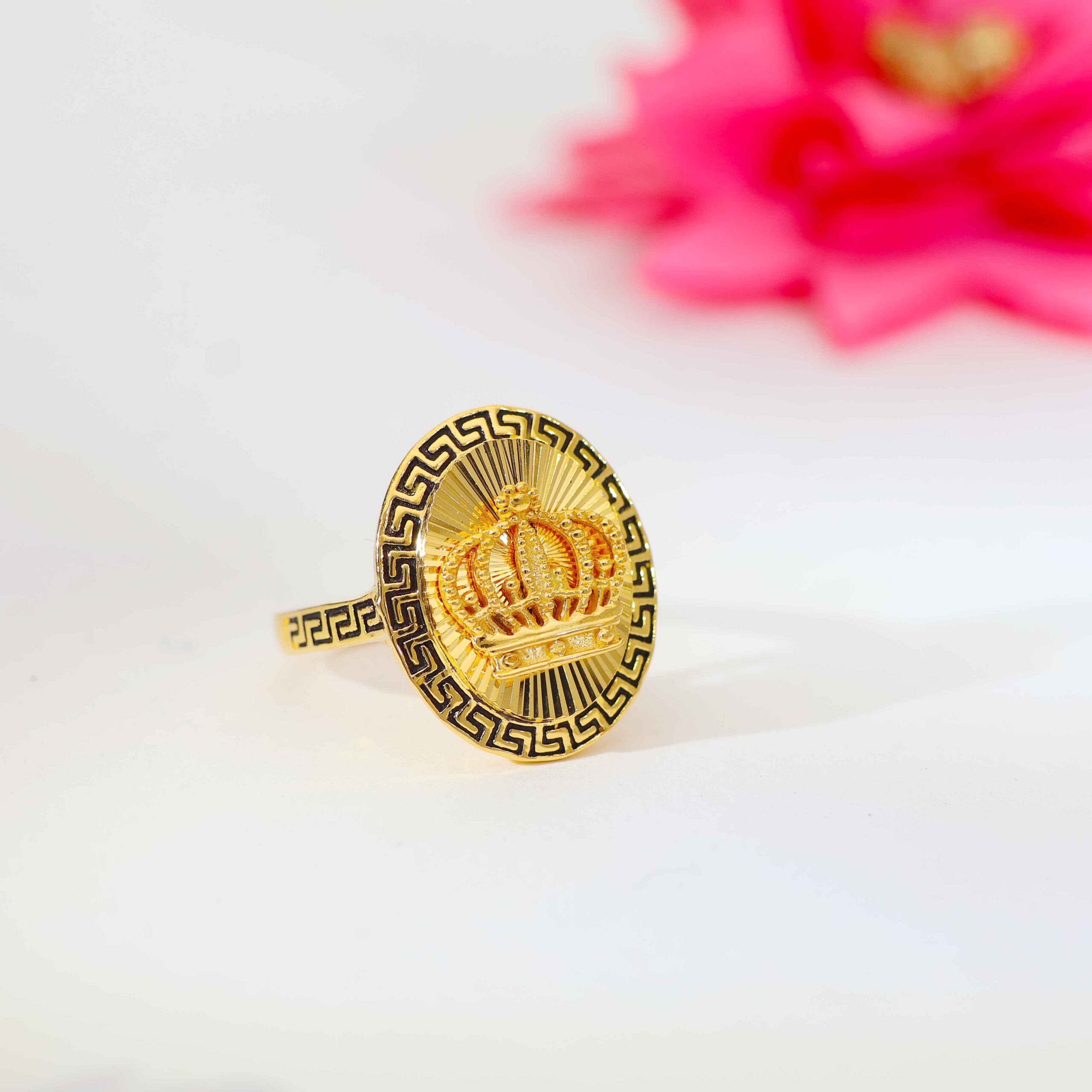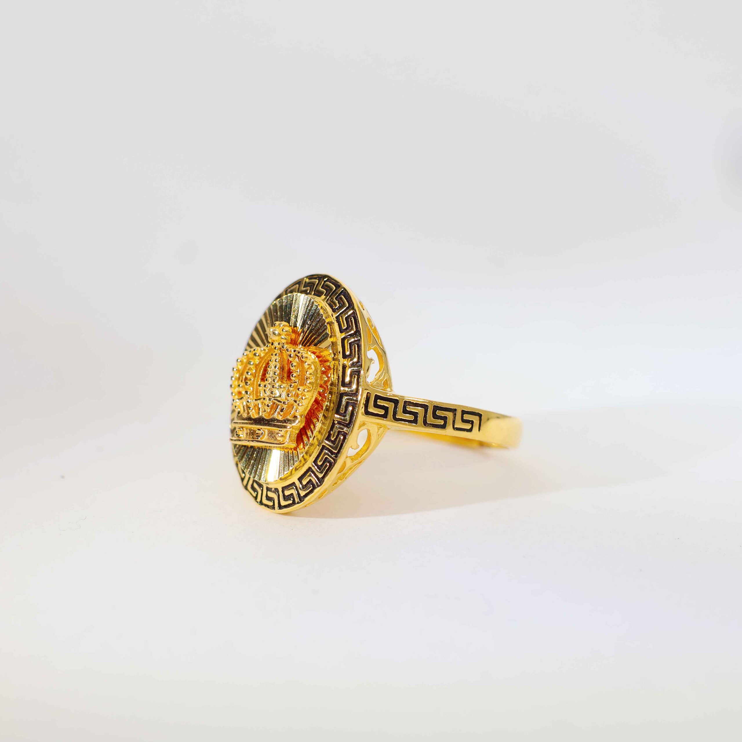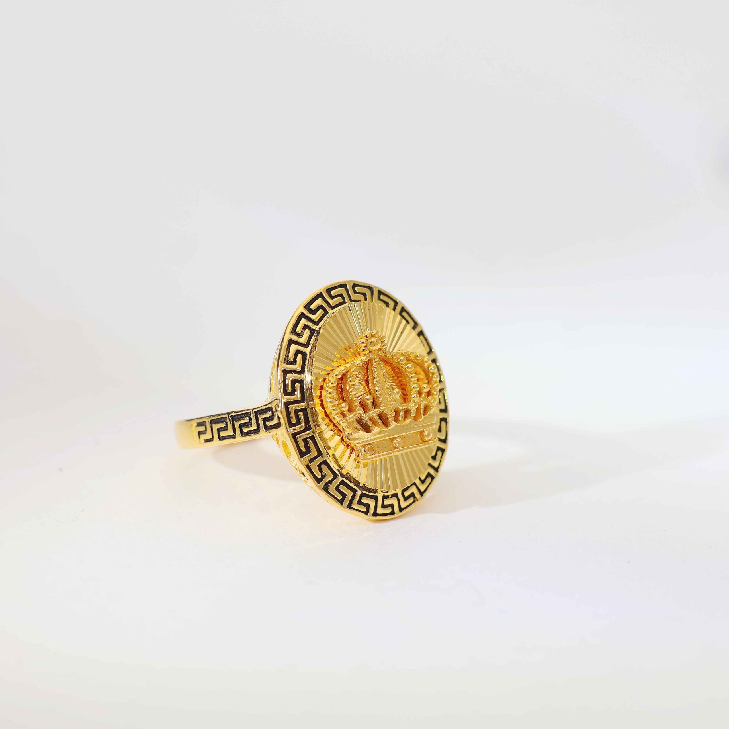 The ring features a raised gold crown placed over a sunray-textured oval base. Surrounding it is a bold black Greek border that enhances the design and adds a premium designer finish. The slim band is soft, smooth, and comfortable for daily wear.