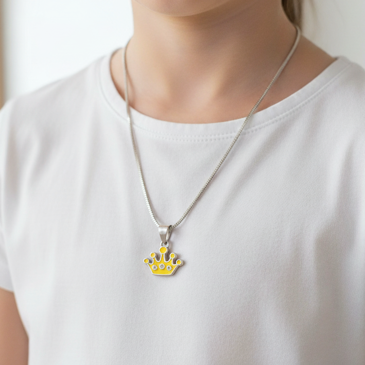 The pendant boasts a silver crown design filled with enamel hues and accent stones that gleam with every giggle and step.
