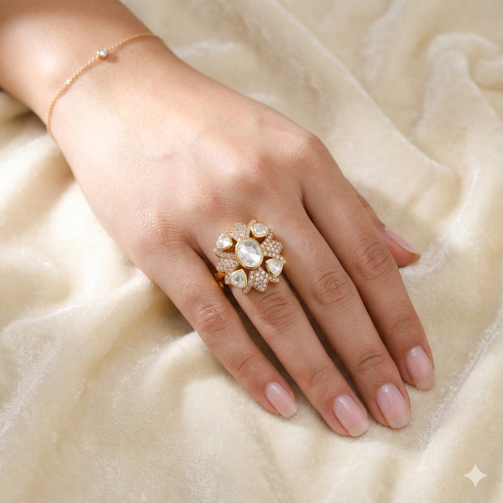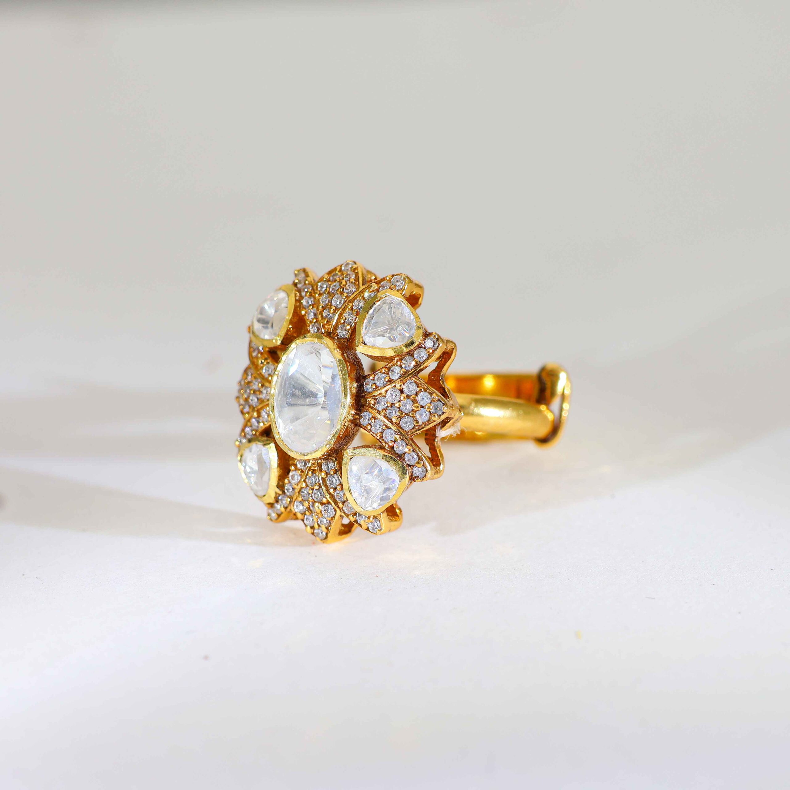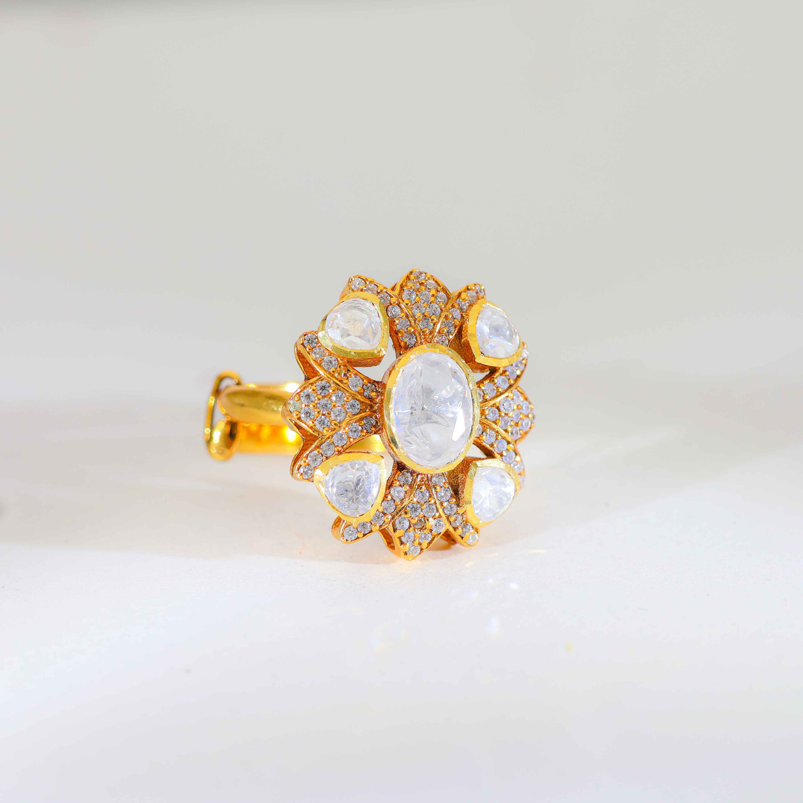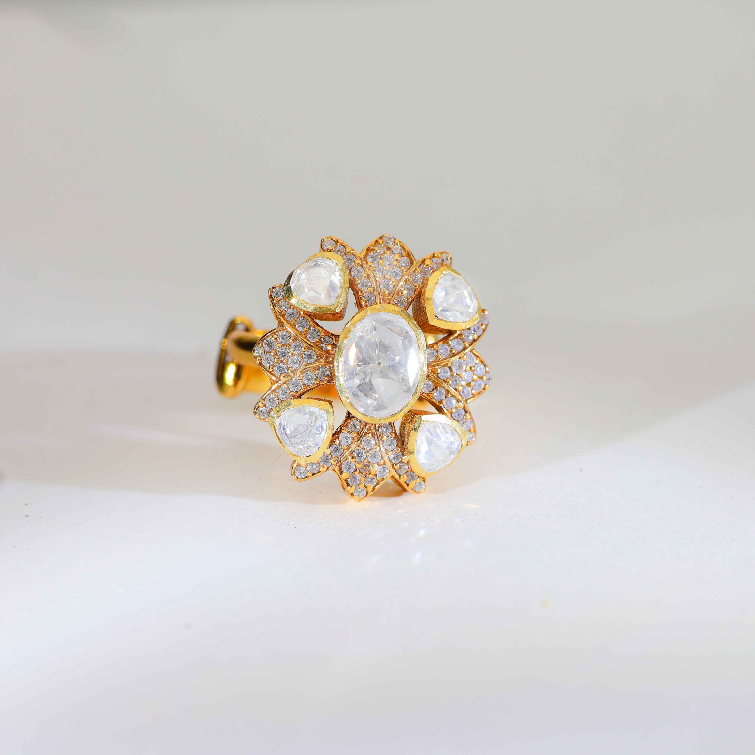 A gold ring featuring a clear center stone surrounded by petal-shaped kundan stones, forming a soft floral pattern.