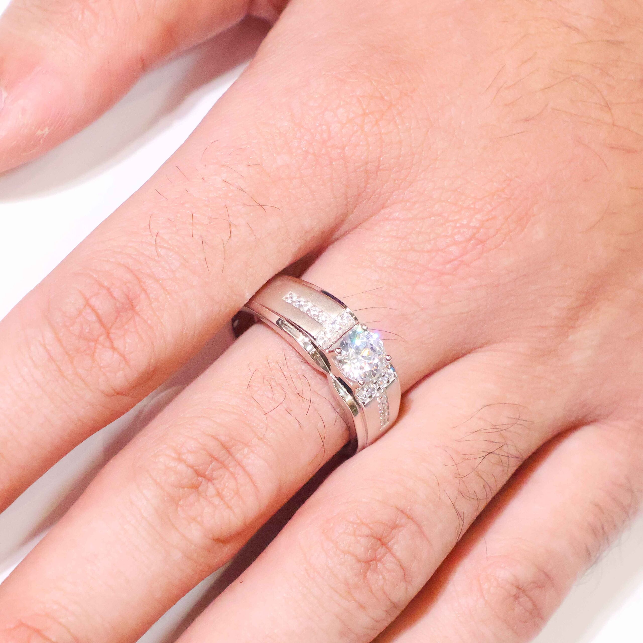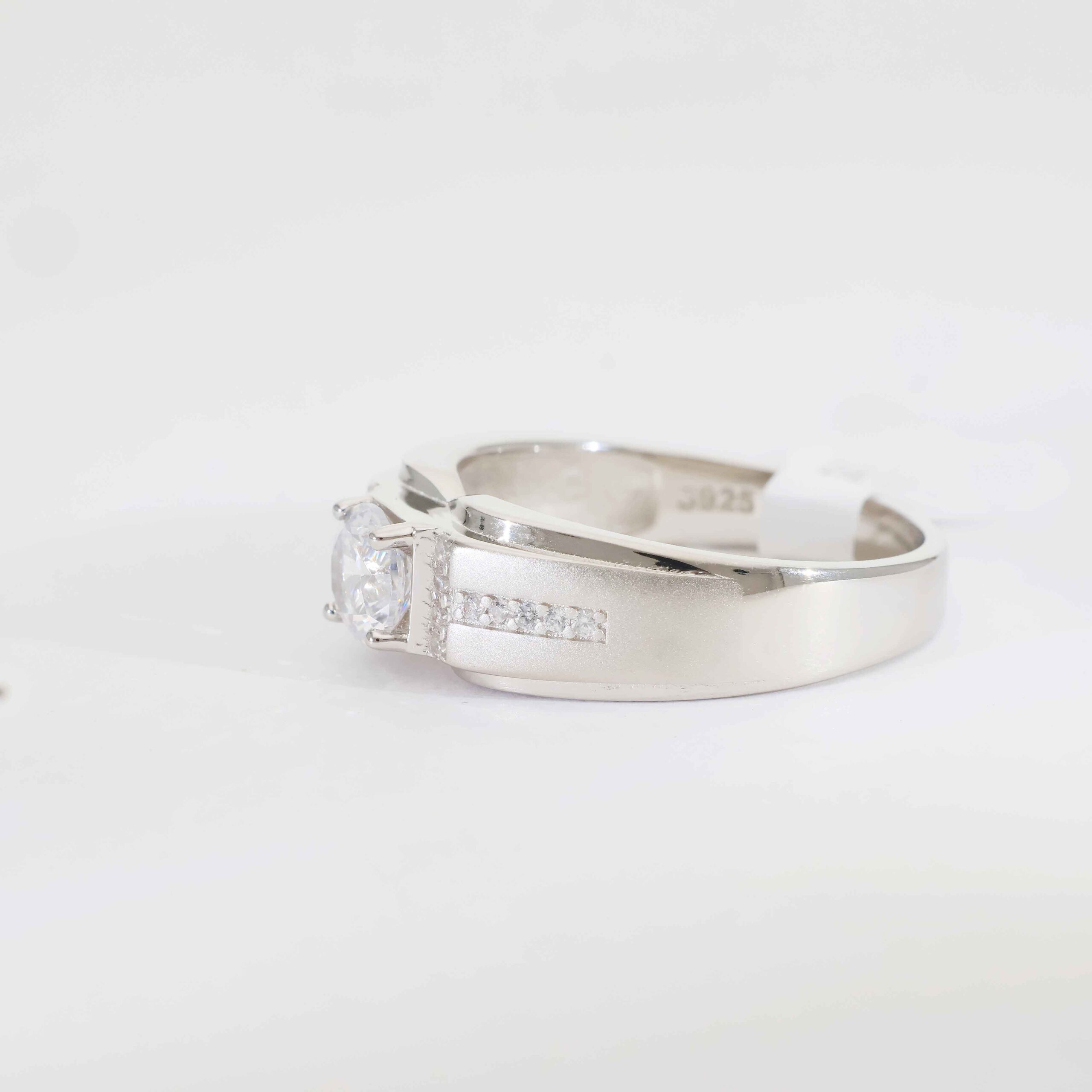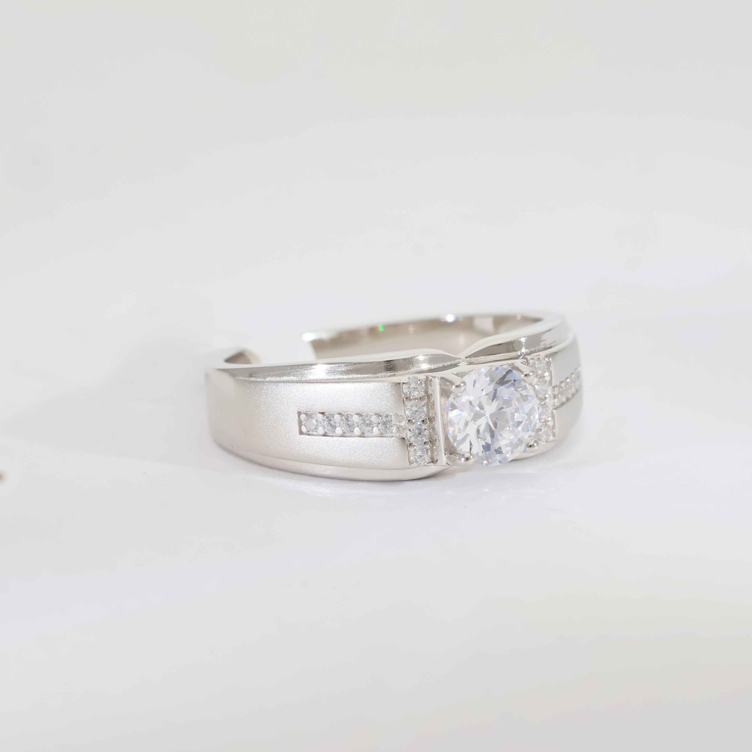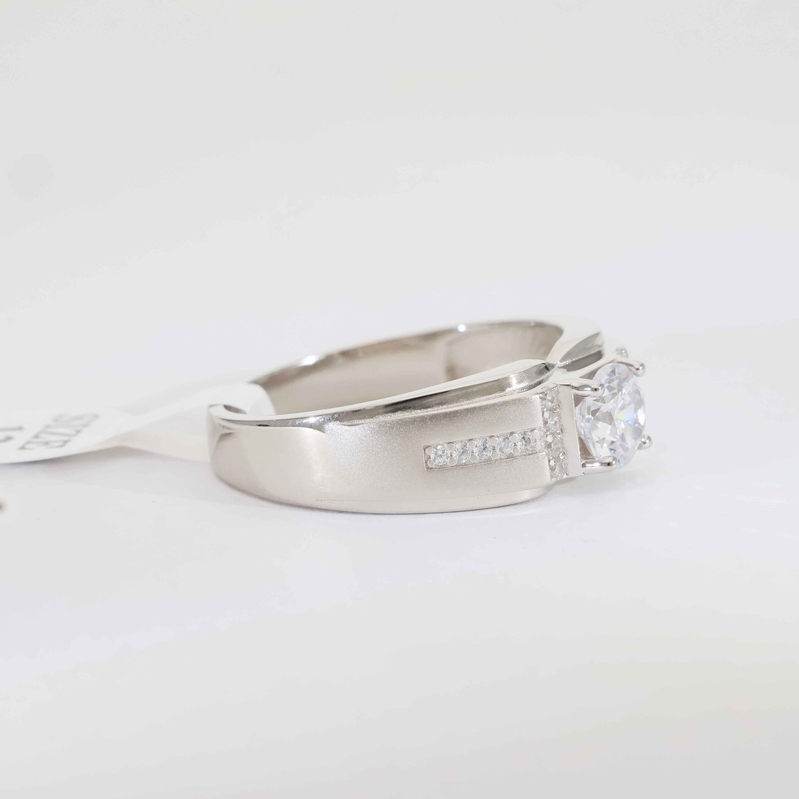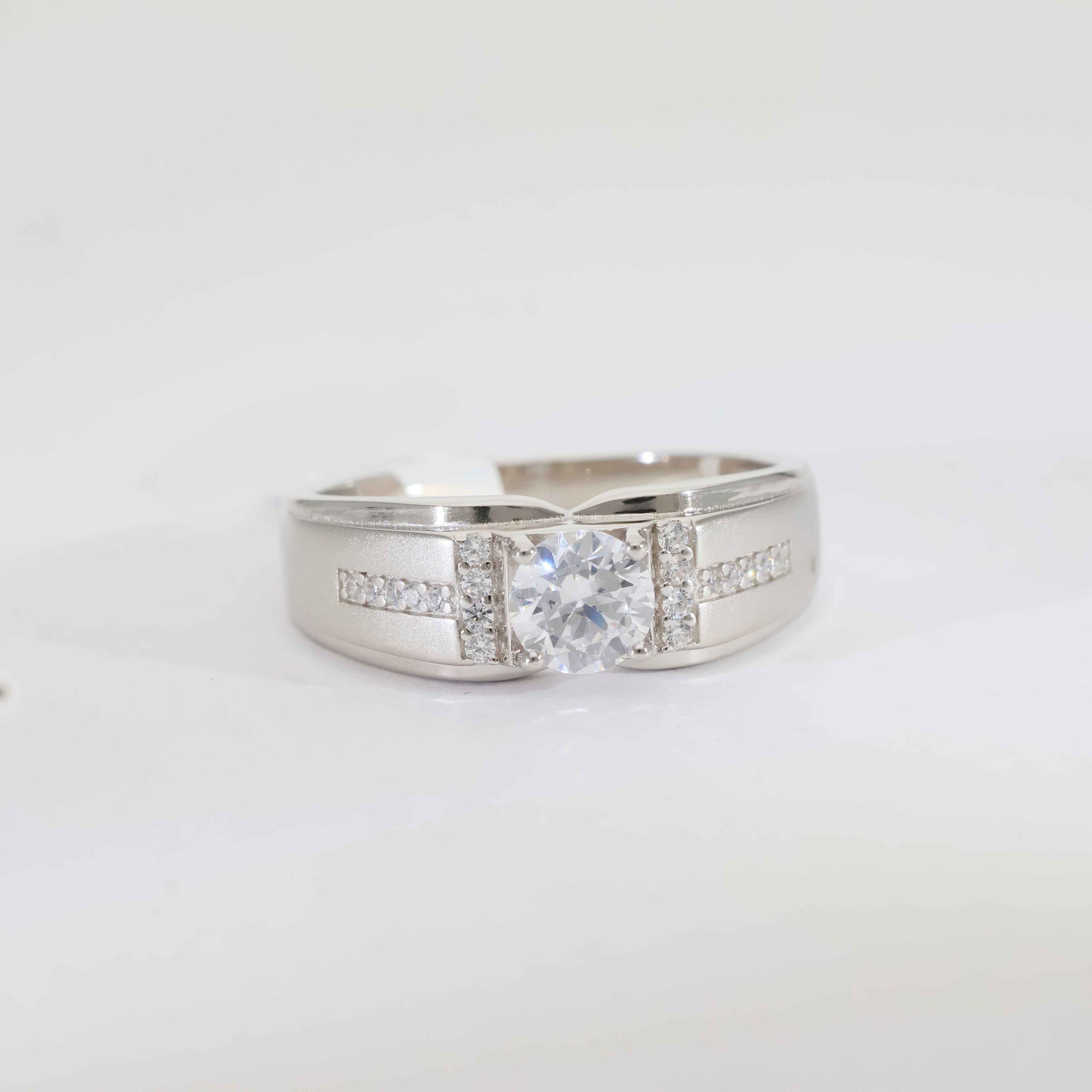 A bold square-cut clear stone secured in a strong silver frame, enhanced with clean channel-set side stones for a powerful and balanced look.