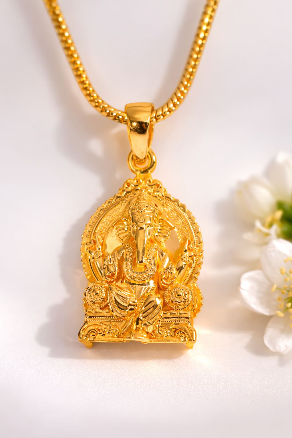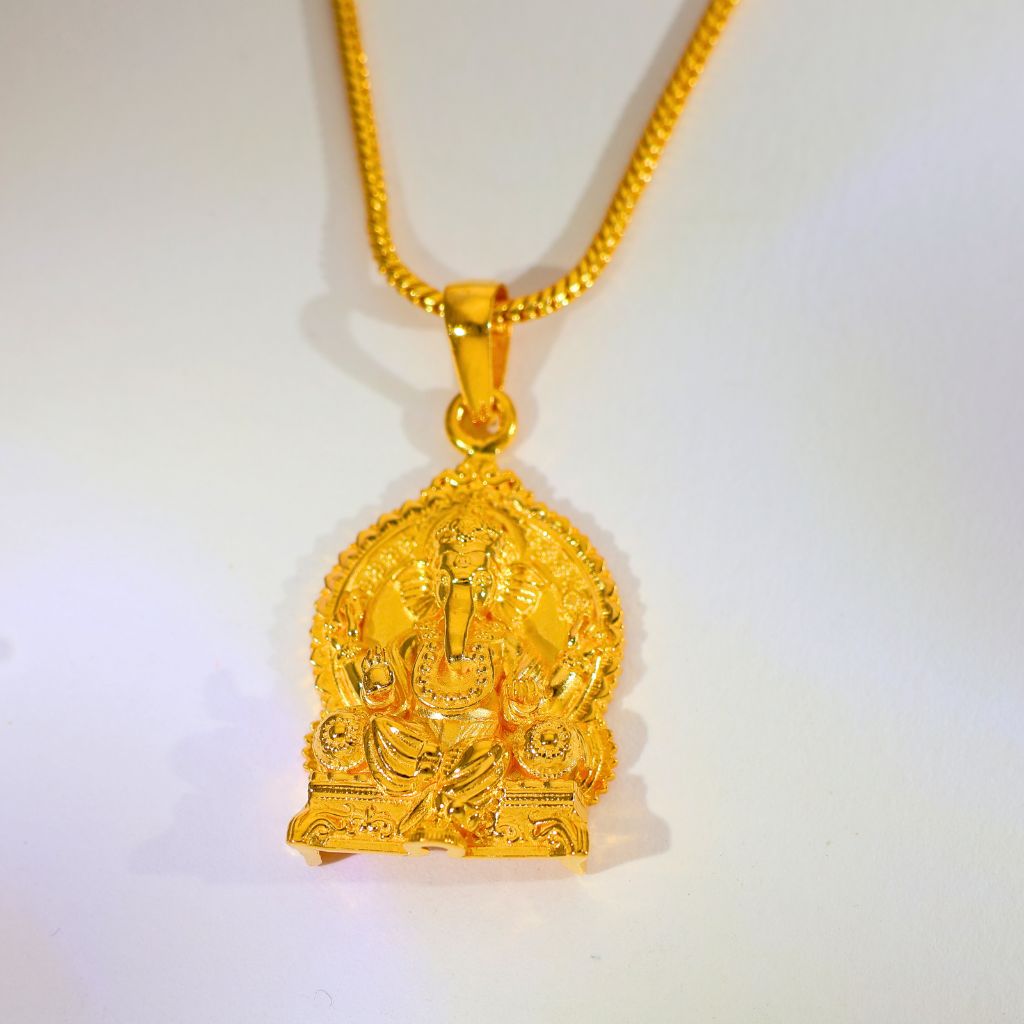 Design: Crafted with intricate detailing, the pendant features Lord Ganesha seated on a decorative throne with traditional carvings and a radiant polished gold finish.