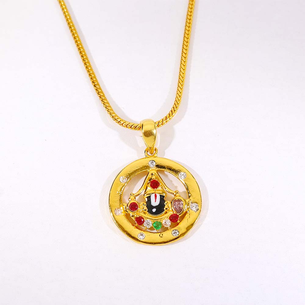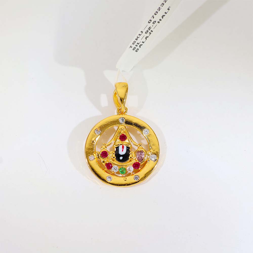 A polished gold circular pendant featuring a Shivling centerpiece decorated with colorful stones and surrounded by a halo of sparkling crystals.