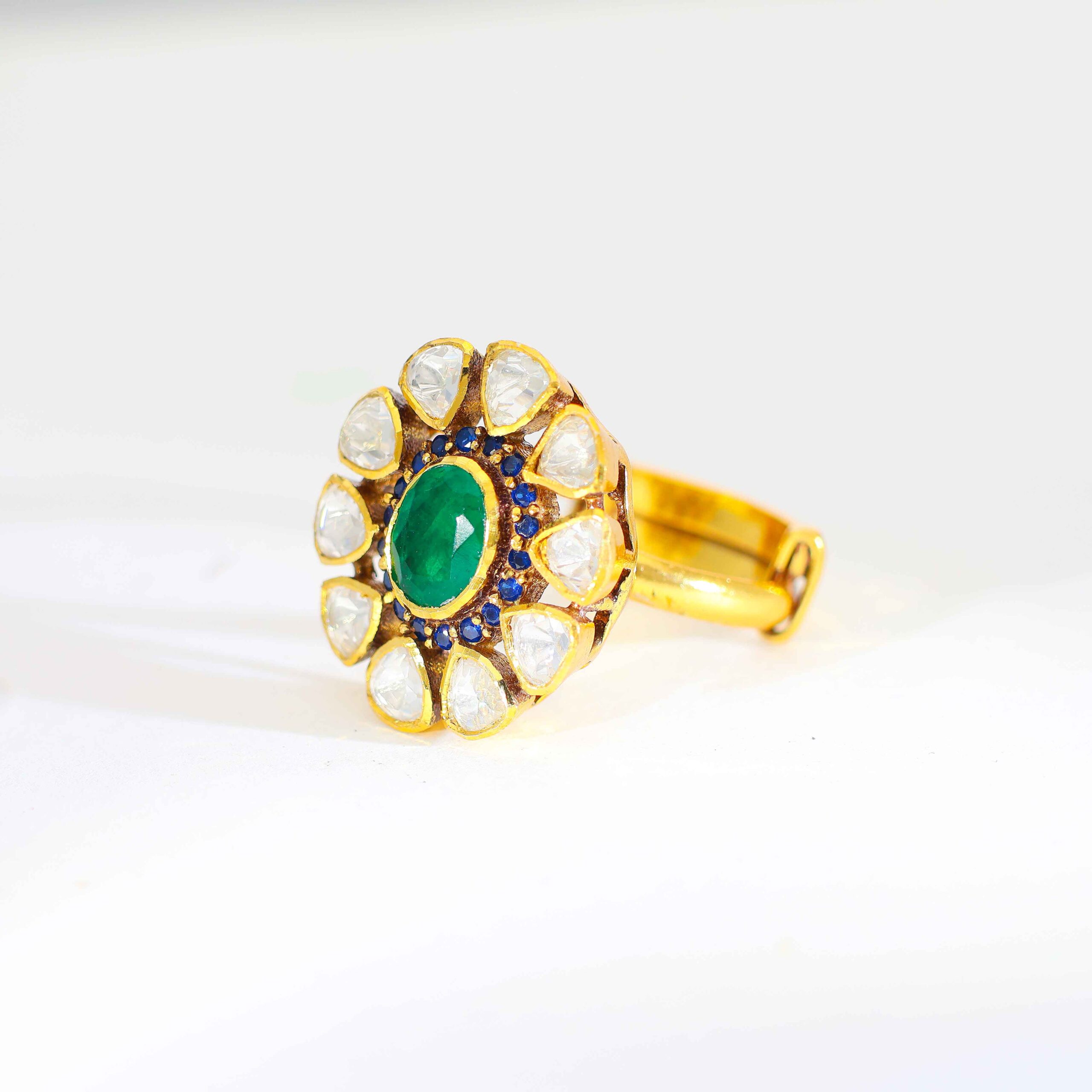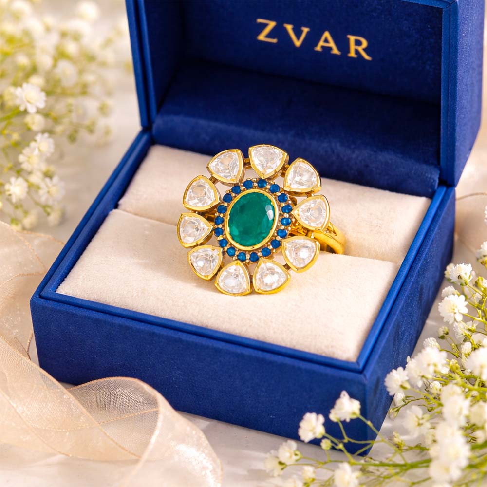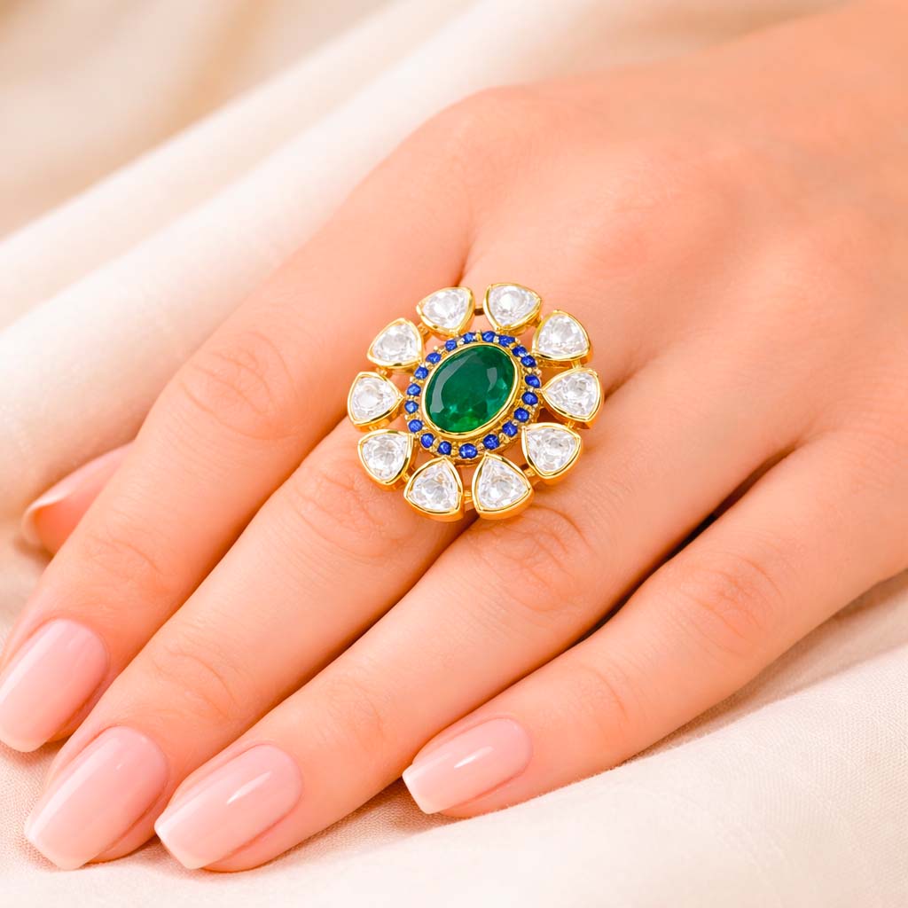A polished gold ring with a green center stone, surrounded by petal-shaped Kundan stones and blue detailing for a rich look.