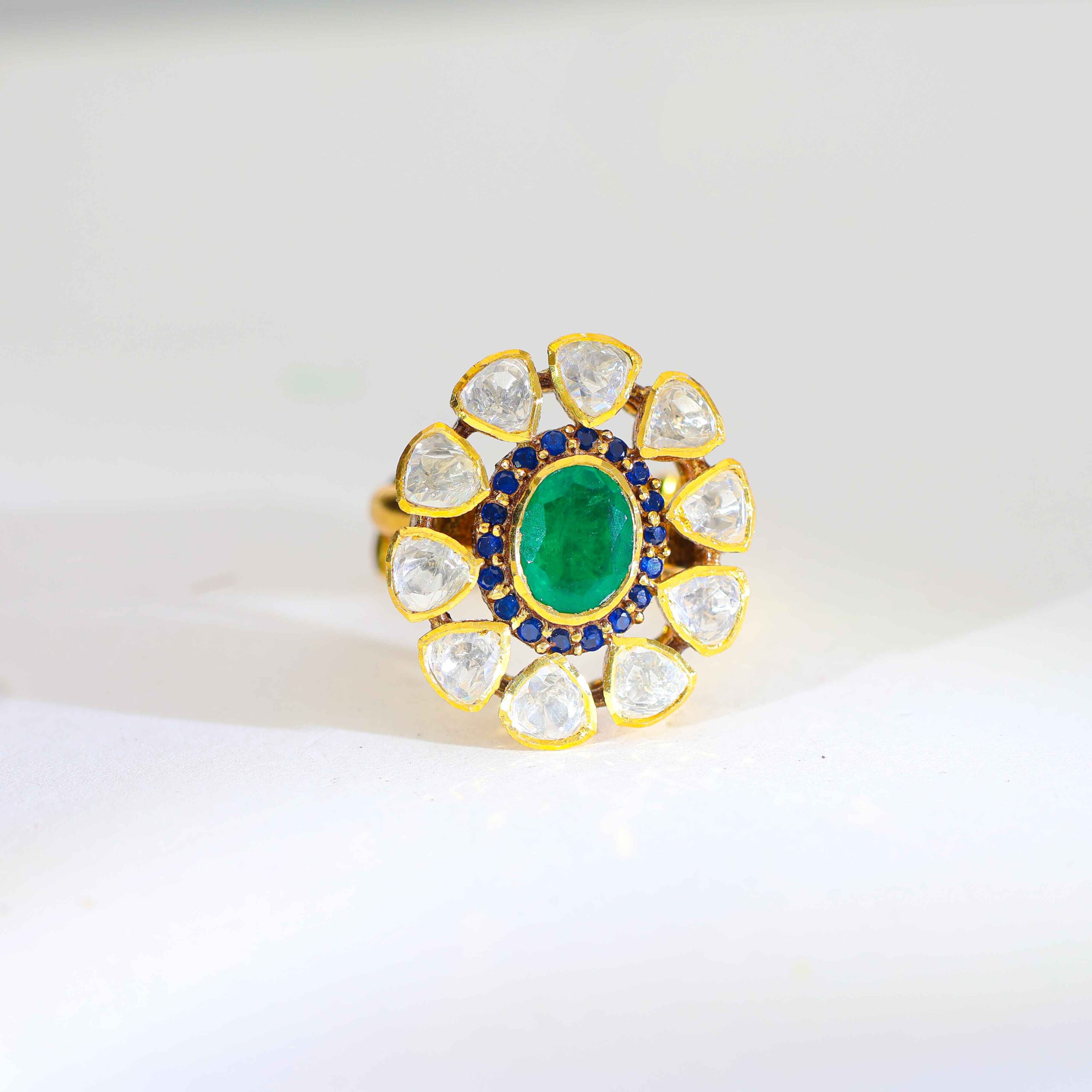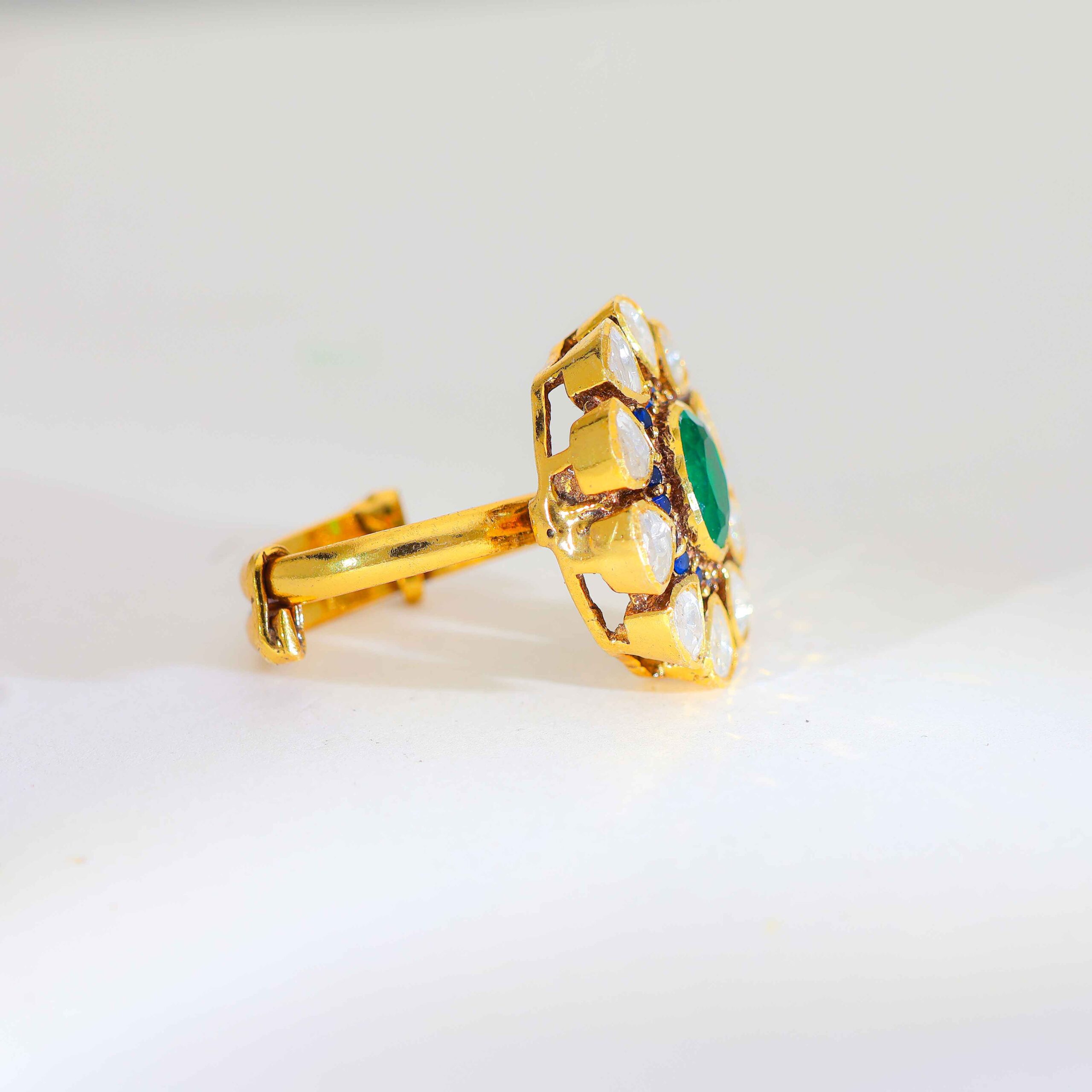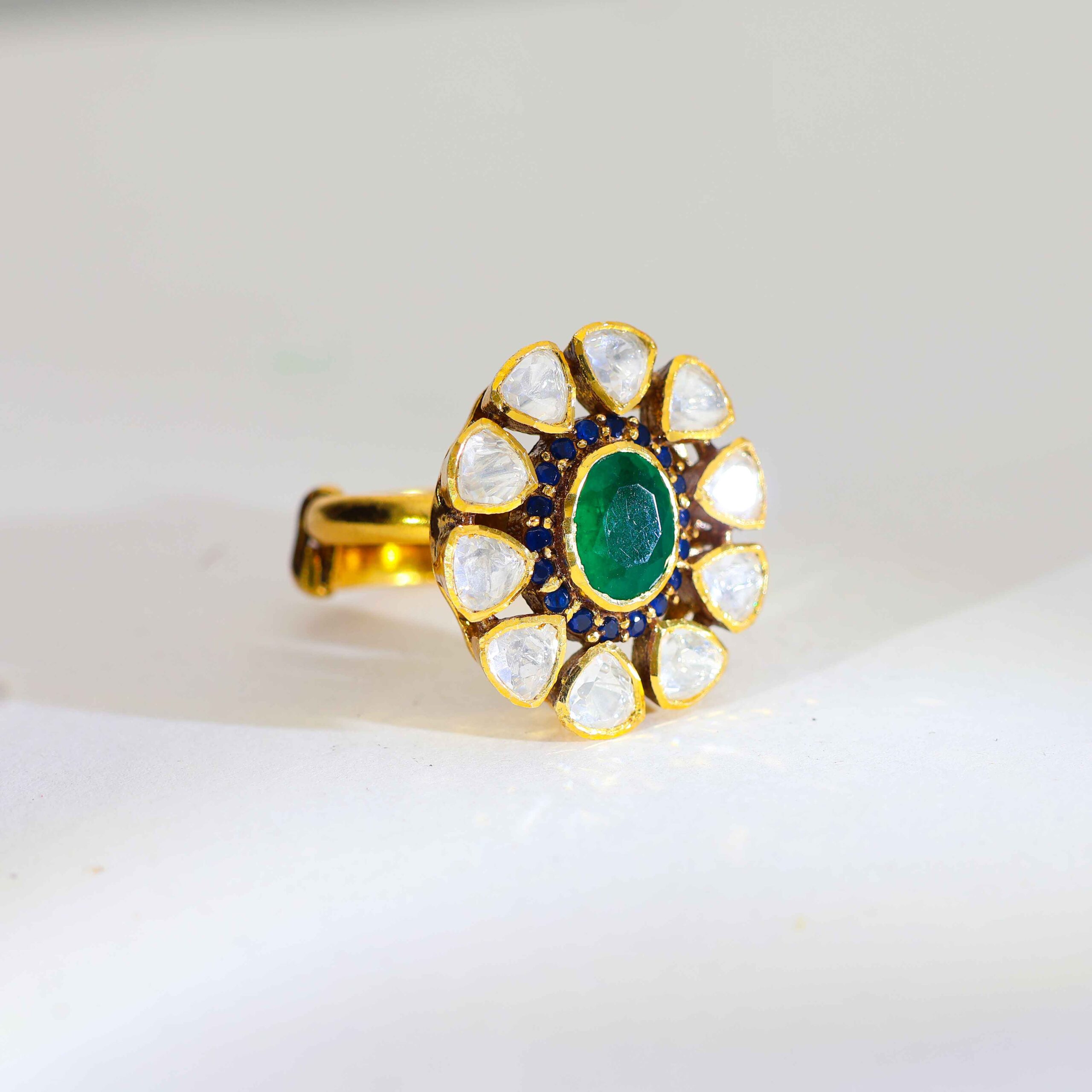 A polished gold ring with a green center stone, surrounded by petal-shaped Kundan stones and blue detailing for a rich look.