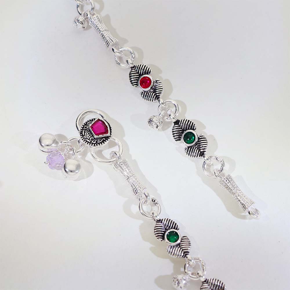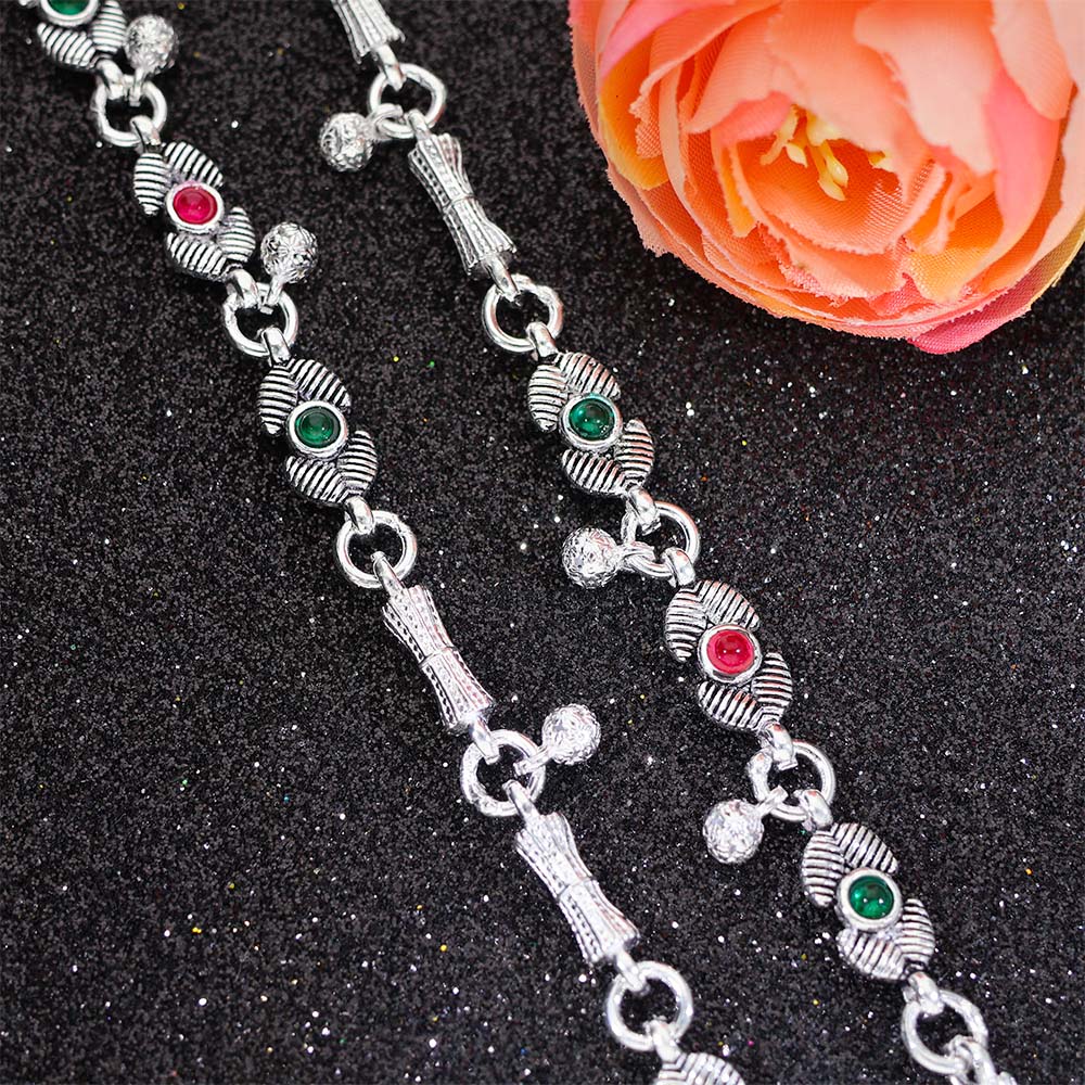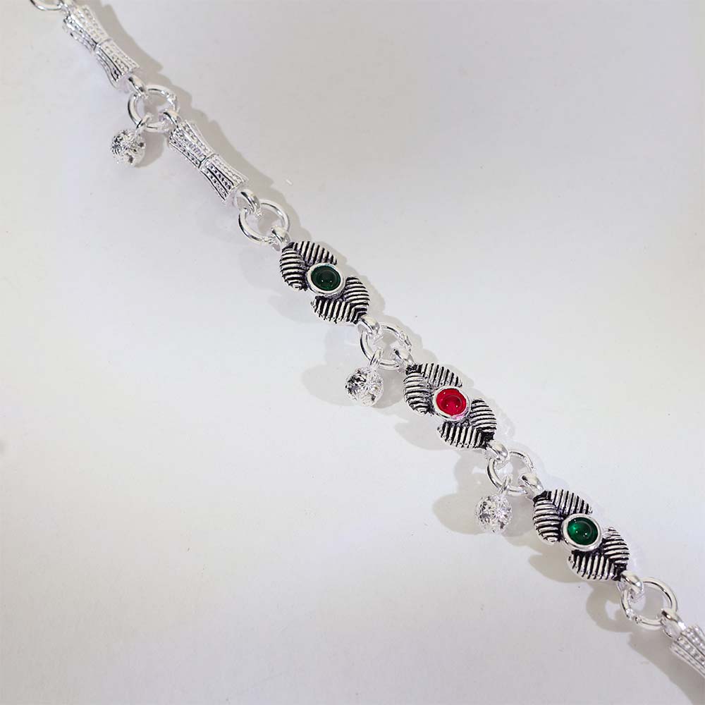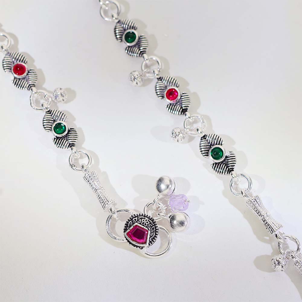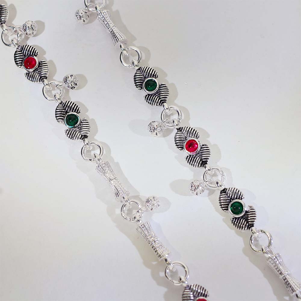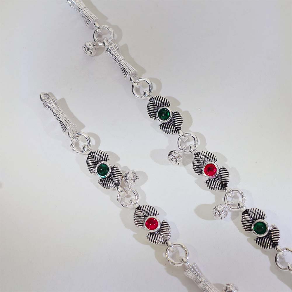 Traditional silver anklets designed with textured leaf motifs and colorful stone details.