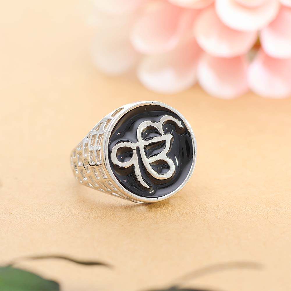 Design: Made in 92.5 sterling silver, the ring has a smooth round top filled with black enamel and a clean silver Ek Onkar symbol. The sides show neat stripes that fade softly towards the back, giving a balanced and easy-fit design.