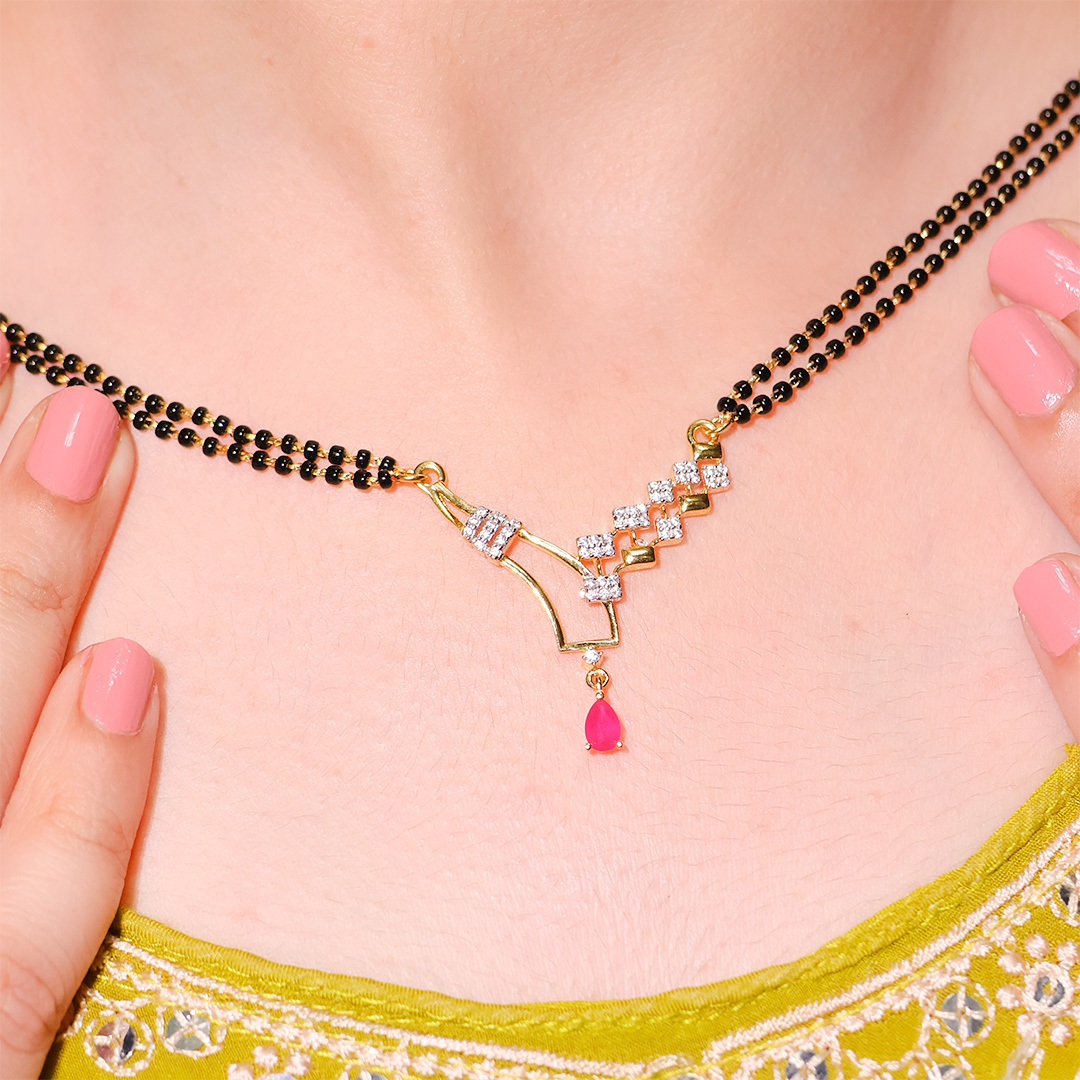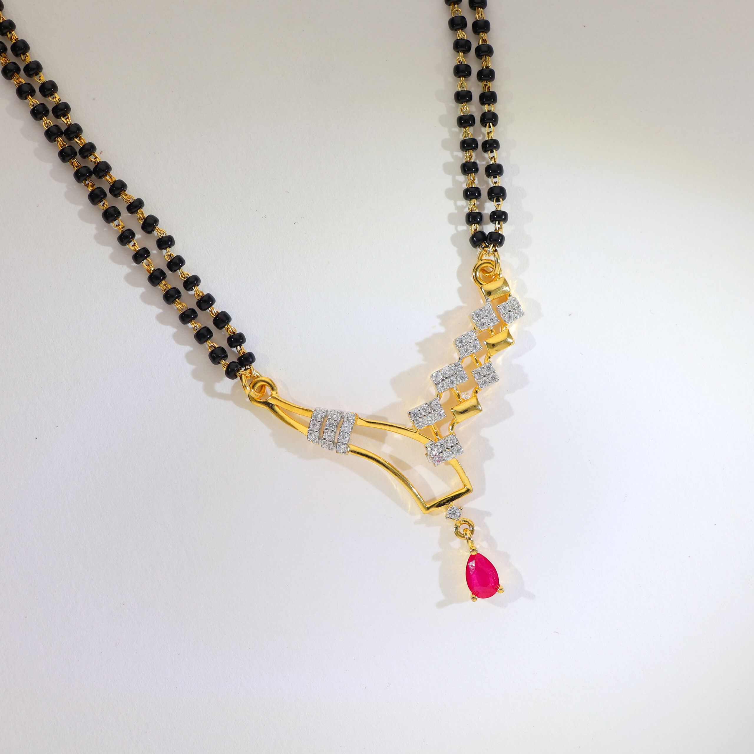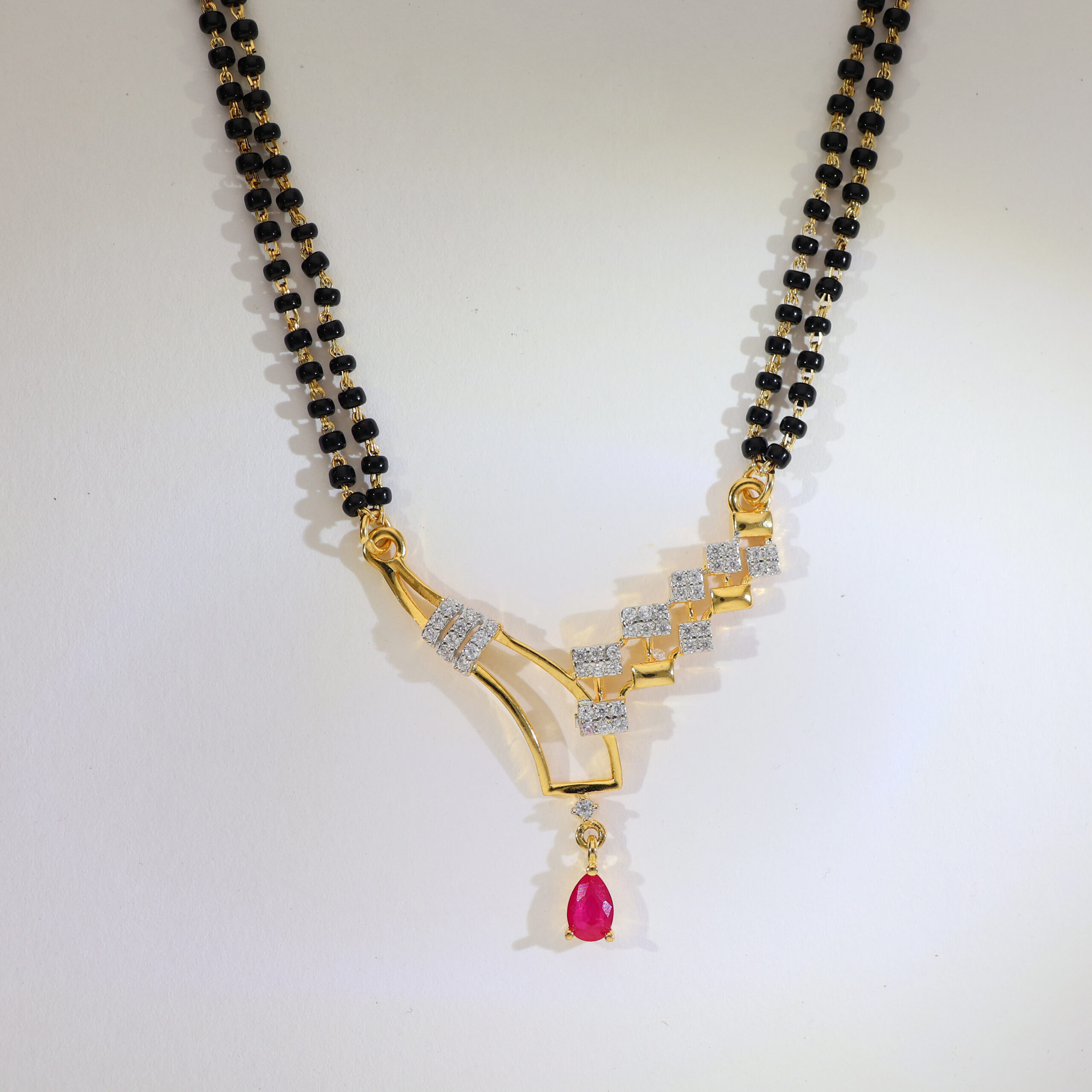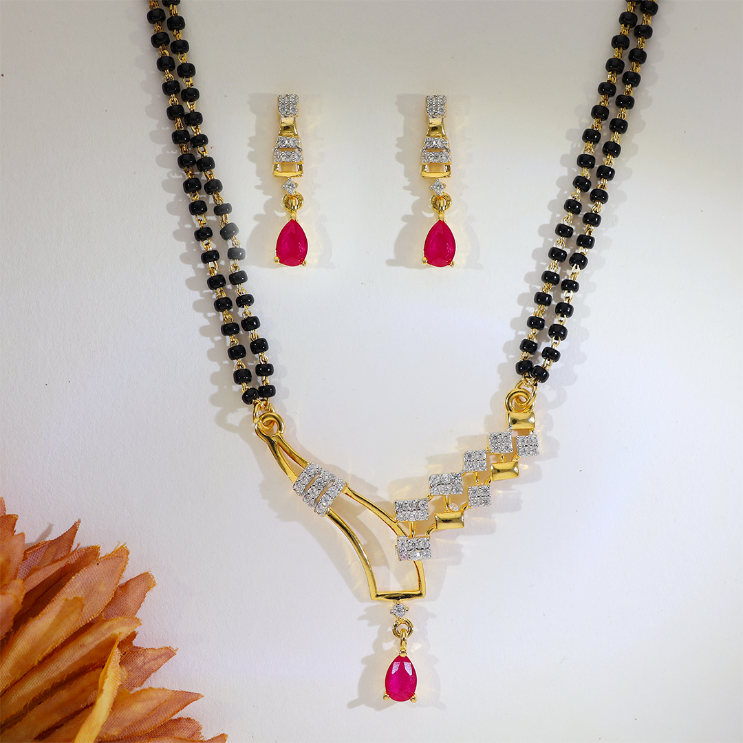 Design: A curved V pendant with CZ squares leading to a ruby-pink teardrop; paired with easy drop earrings, all on a double-line black bead chain.