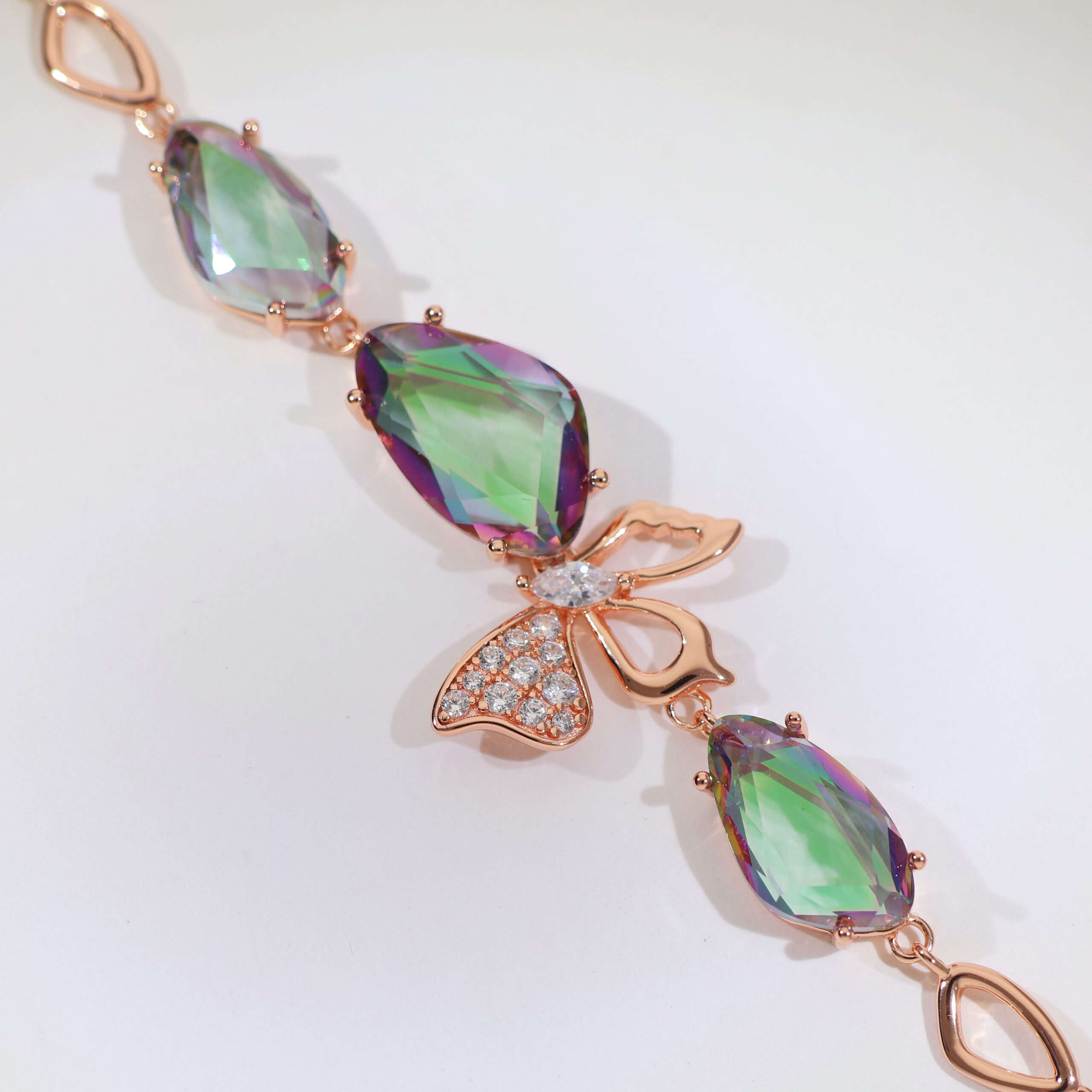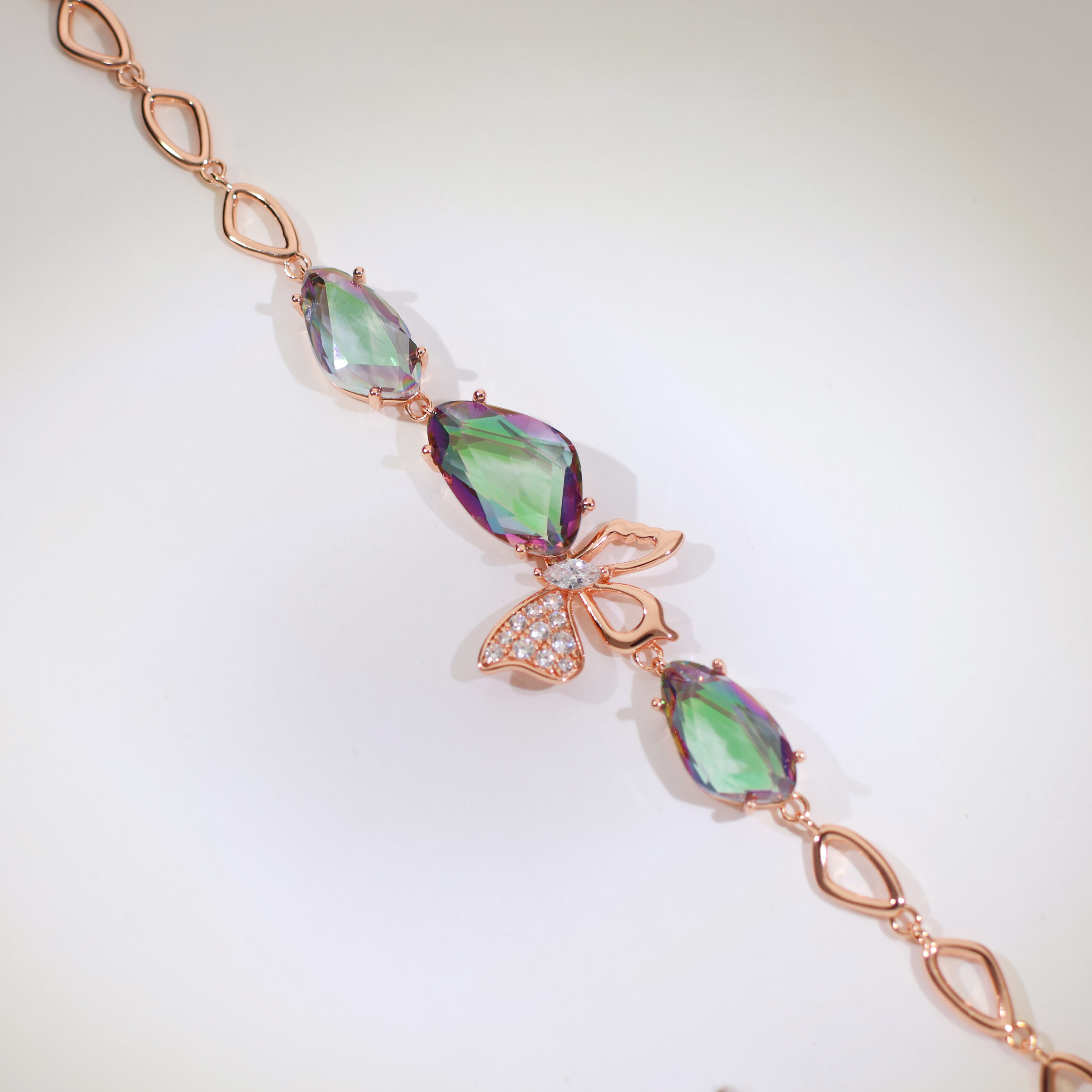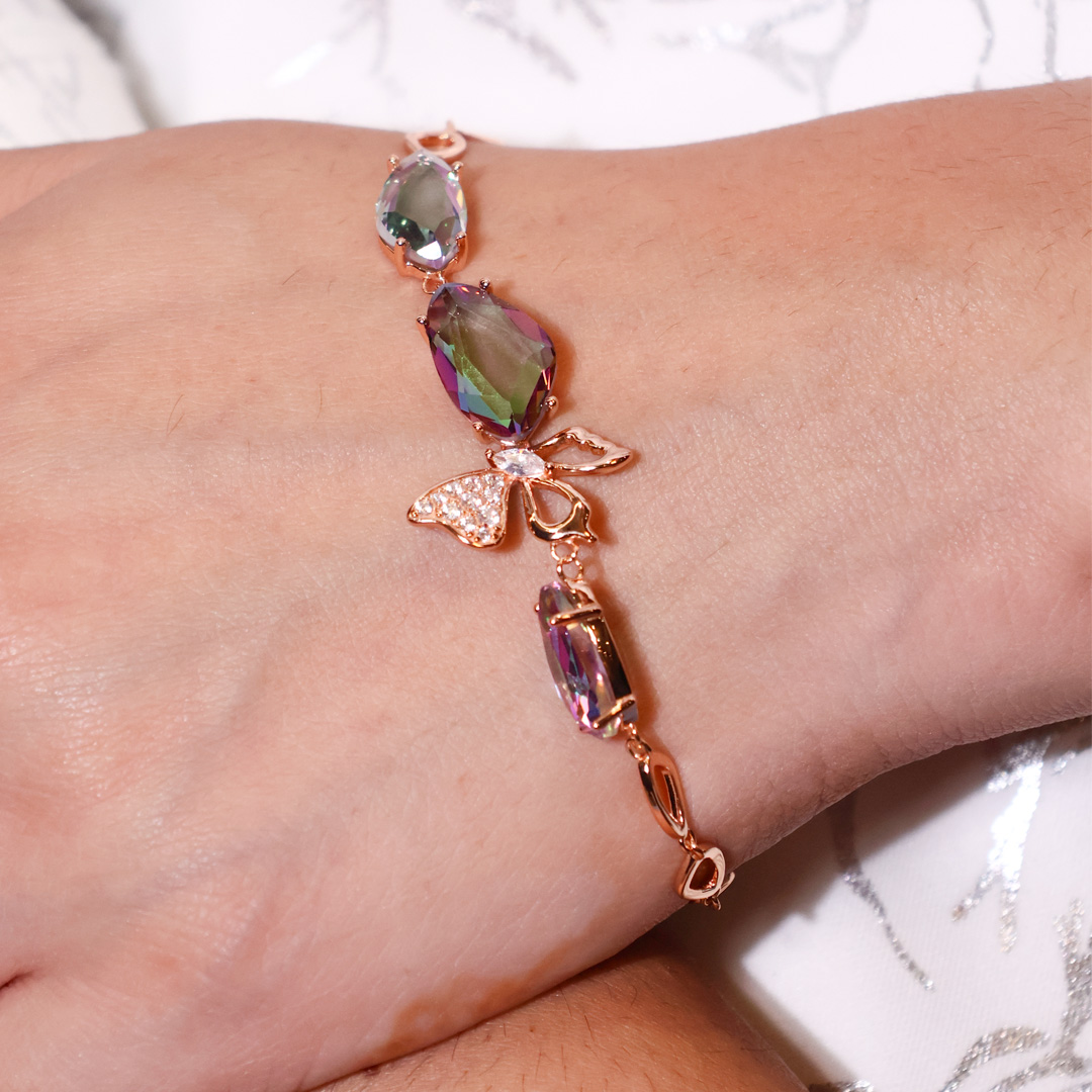 Crafted with multi-color iridescent stones and a butterfly centerpiece, this rosegold bracelet dances with light and wonder.