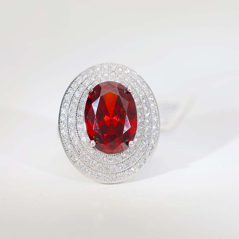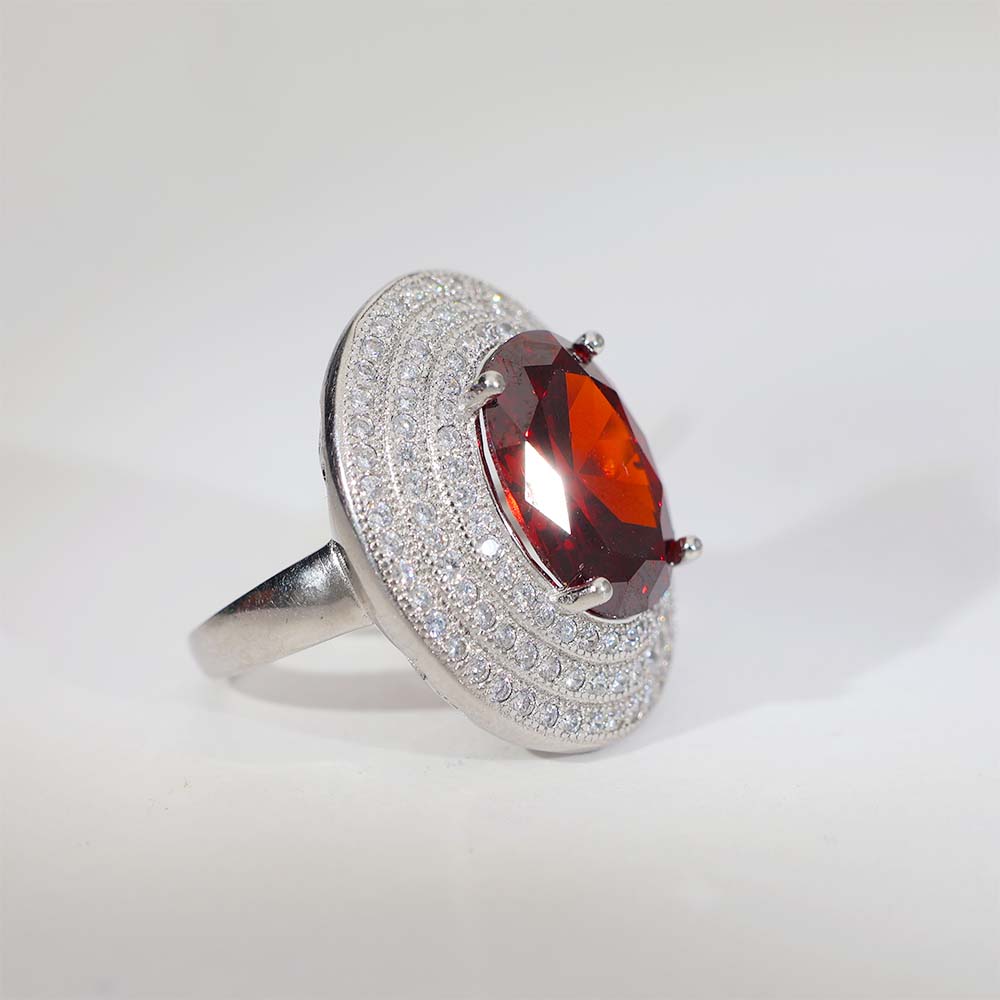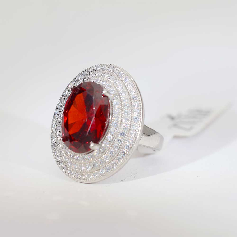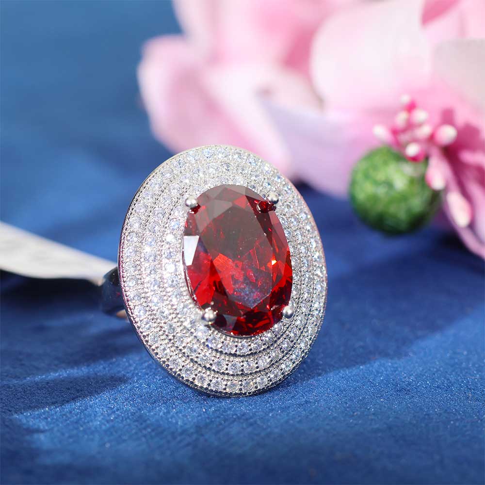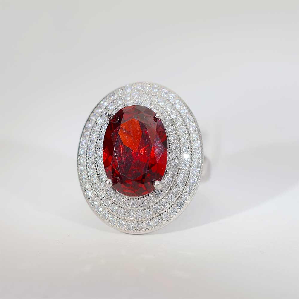 Design: A bright red center gem sits proudly on a silver band, with crystal-clear side stones adding depth and elegance.