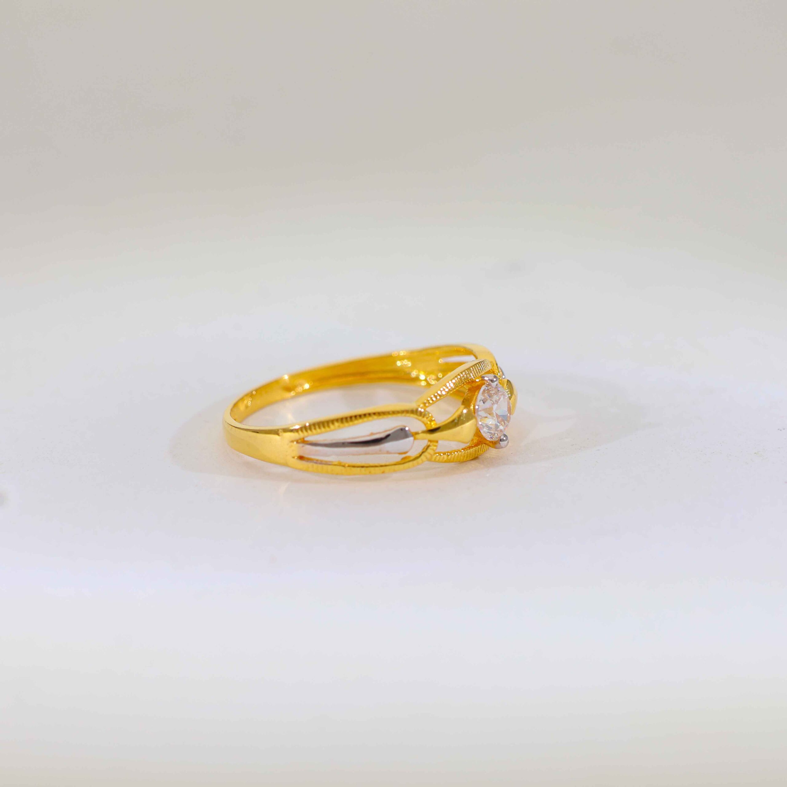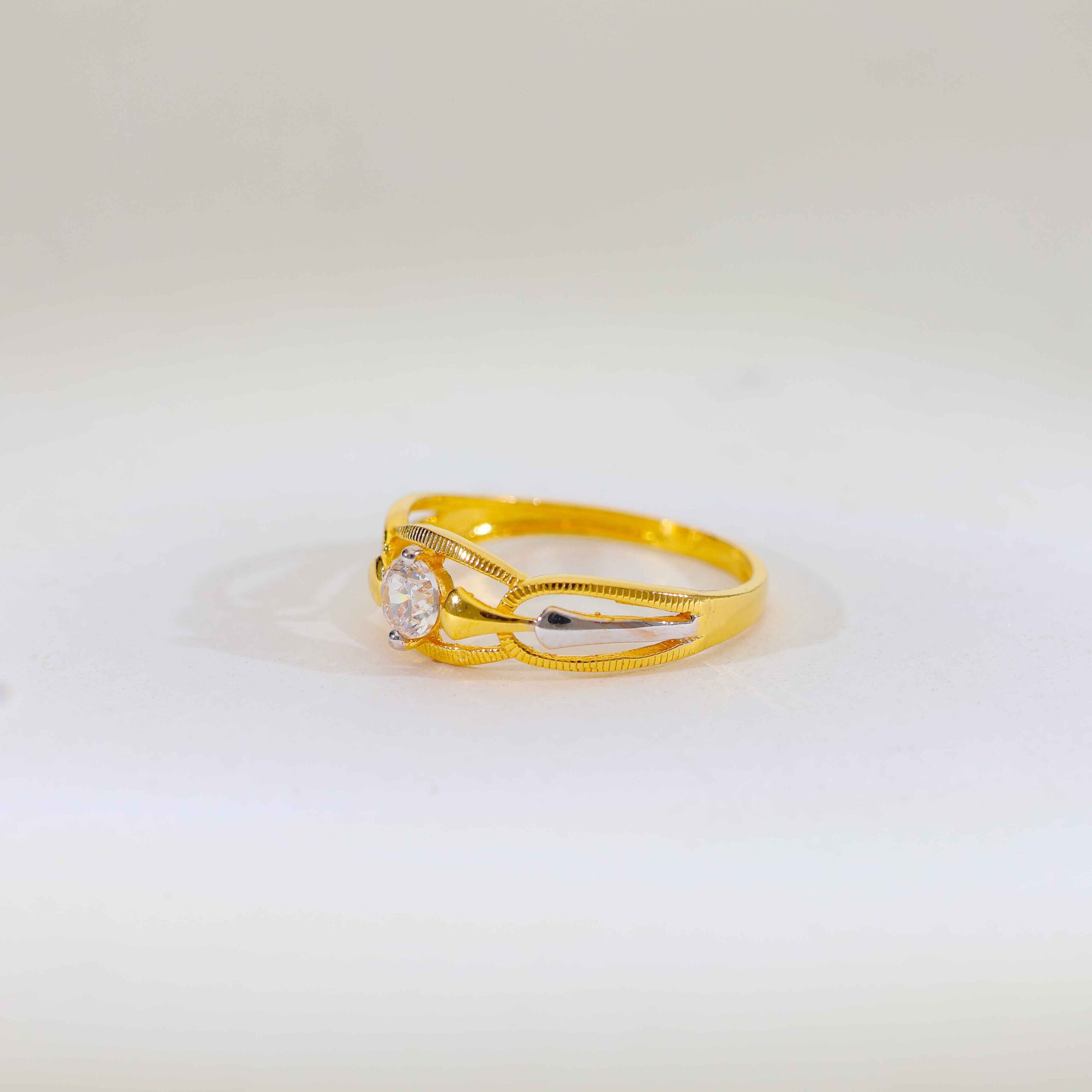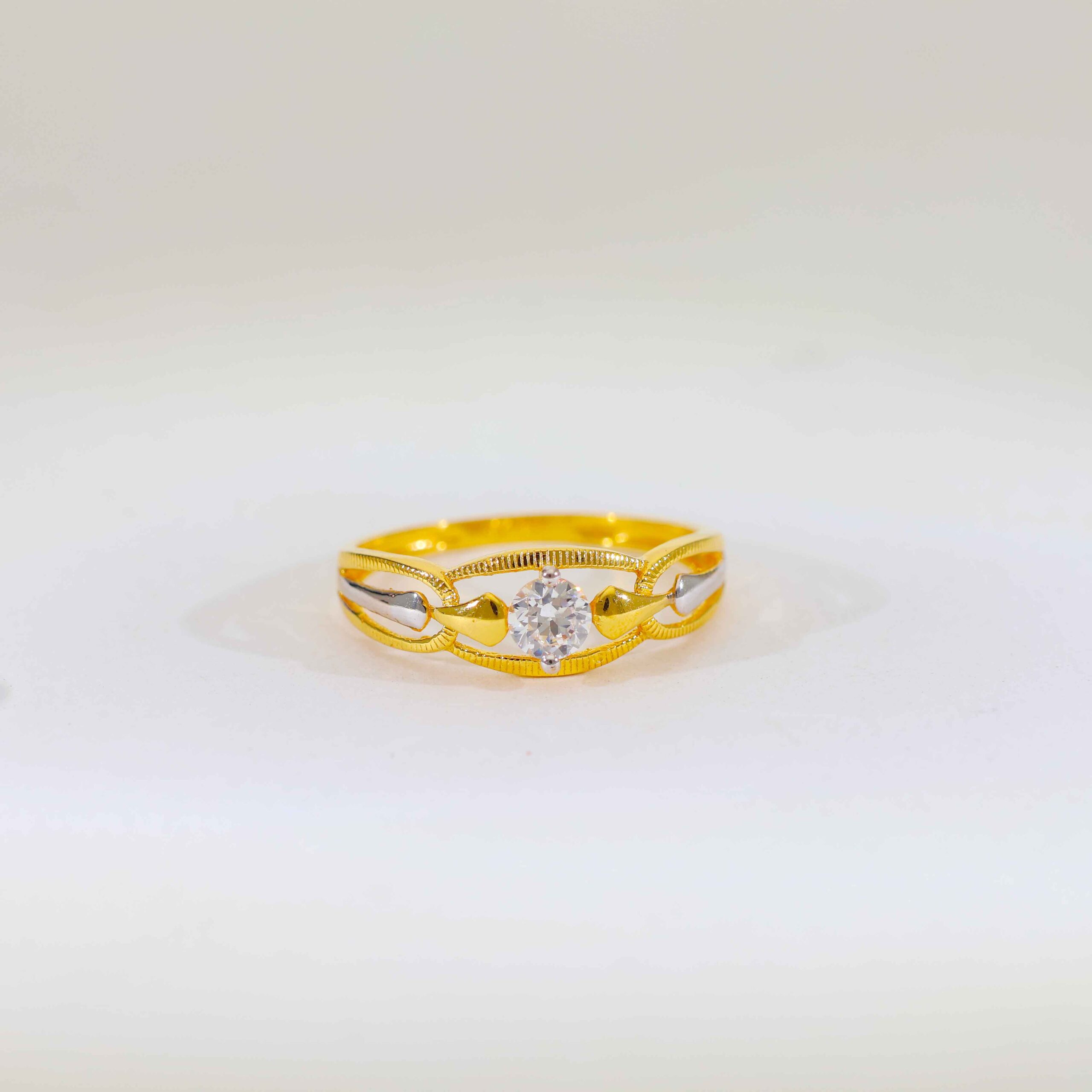 A stunning 22kt gold ring designed with an elegant chain-link inspired pattern that flows seamlessly around a brilliant solitaire centerpiece. The dual-tone detailing adds depth and contrast, while the intricate edges give the ring a refined, premium finish.