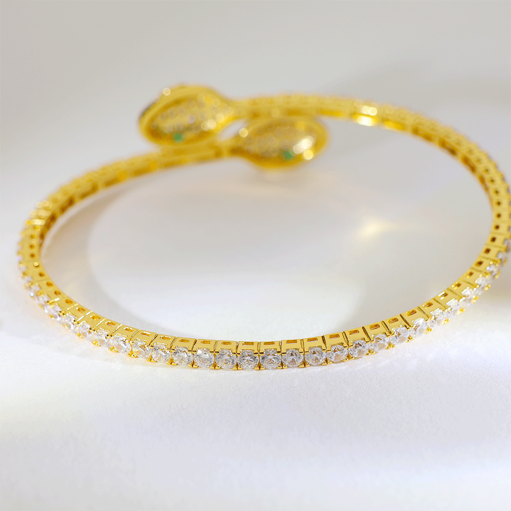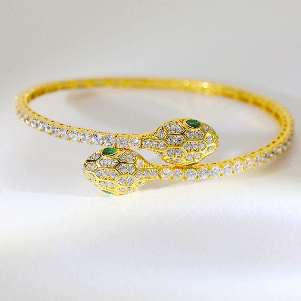 Design: A luxury open kadha featuring twin snake heads with green stone eyes and full stone detailing for a bold and elegant look.