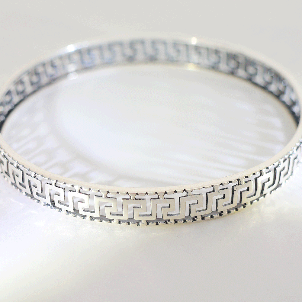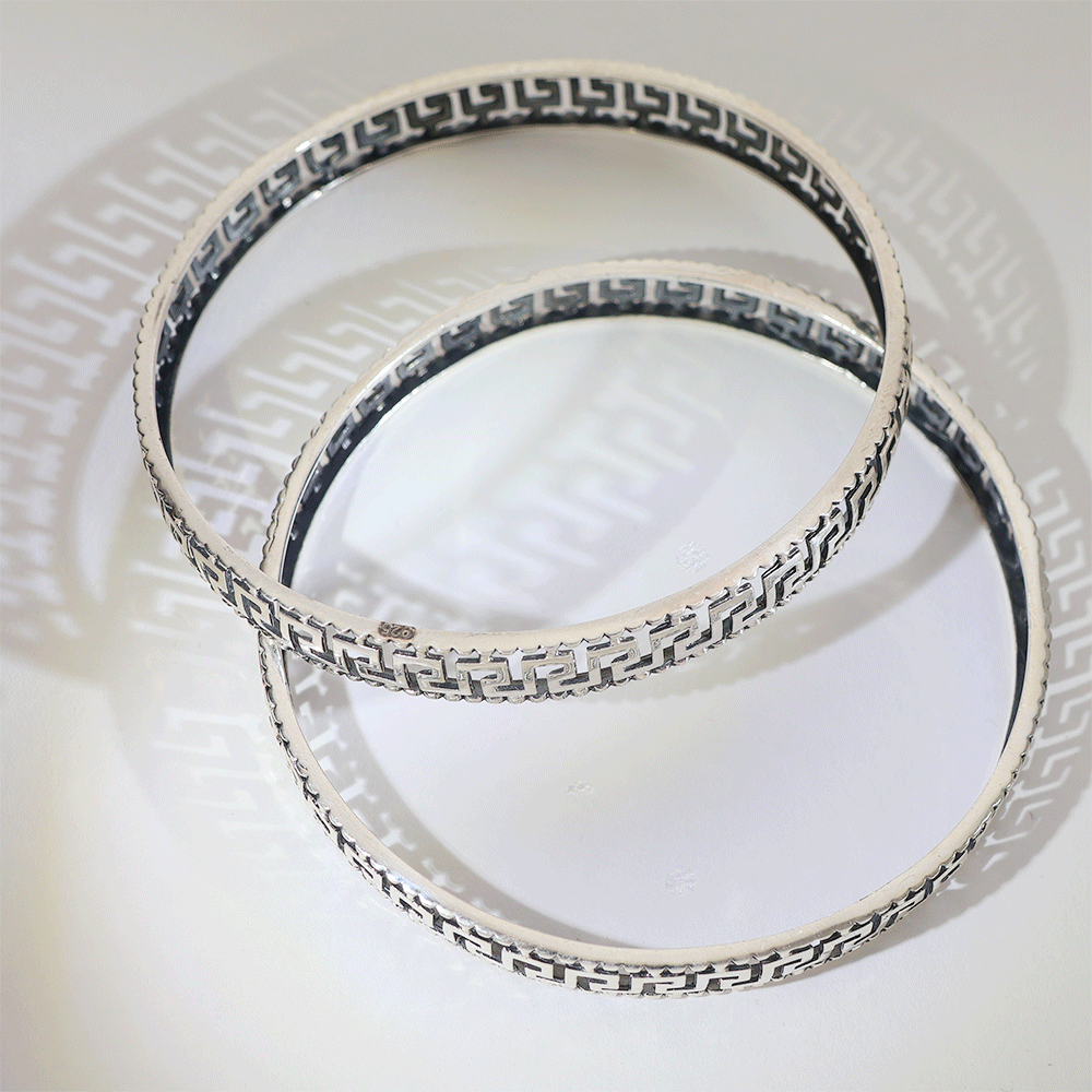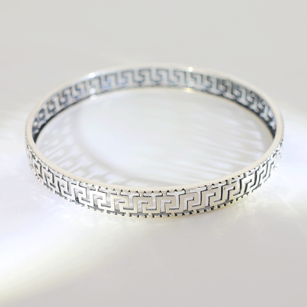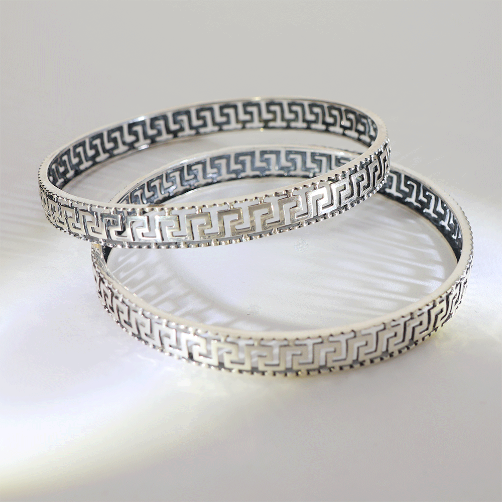 A premium pair of silver BANGLES featuring a bold Greek key pattern, designed for a timeless and classy look.