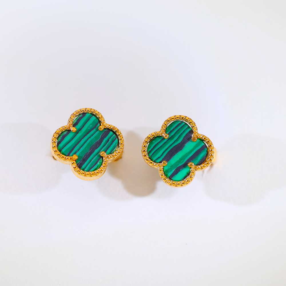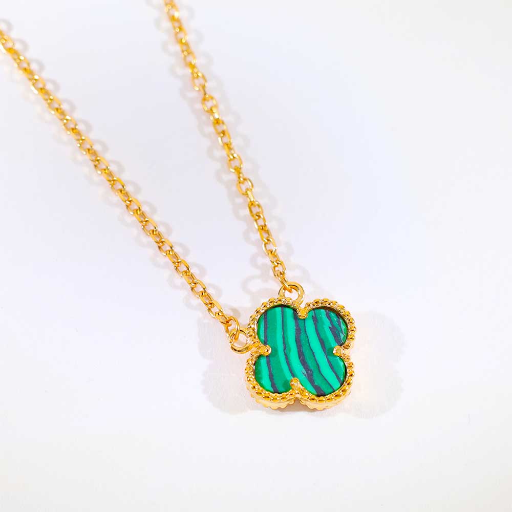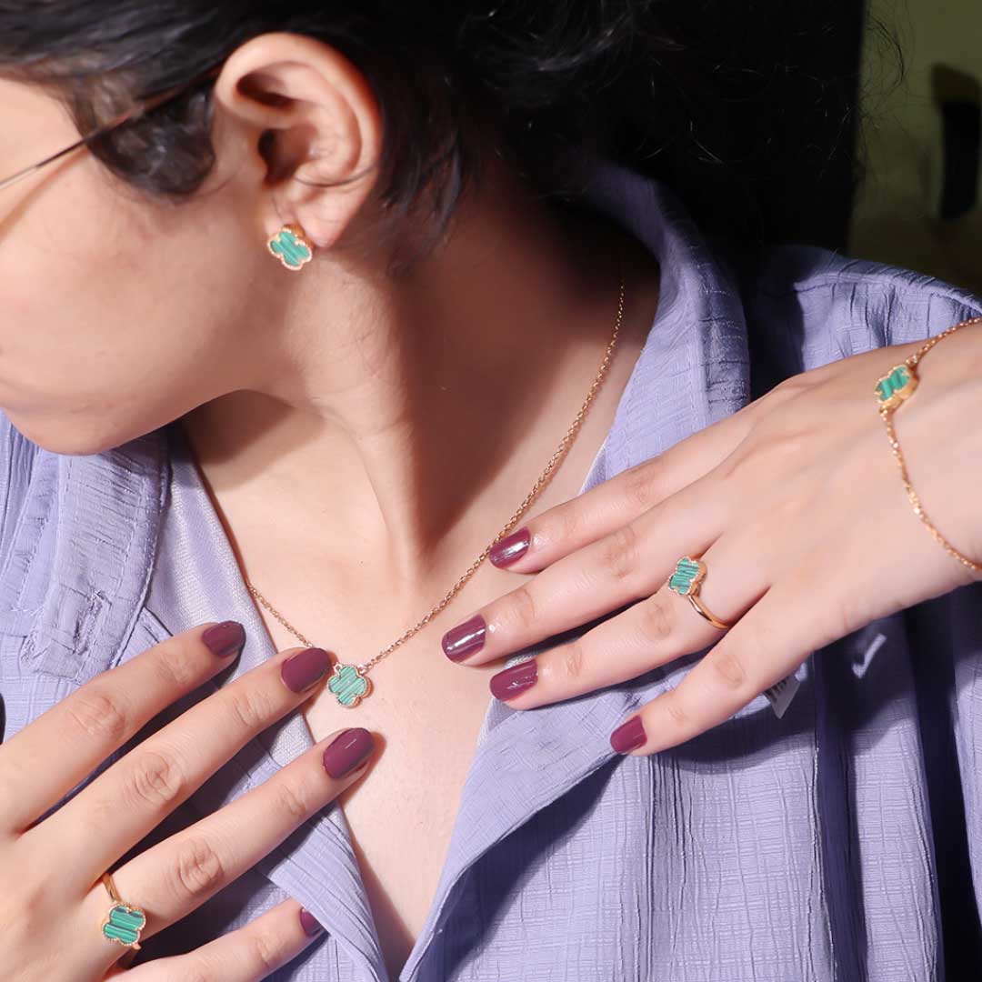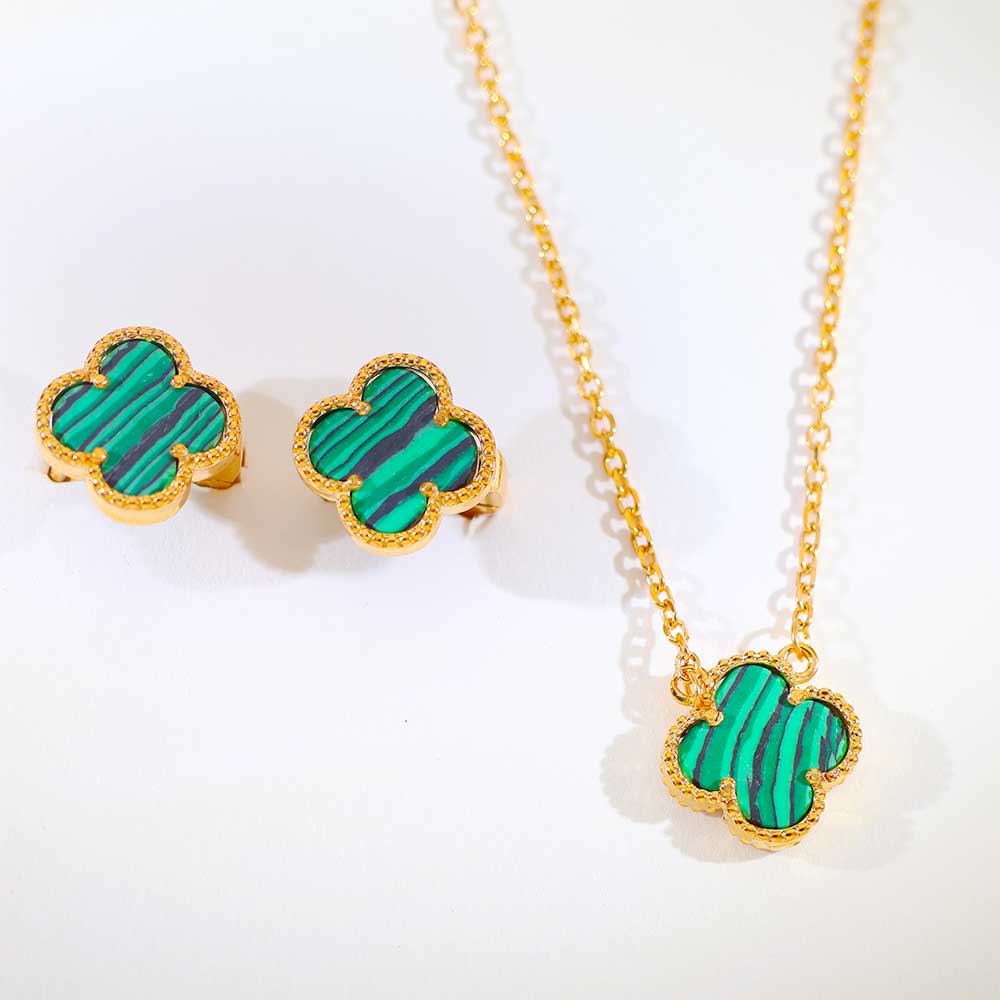 A polished pendant featuring a clover-style flower design in green enamel, paired with matching earrings for a refined jewelry set.