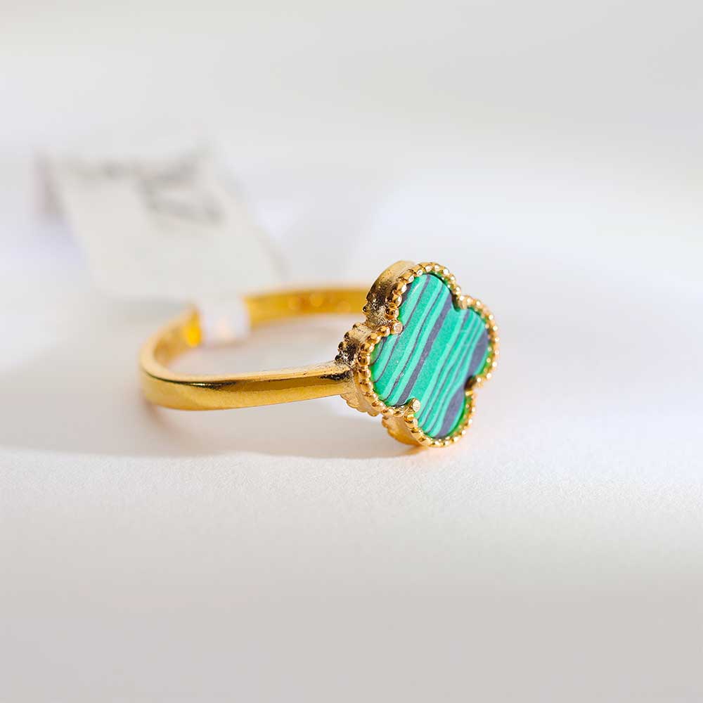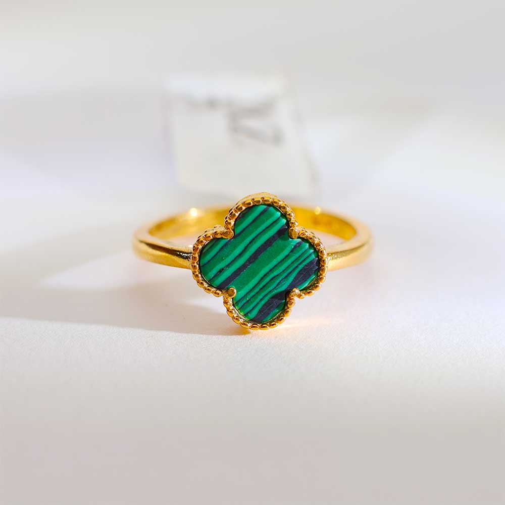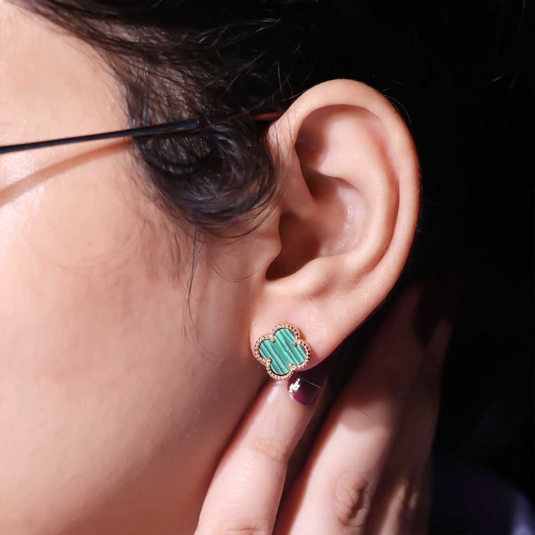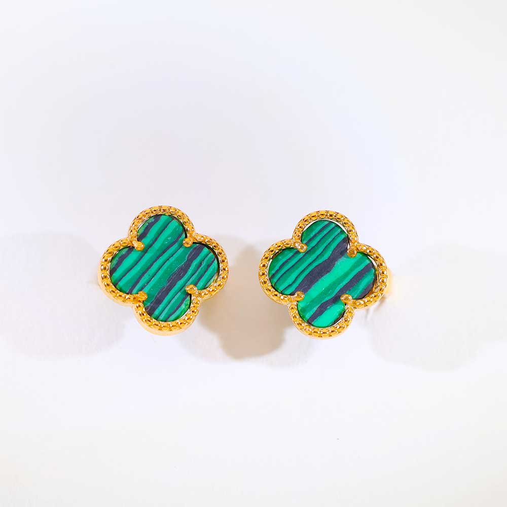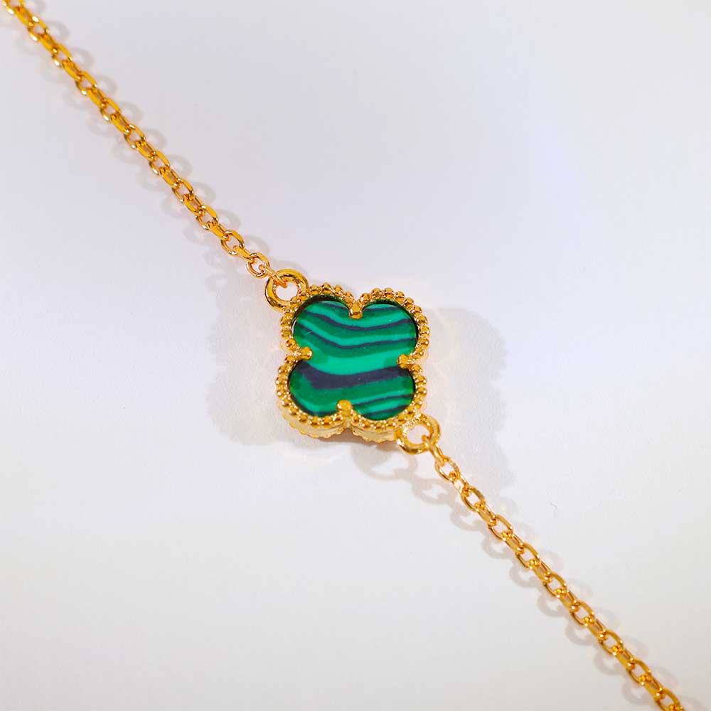 A polished pendant featuring a clover-style flower design in green enamel, paired with matching earrings for a refined jewelry set.