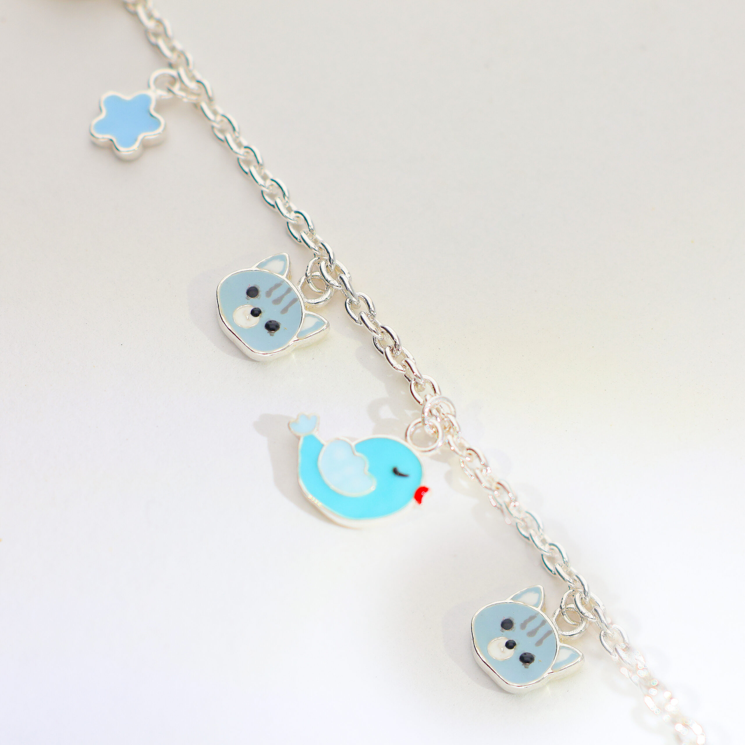 Design: Neat silver chain with two kitty charms and a sweet blue bird charm; pastel tones keep it soft and photo-ready.