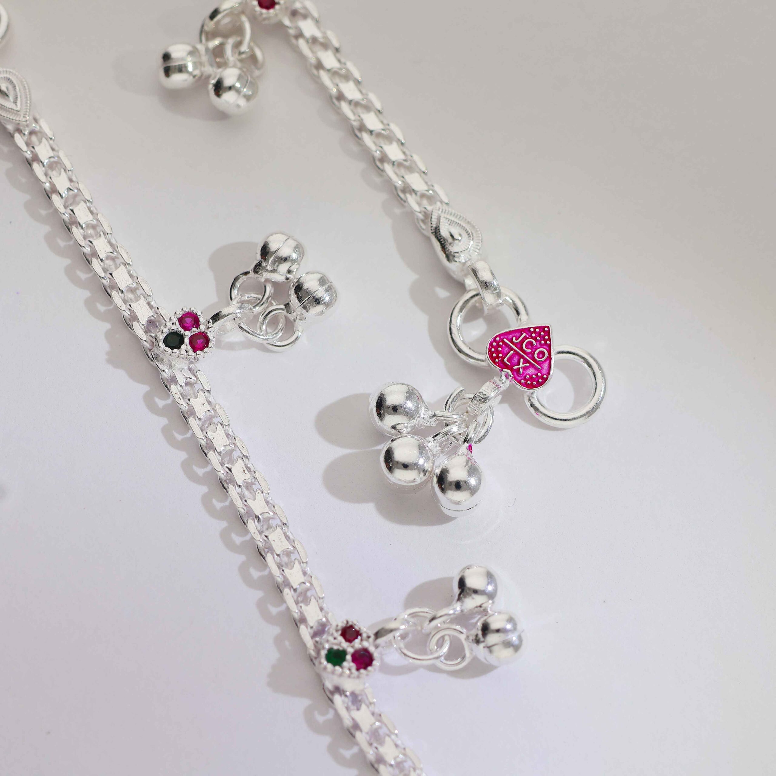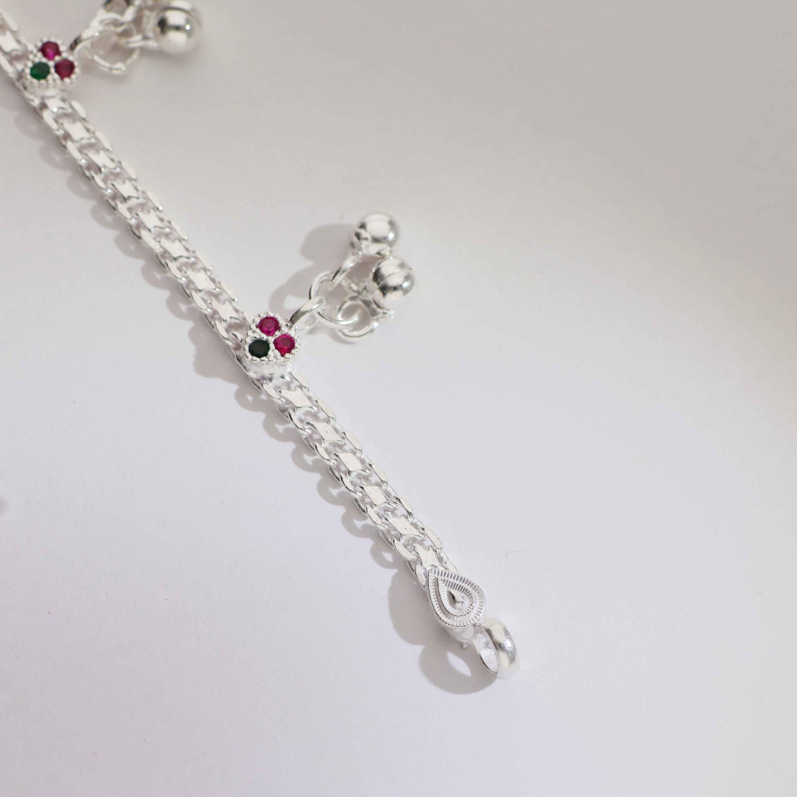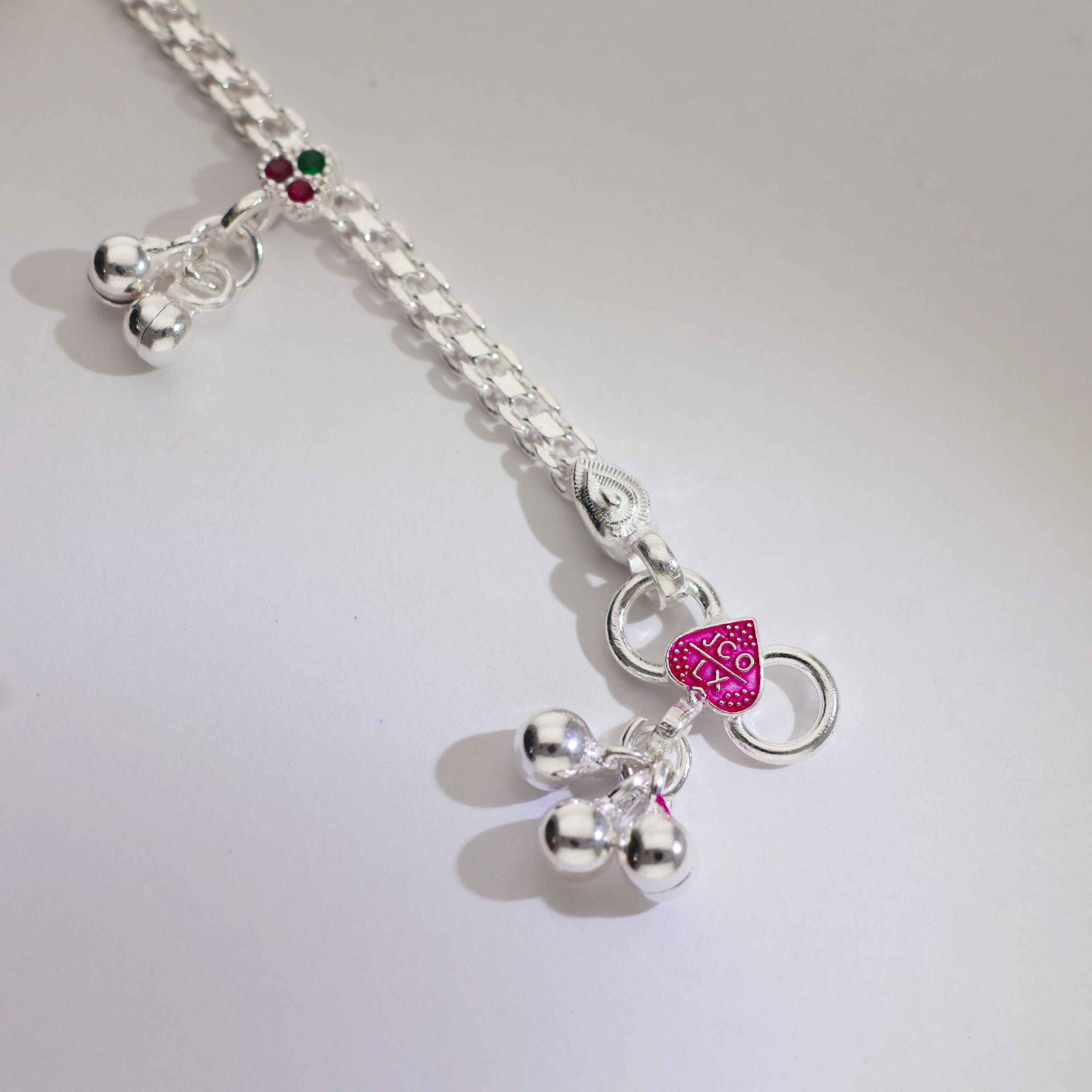 Features a polished silver chain with a floral charm and tiny bell drops for a playful touch.