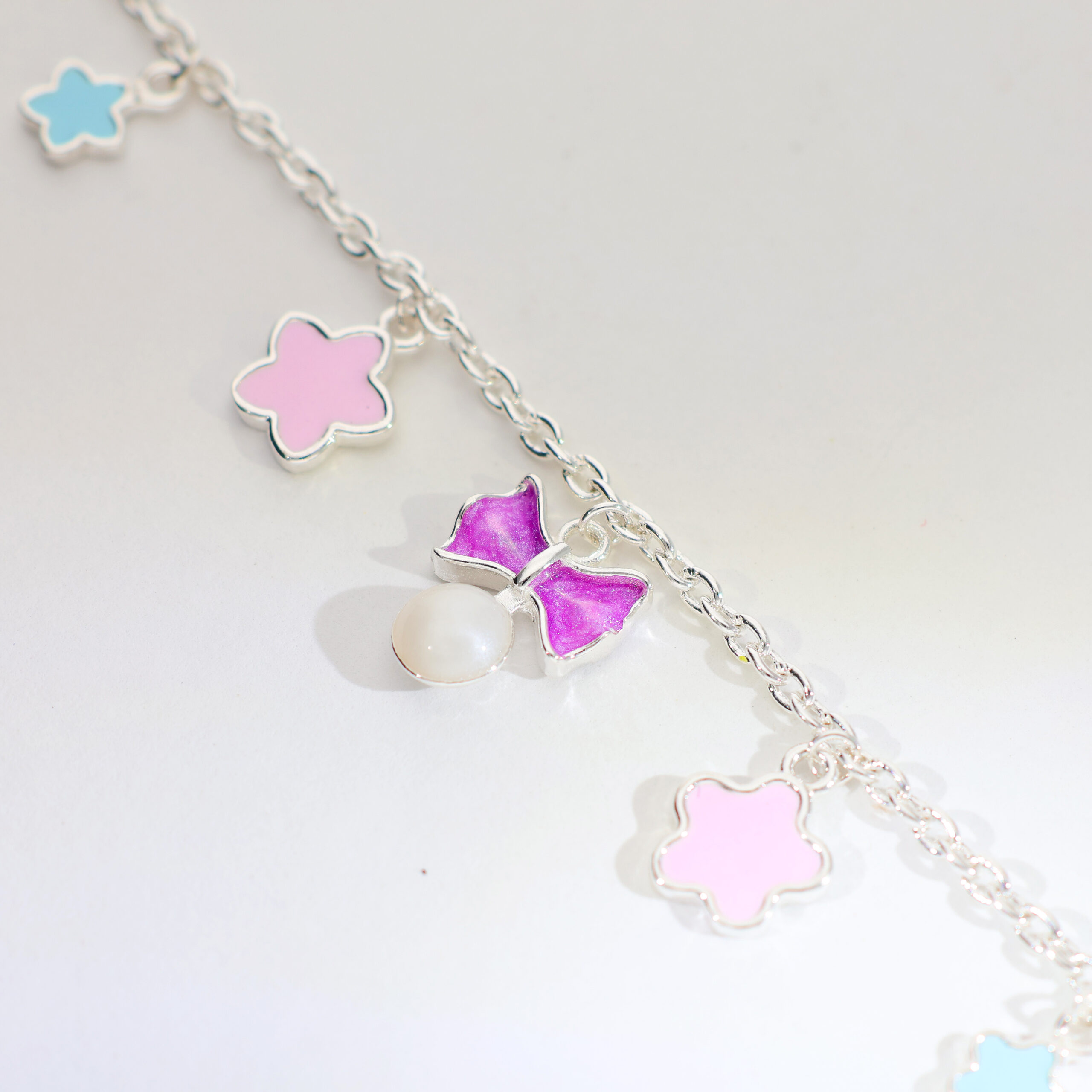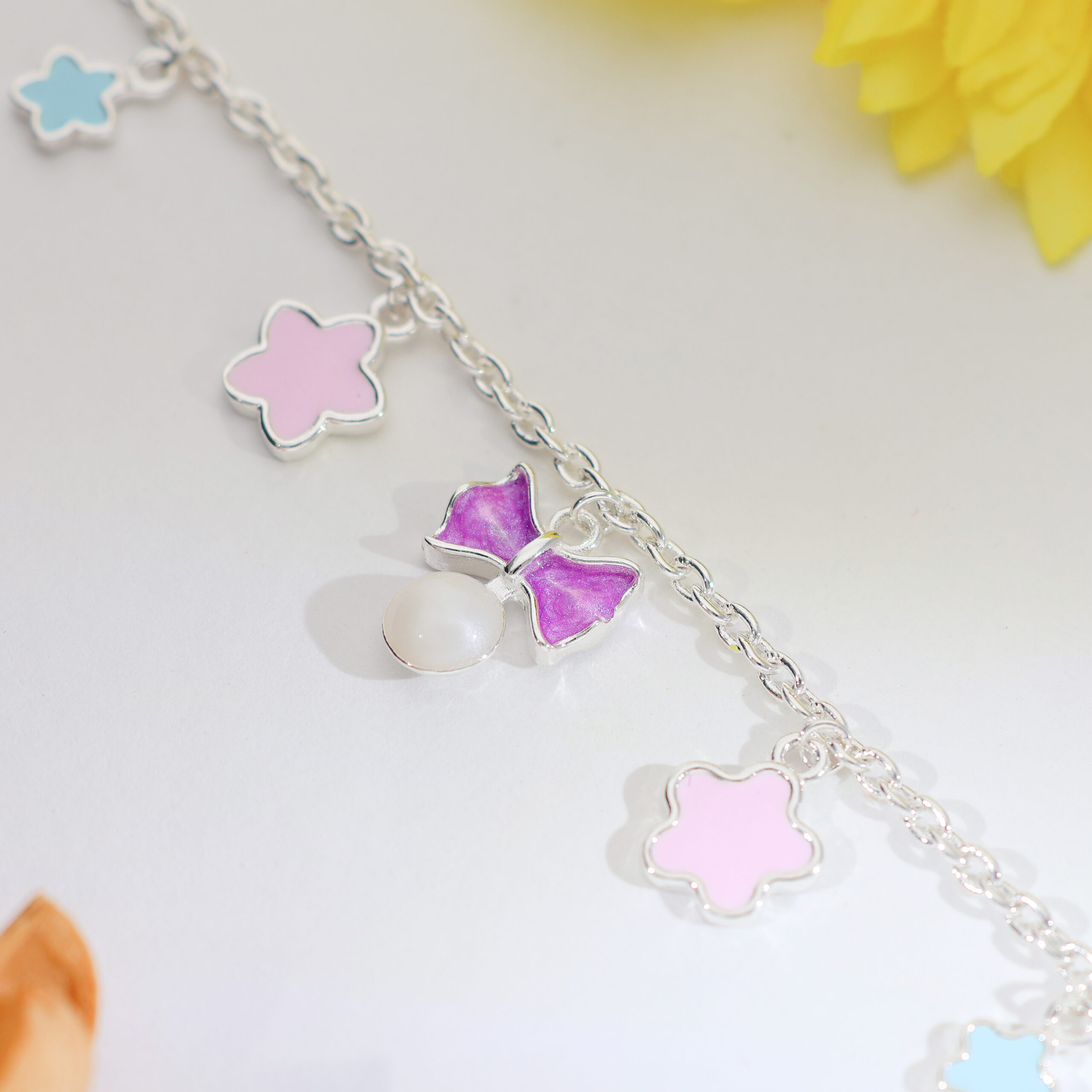Soft-tone baby bracelets with a cute bow-and-pearl charm and tiny flower friends—perfect for photos and play.