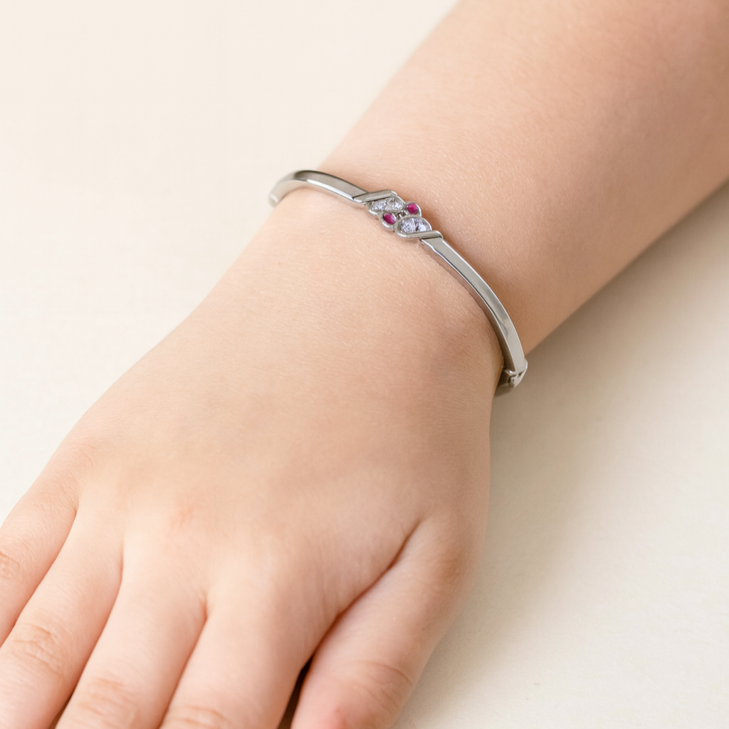 A clean silver band with pretty pink flowers and a touch of sparkle, these are made to grow with your little one.
