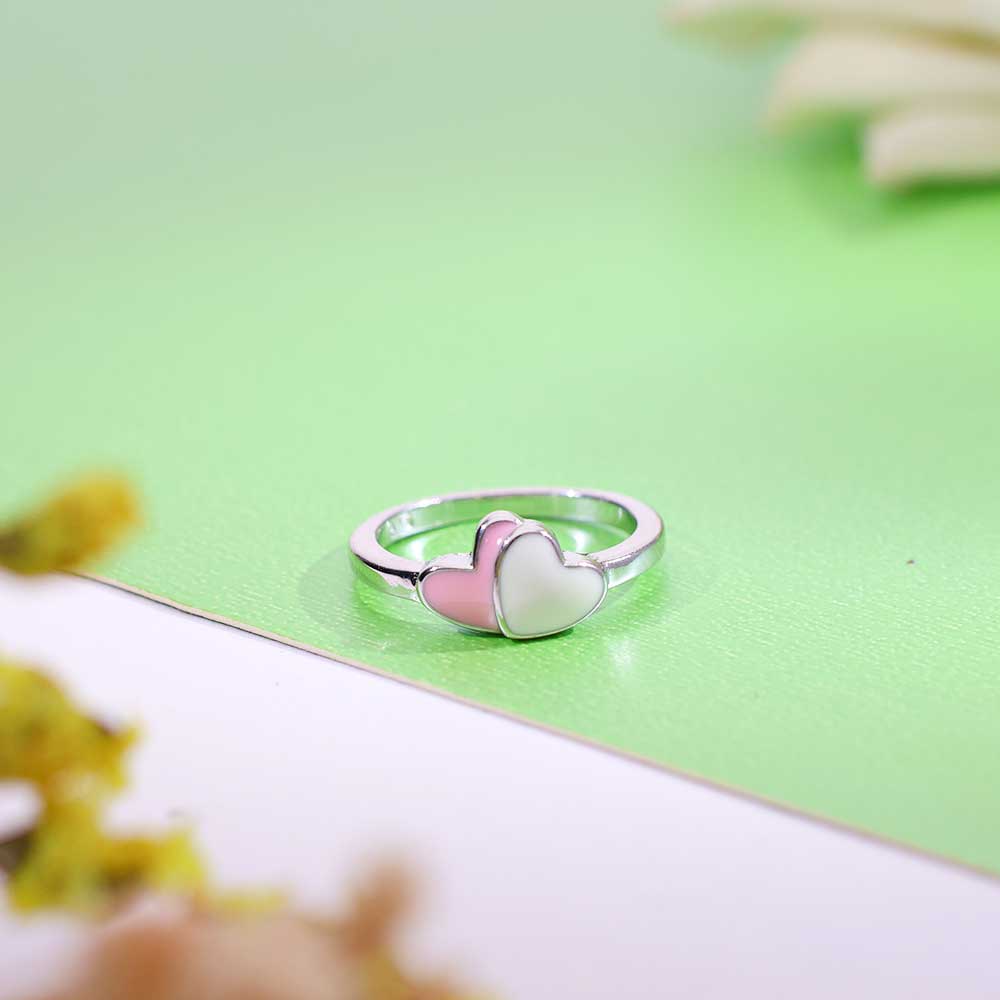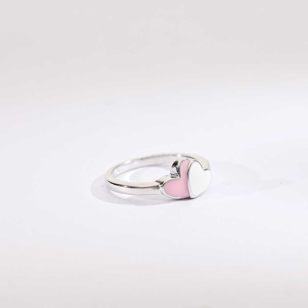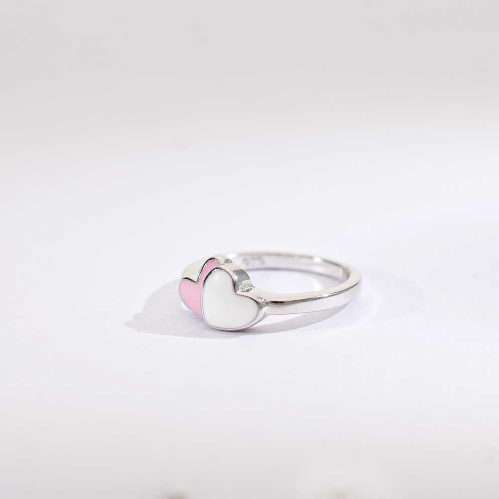Design: Intertwined pastel hearts on a high-shine silver band come together to create a delicate token of your baby’s first keepsake.