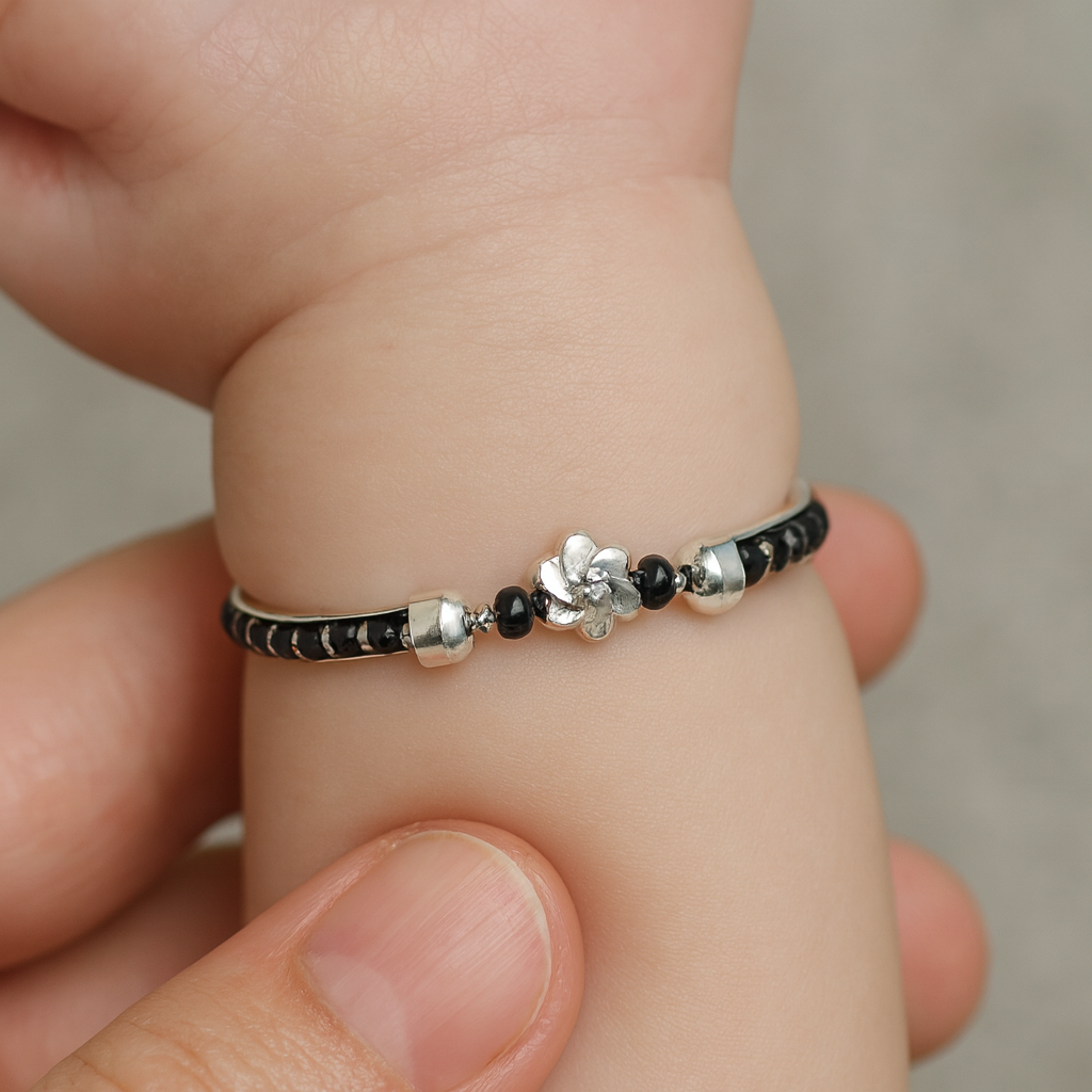 Design: Crafted with gleaming faceted black beads and a delicately sculpted silver floral centerpiece, these bangles merge old-world charm with modern finesse. Perfectly balanced for both beauty and baby-safe wear.