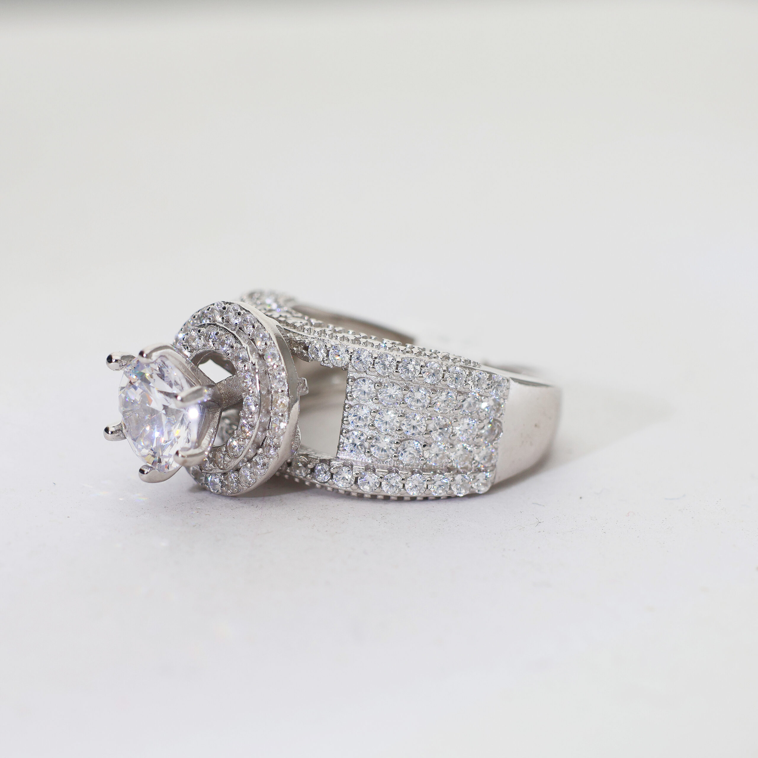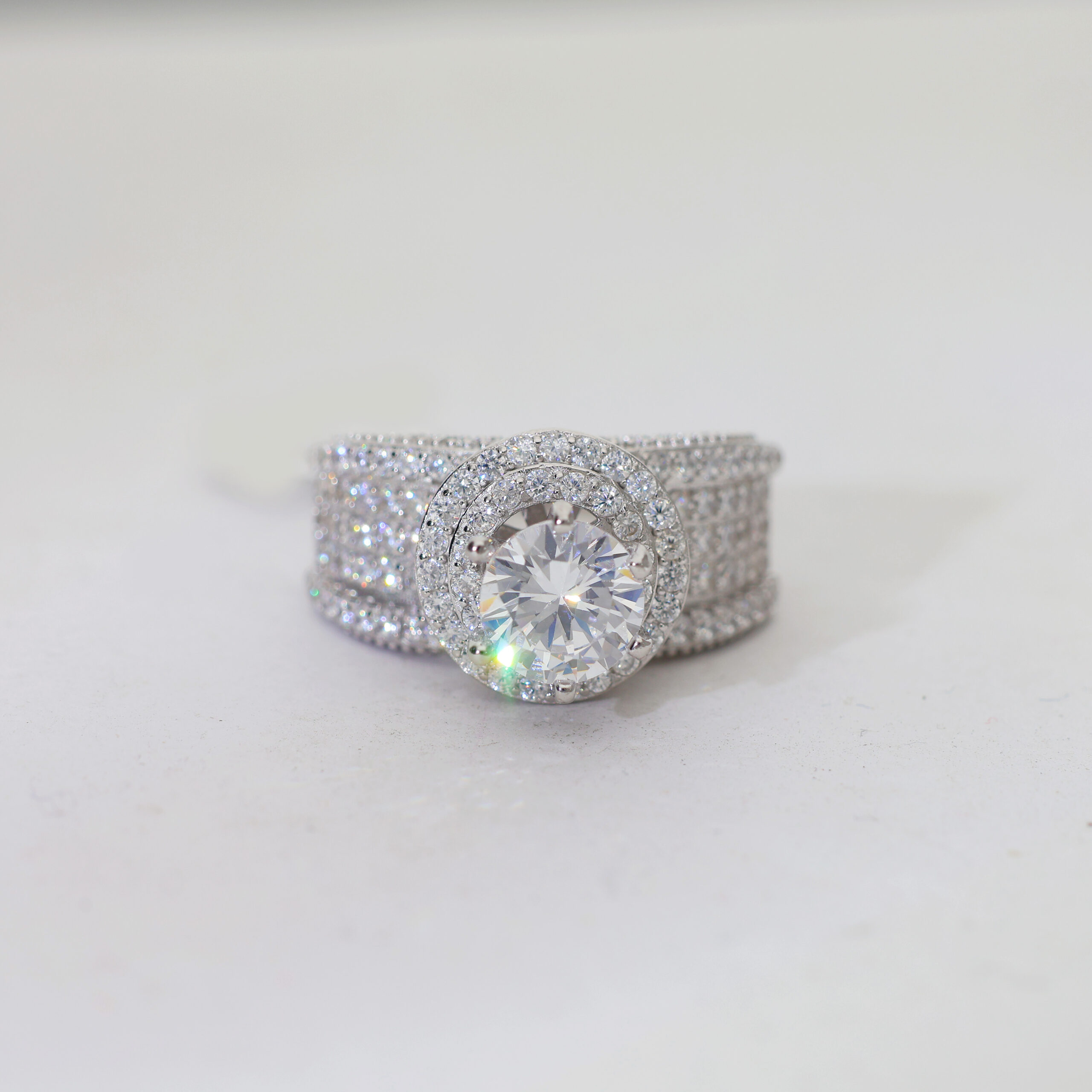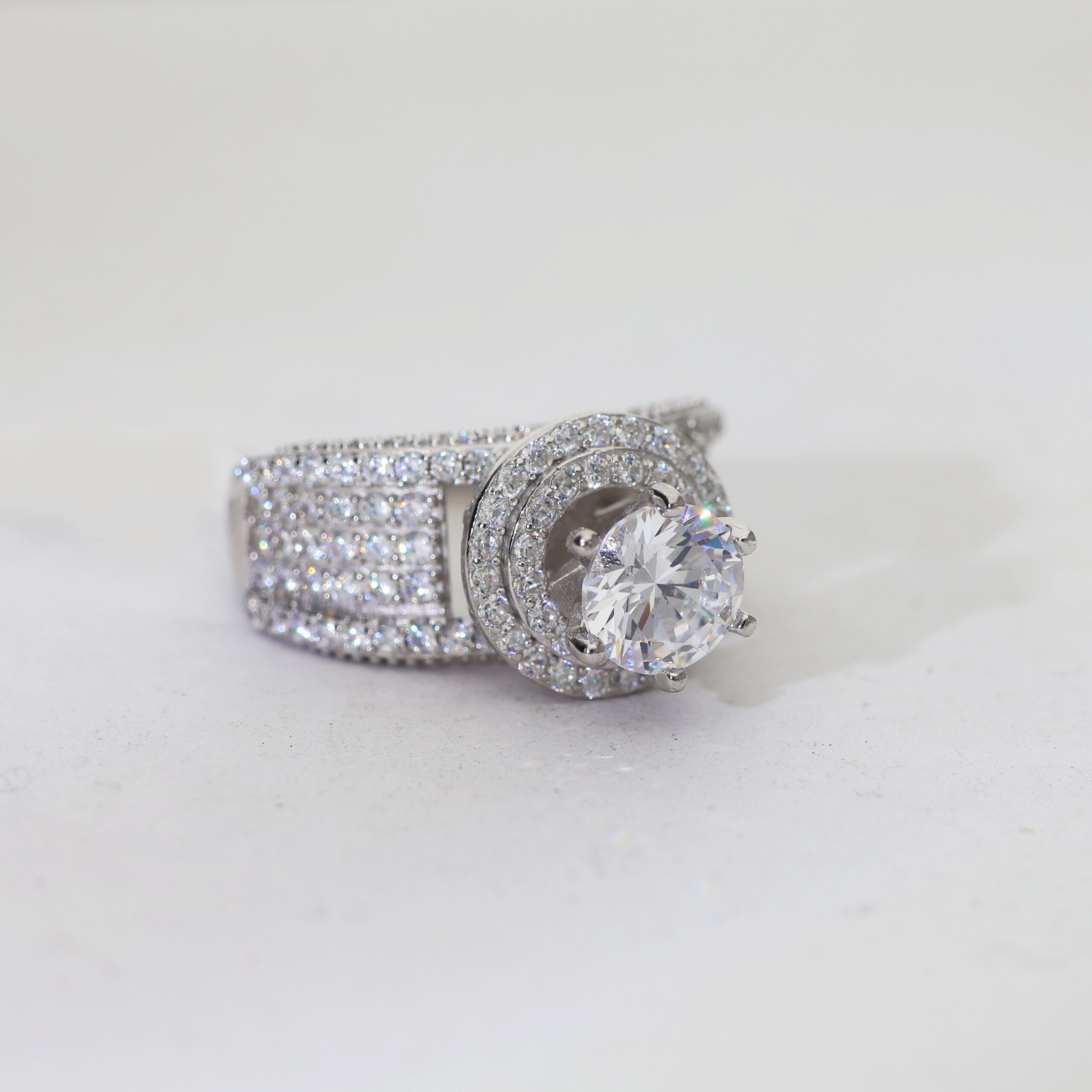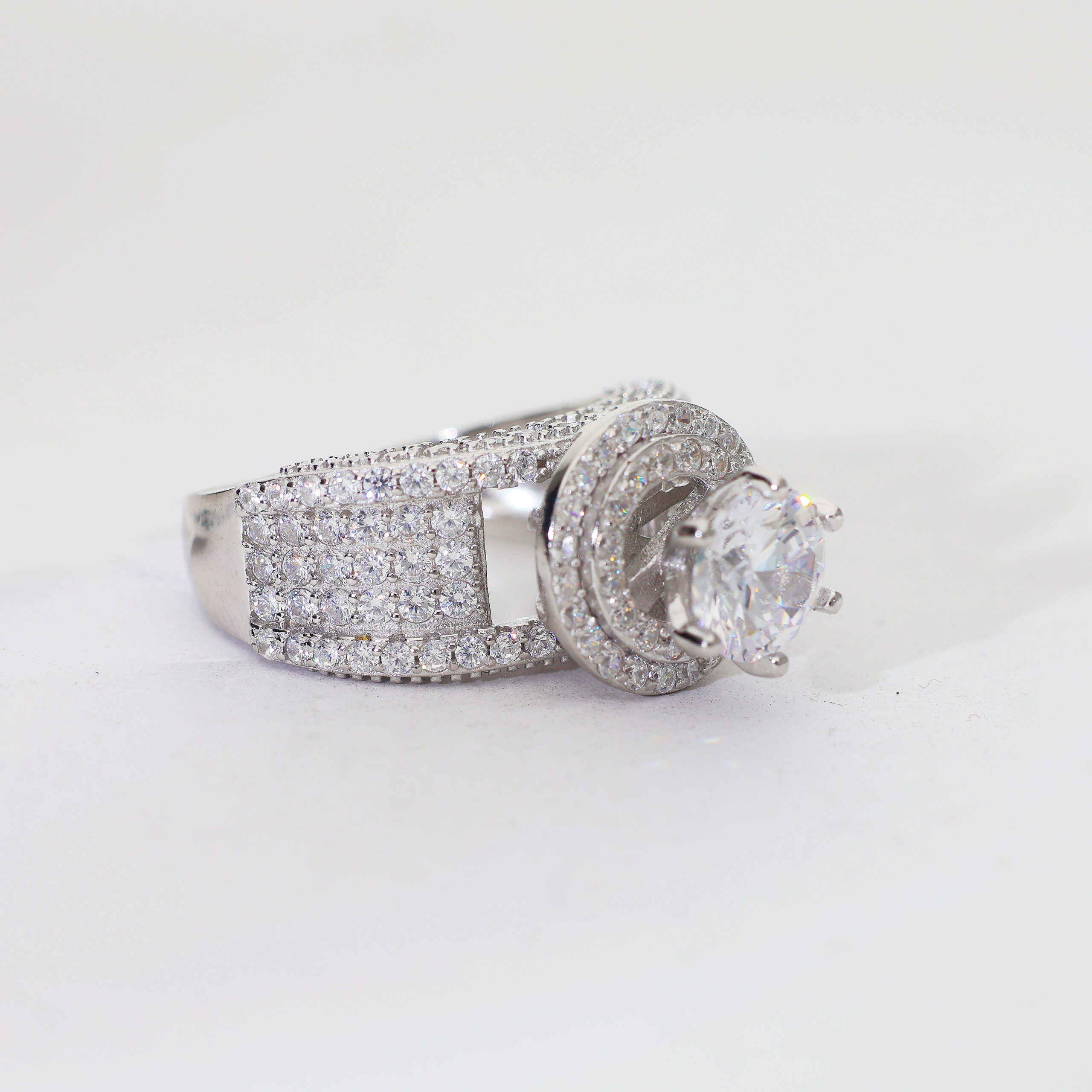 Design: Large round top crafted in silver, with a central stone, fine micro-pave halo, wavy inner ring and baguette outer ring, giving soft layers and a rich, 3D look while staying elegant.