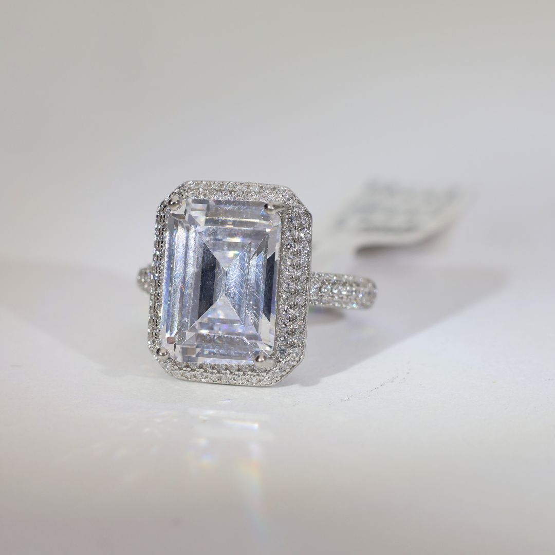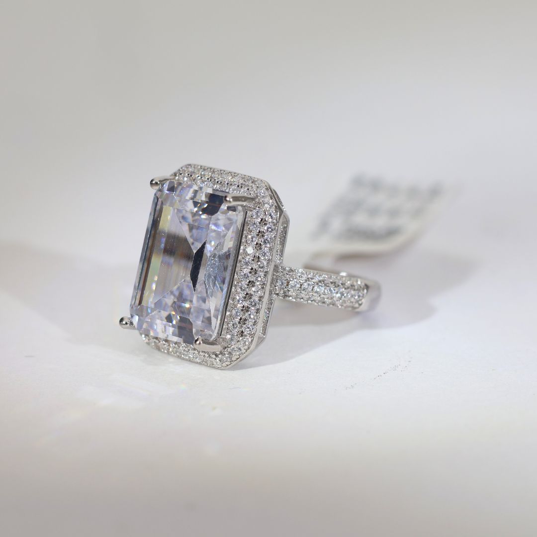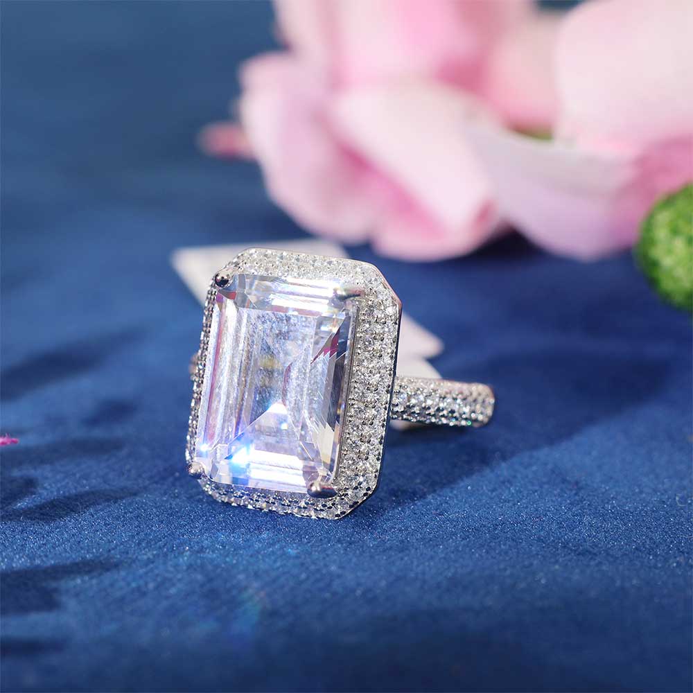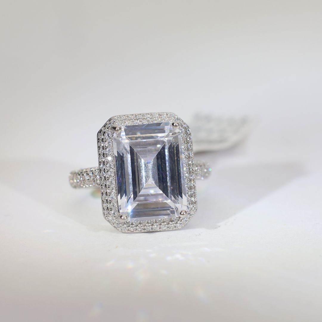 Design: Four-prong emerald center, rounded-corner frame, and two rows of tiny stones for a soft, full sparkle. The inside is smooth for a gentle feel.