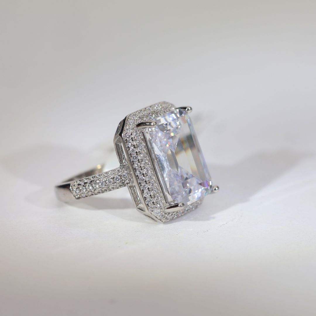 A mirror-bright emerald-cut stone sits inside a shining double halo on a pavé band.