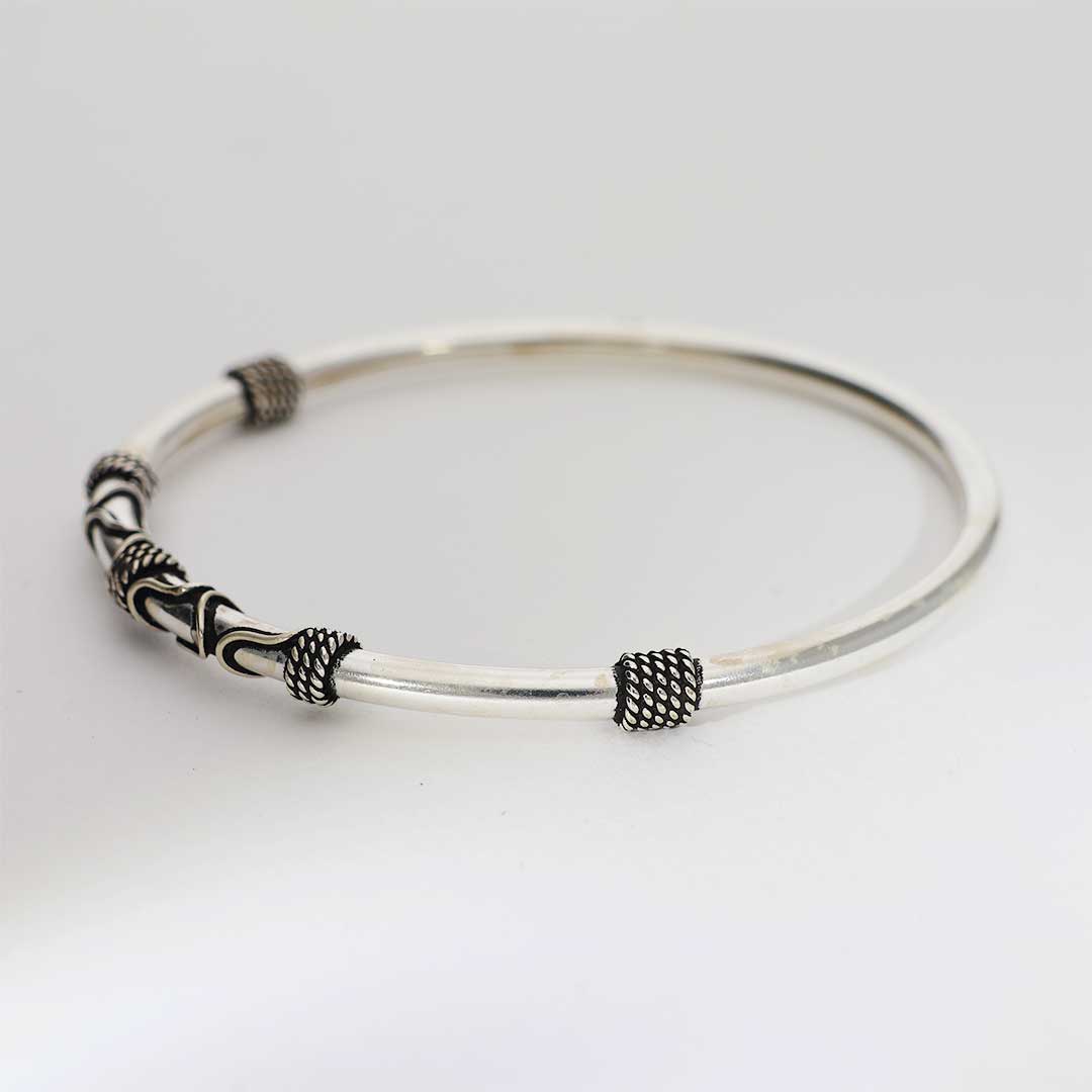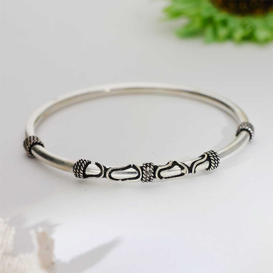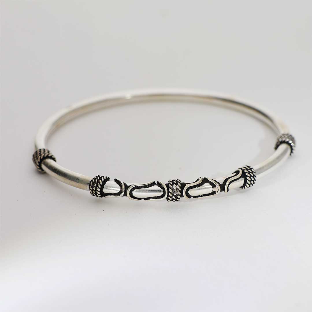 Design: A slim 92.5 silver kada with oxidised loop motifs and textured rings. Clean tube shape makes it light and easy for daily wear.