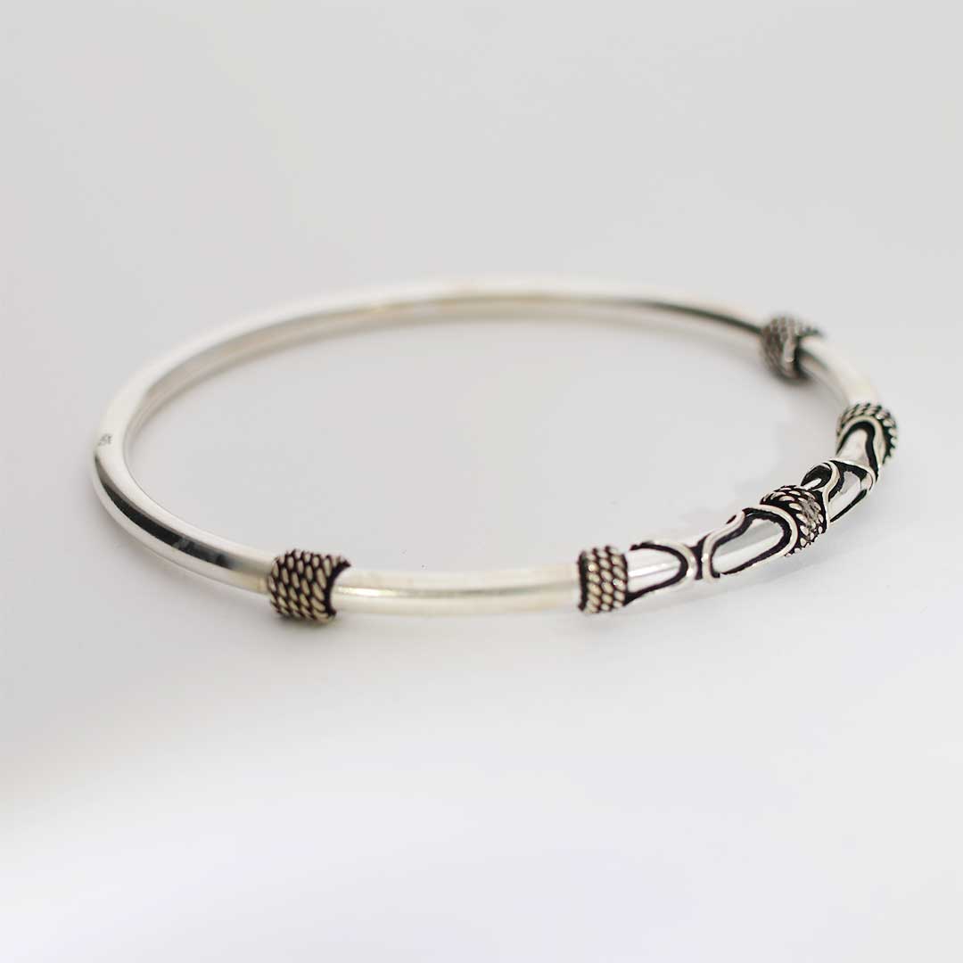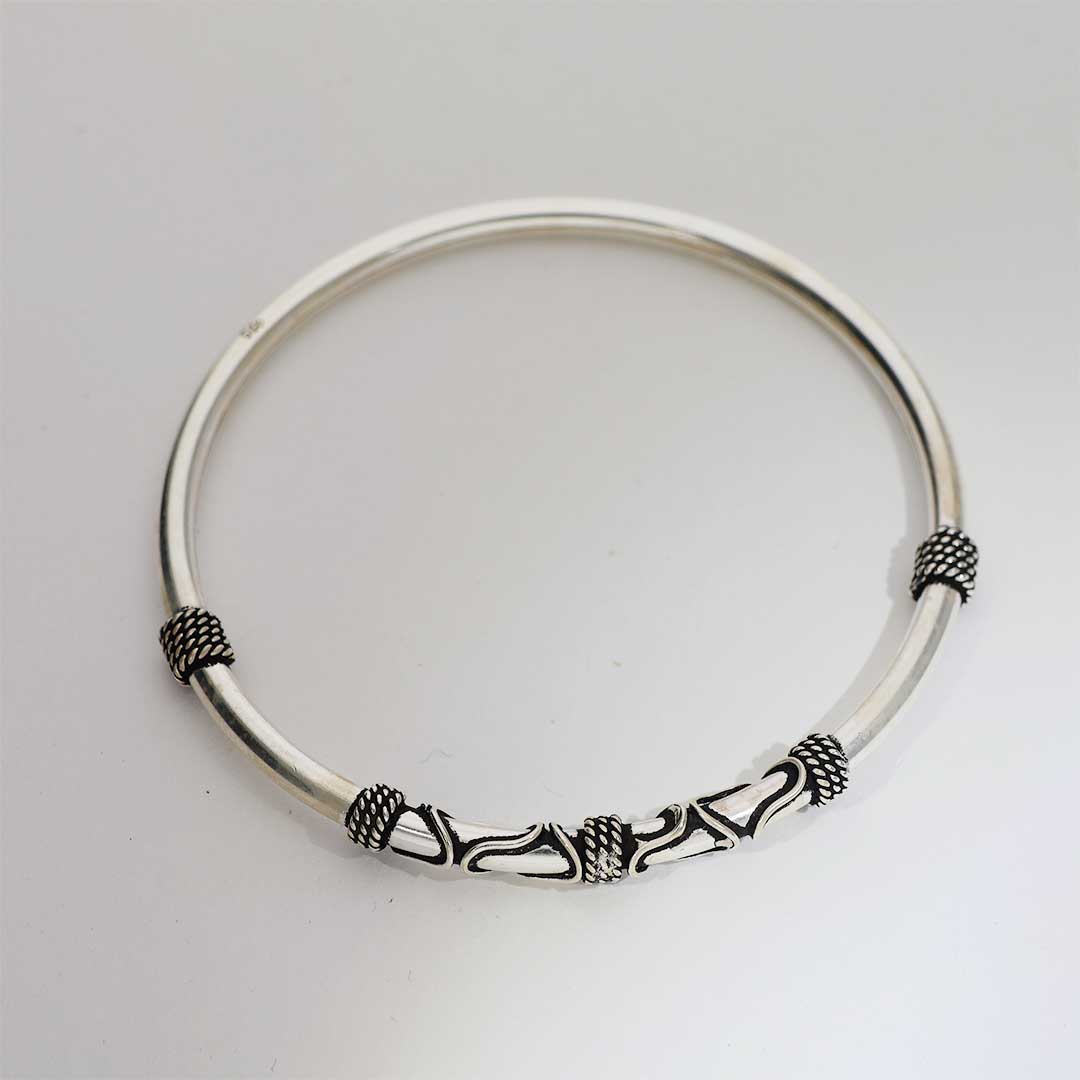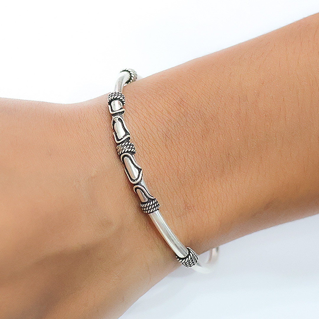 Design: A slim 92.5 silver kada with oxidised loop motifs and textured rings. Clean tube shape makes it light and easy for daily wear.
