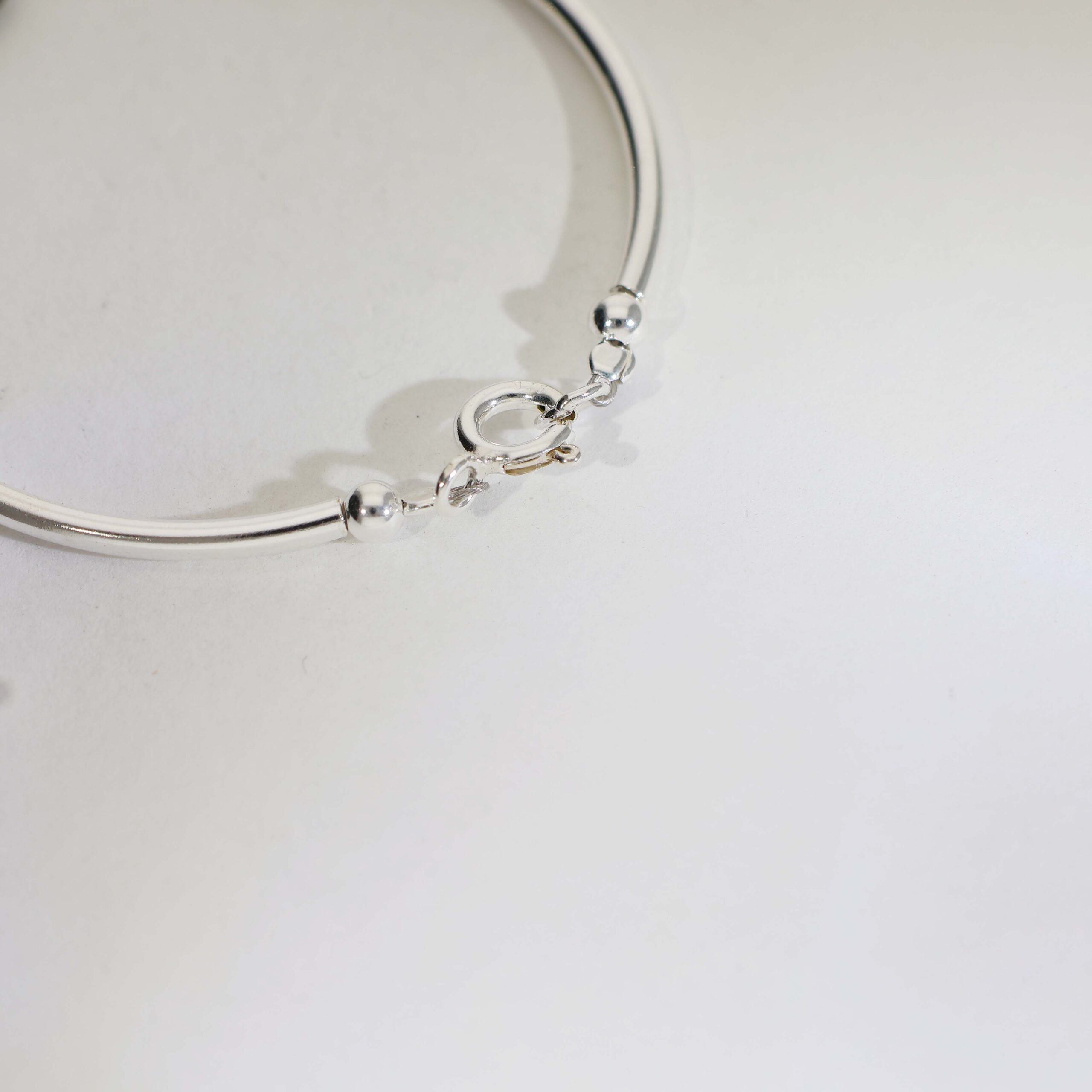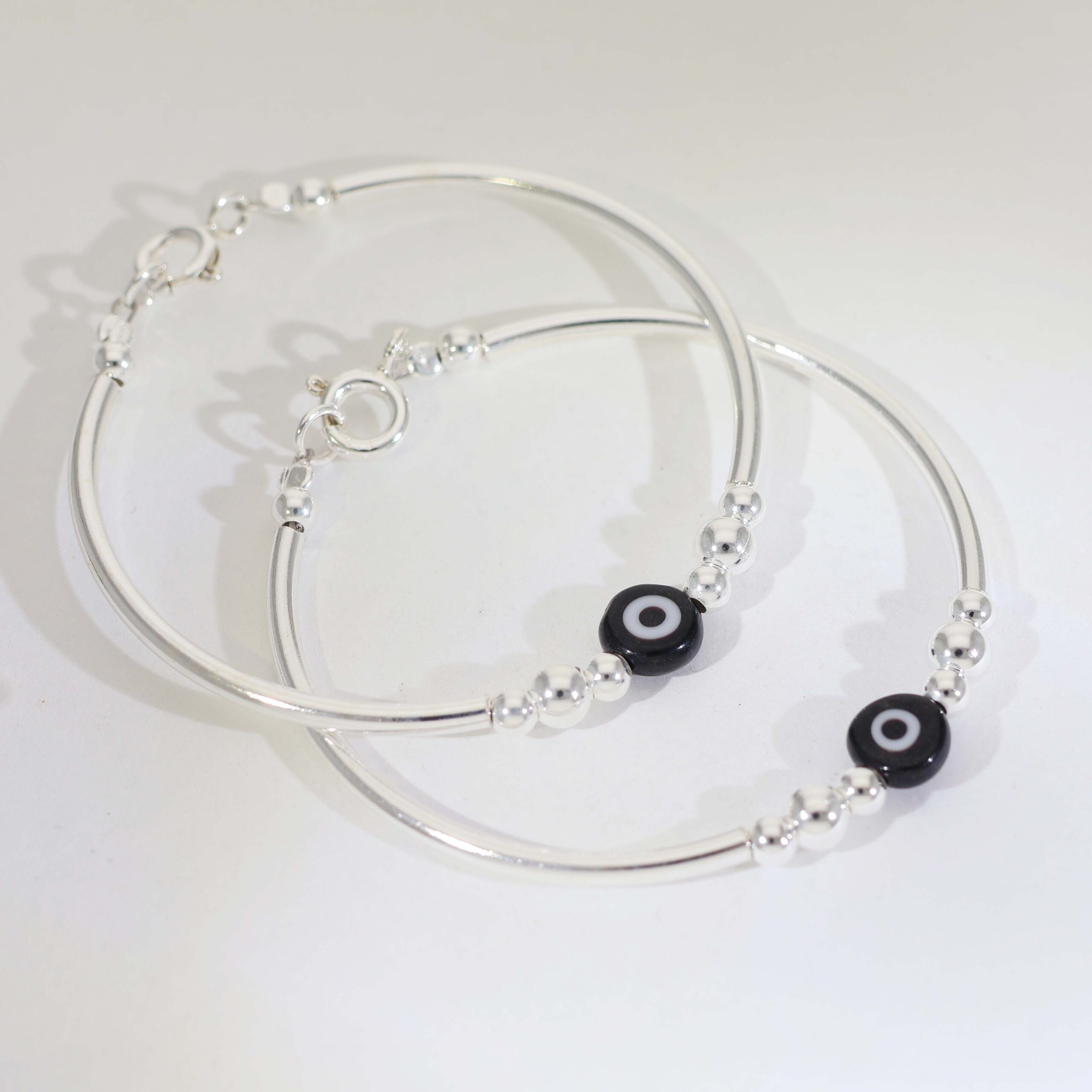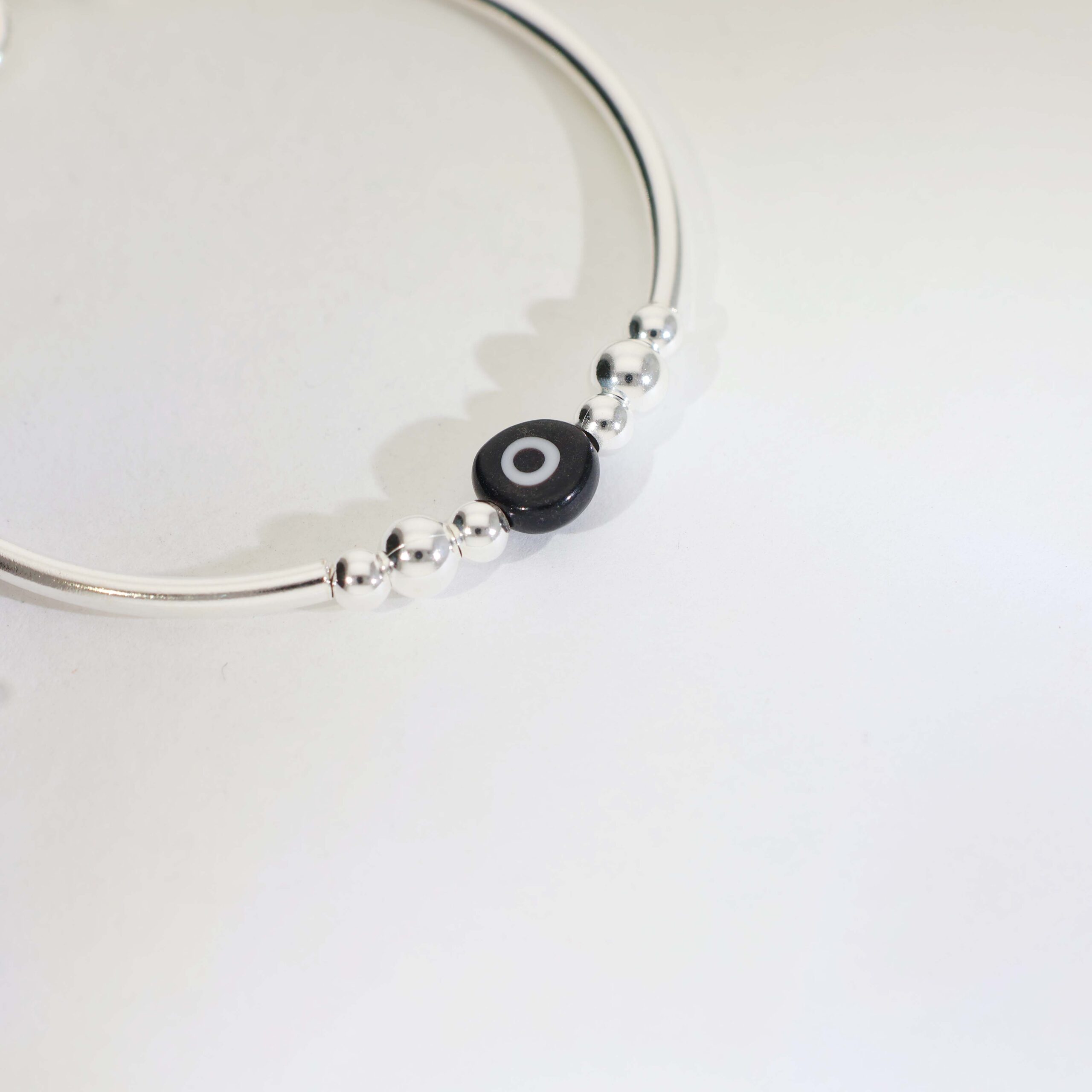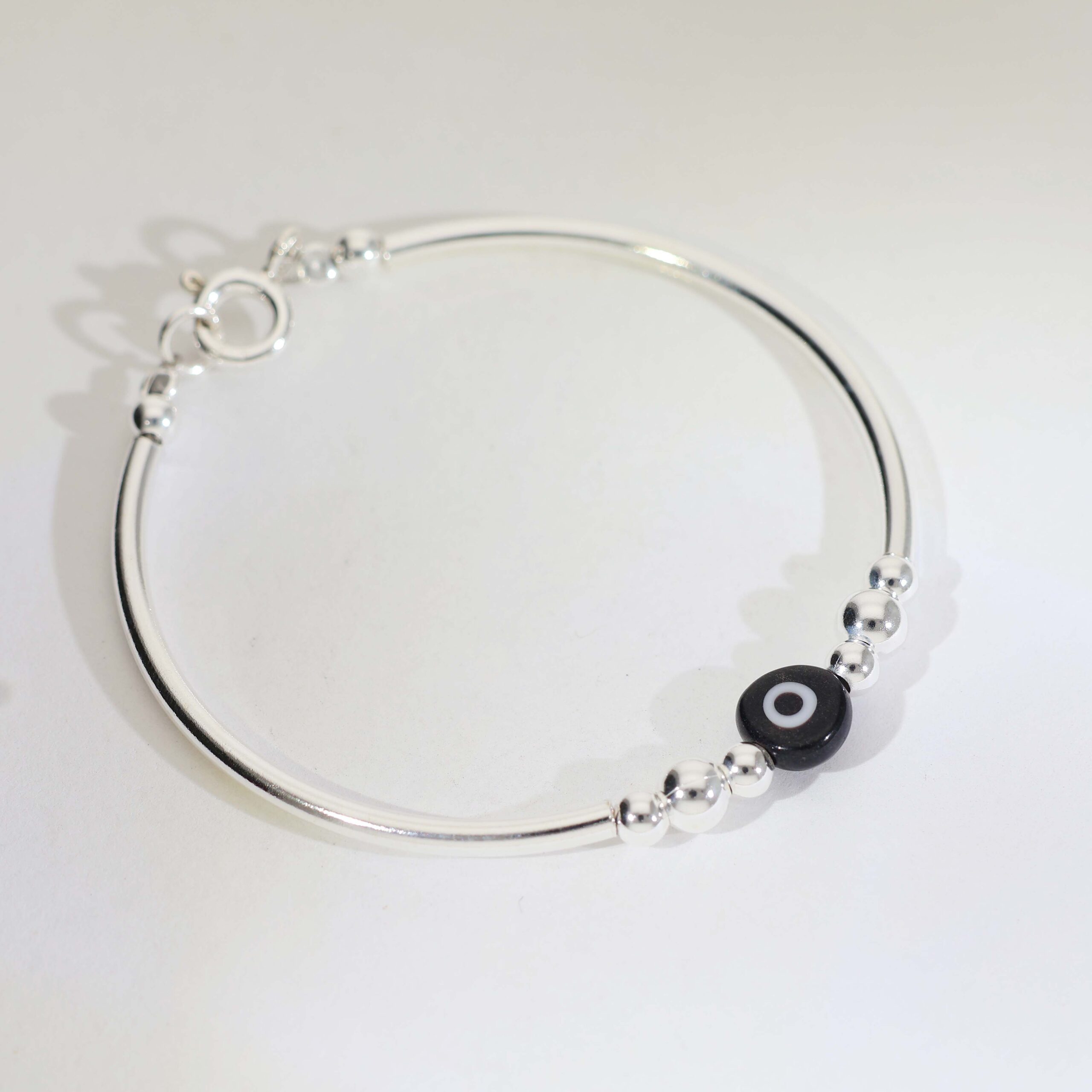 A polished 92.5 silver bracelet featuring a classic black nazar bead at the center, paired with smooth silver beads for a simple and meaningful baby bracelet design.