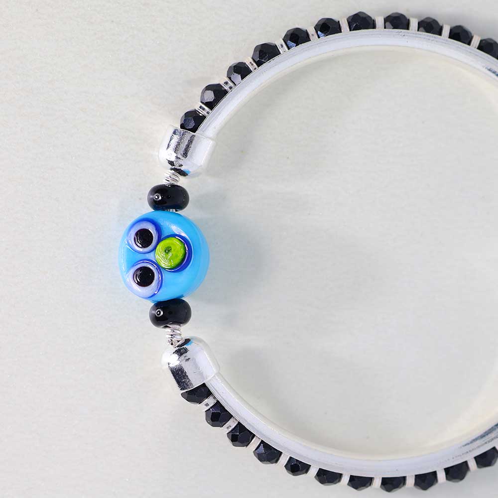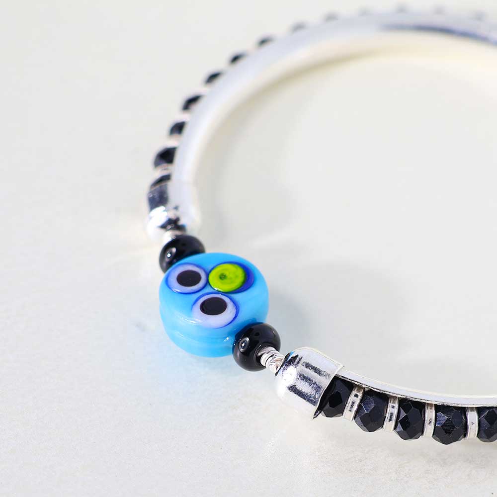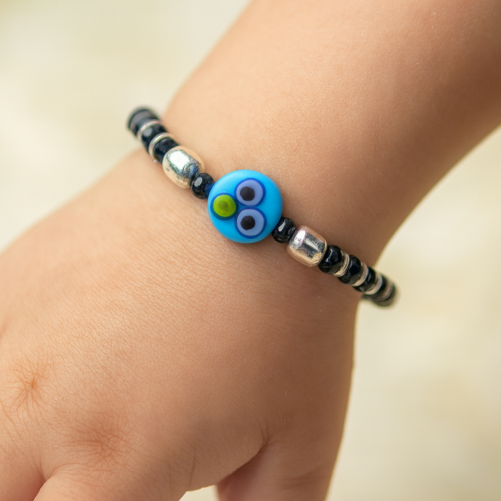 Design: Glossy black beads wrap around a pure silver hoop, anchored by a bold blue nazar bead to guard your baby with style.