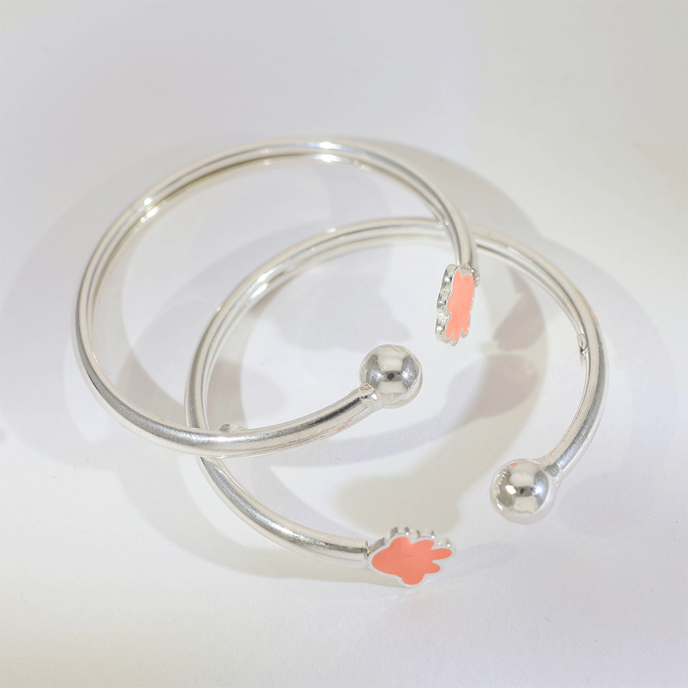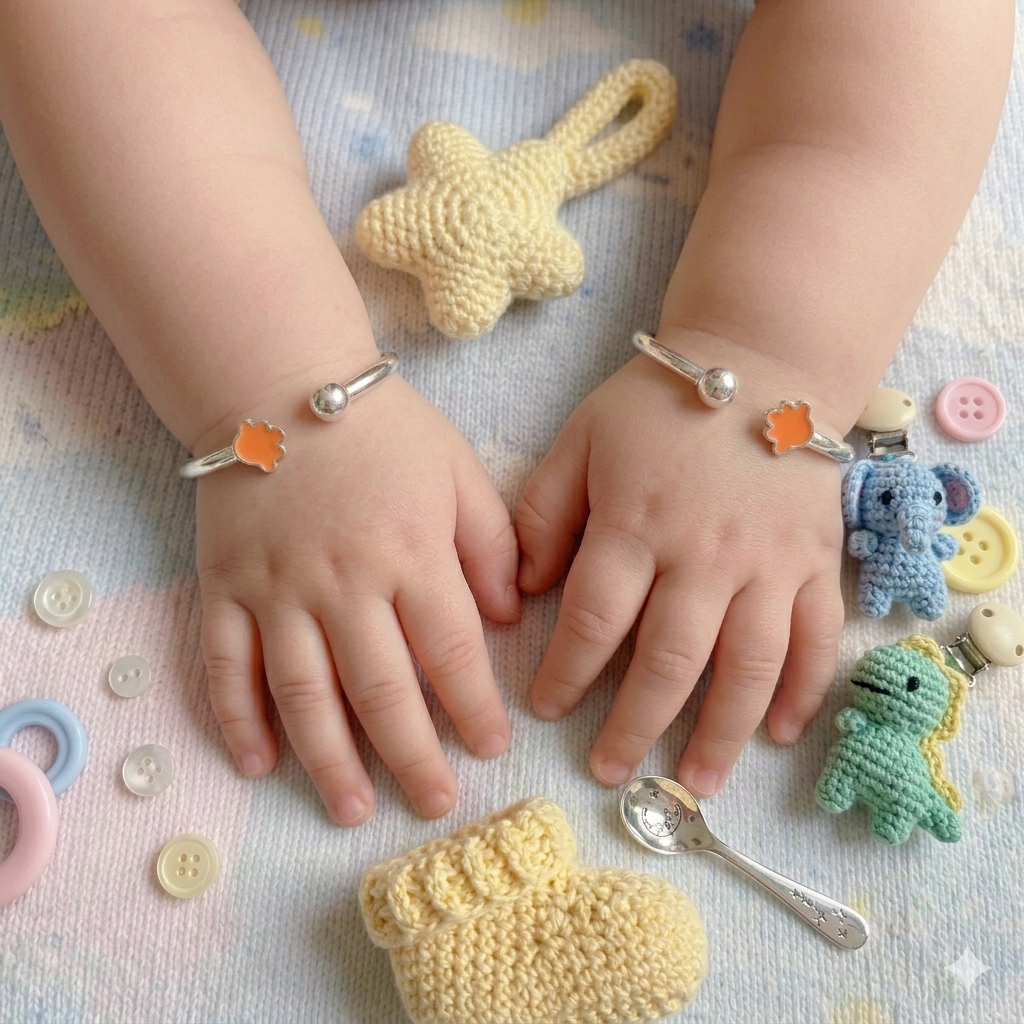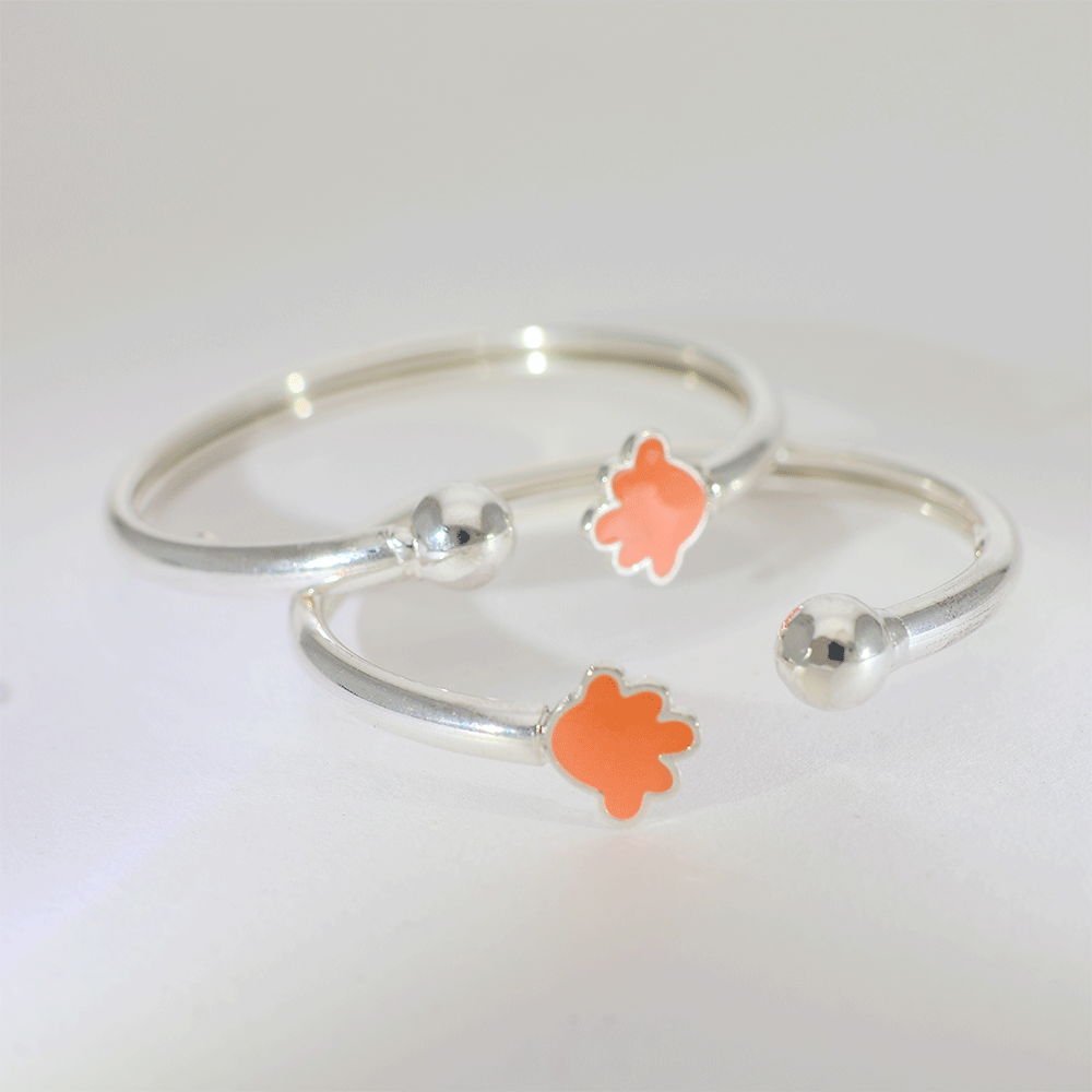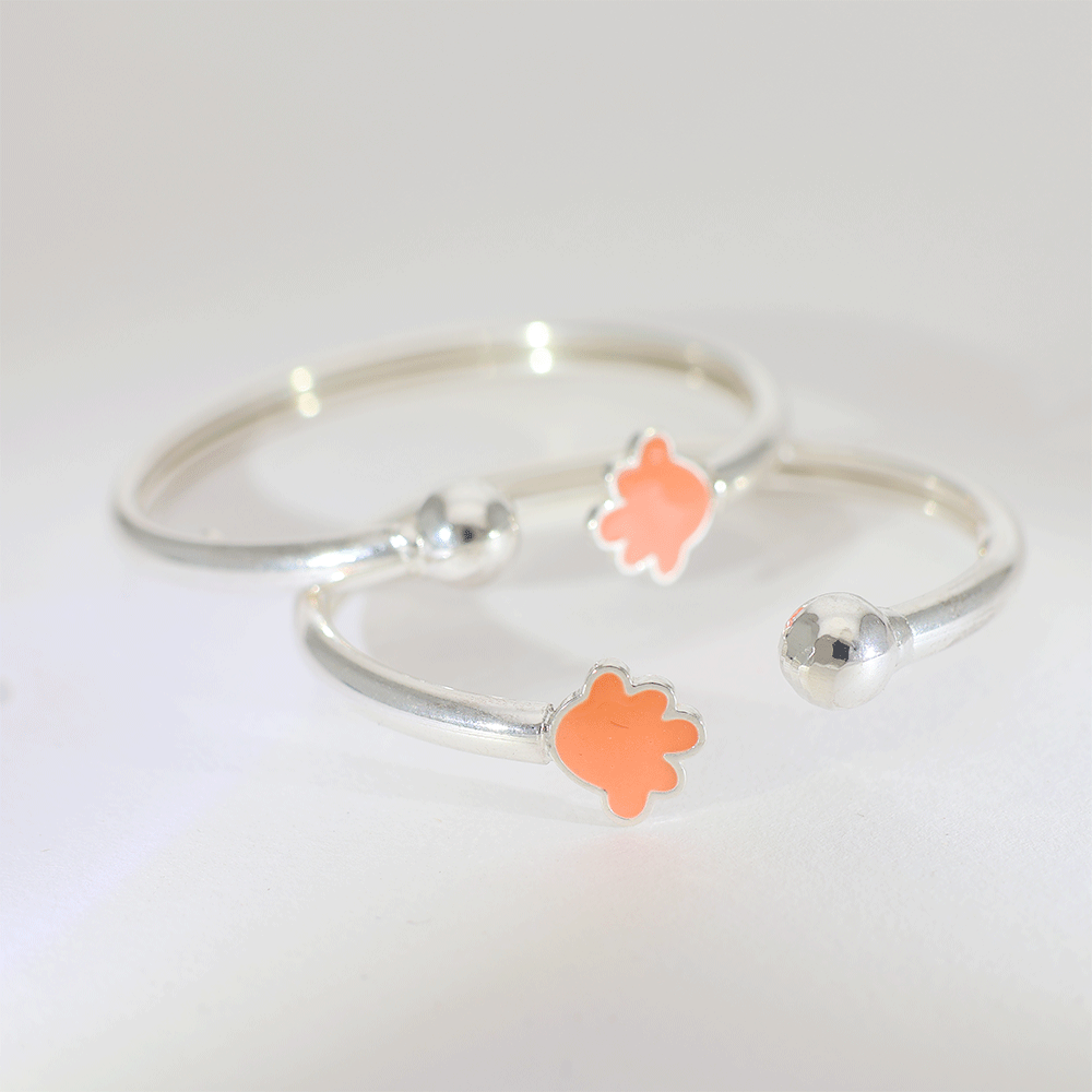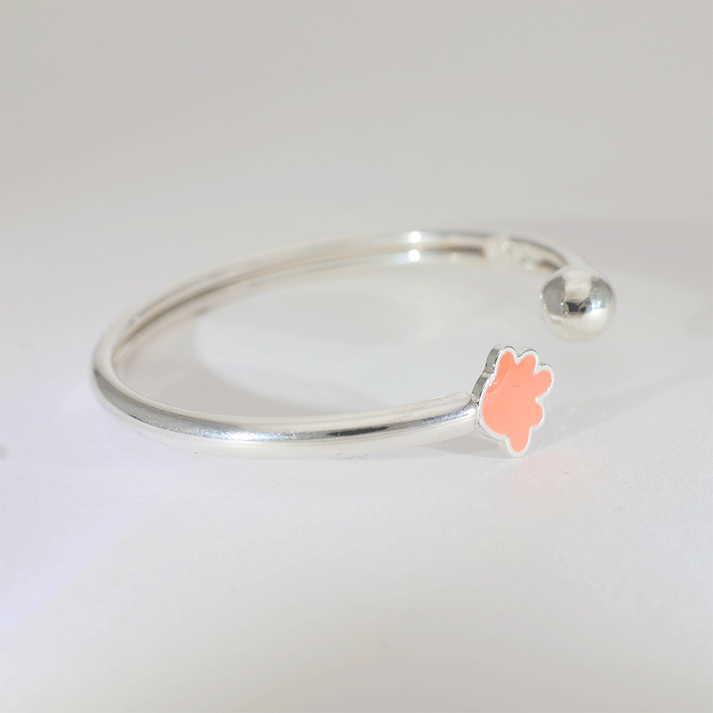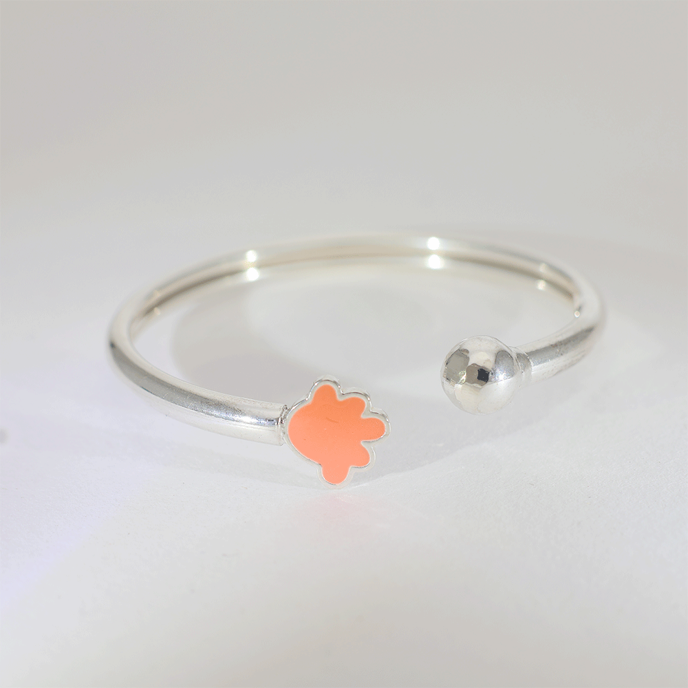 Design: A polished 92.5 silver baby kangan featuring a cute orange flower charm on an open adjustable band, giving a soft and playful look.