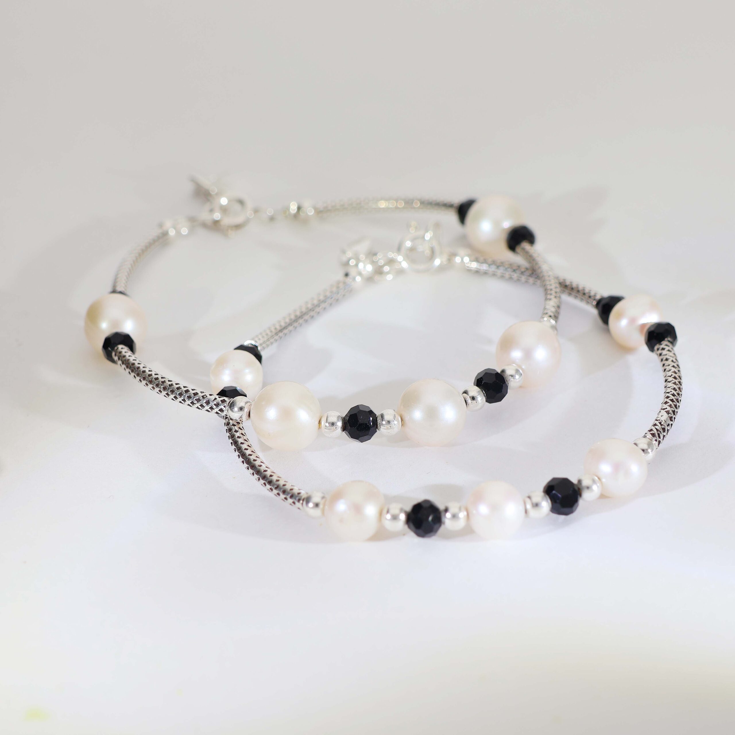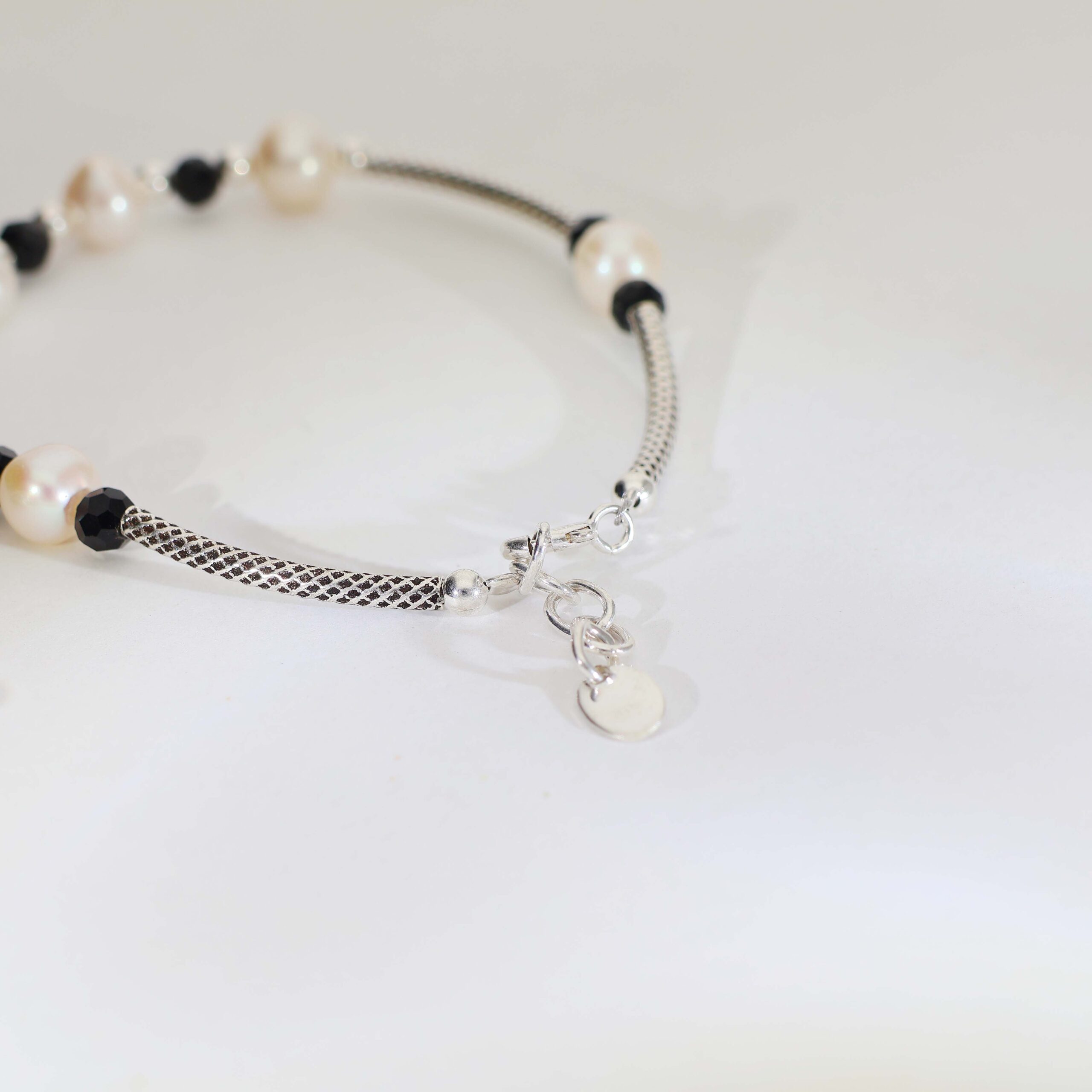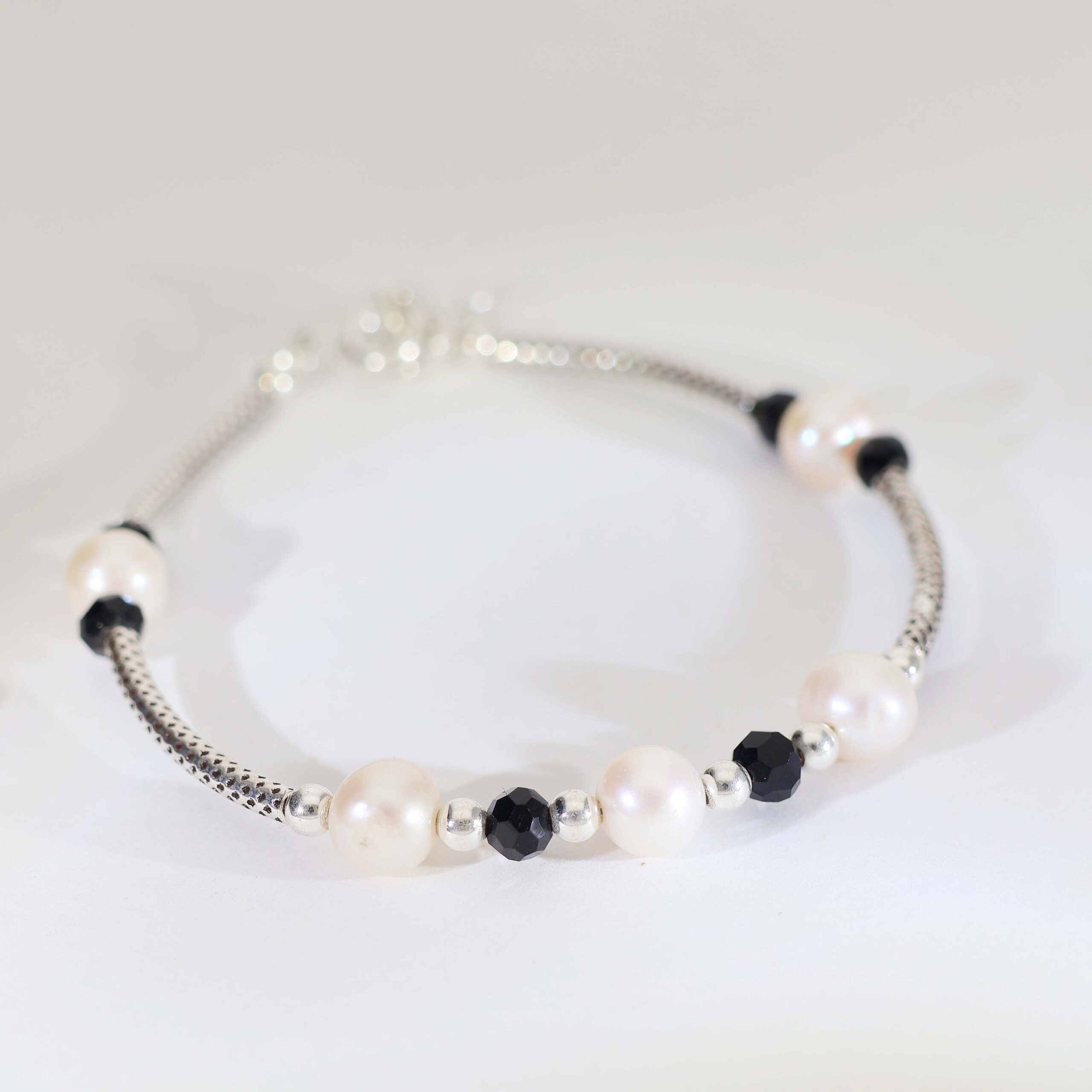 A polished 92.5 silver textured chain decorated with pearl beads, black faceted beads, and shiny silver accents that create an elegant and meaningful baby bracelet.