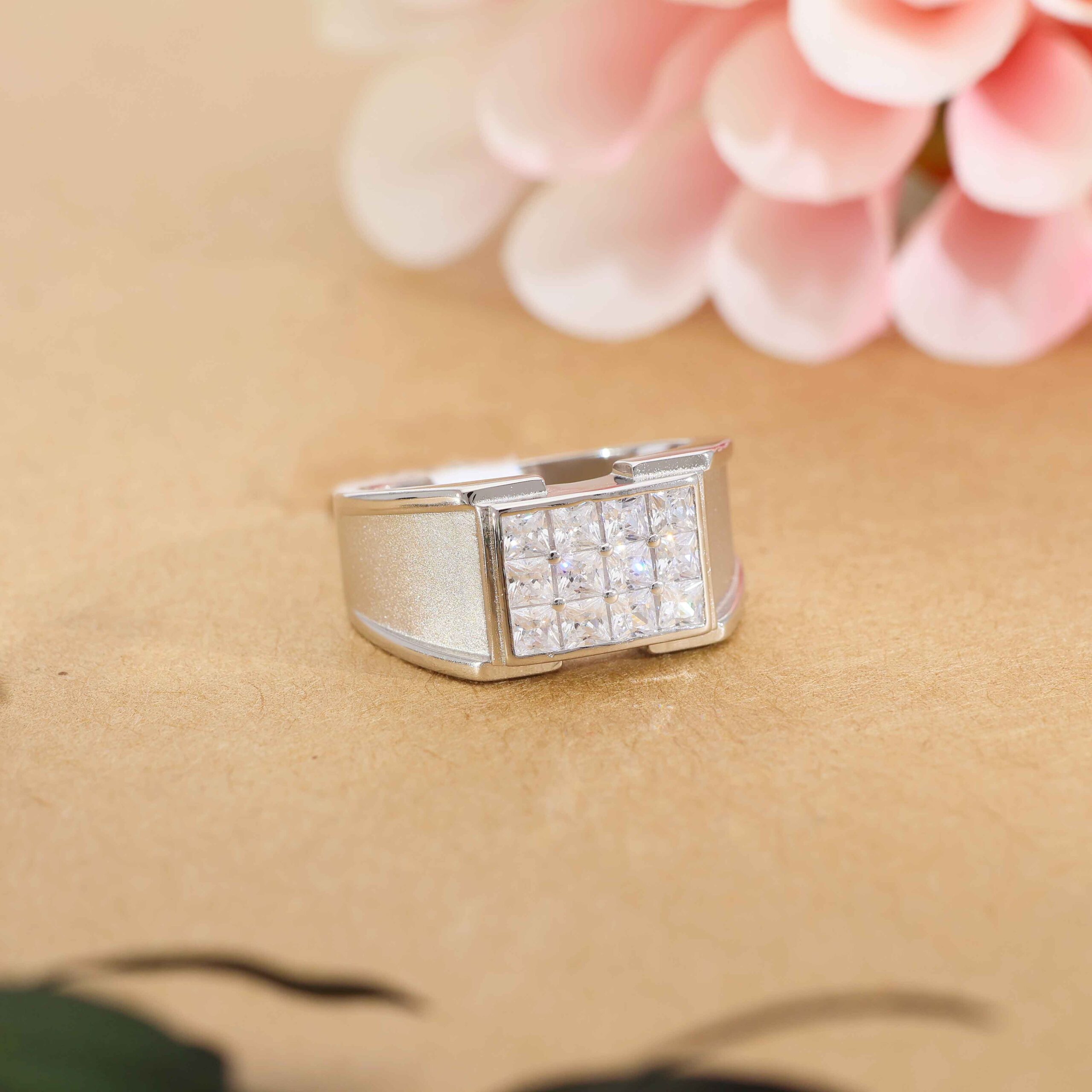 Design: Crafted in 92.5 sterling silver, the ring features a rectangular block in the center set with multiple clear stones arranged closely together. The broad band tapers slightly at the back for better comfort and fit on the finger.