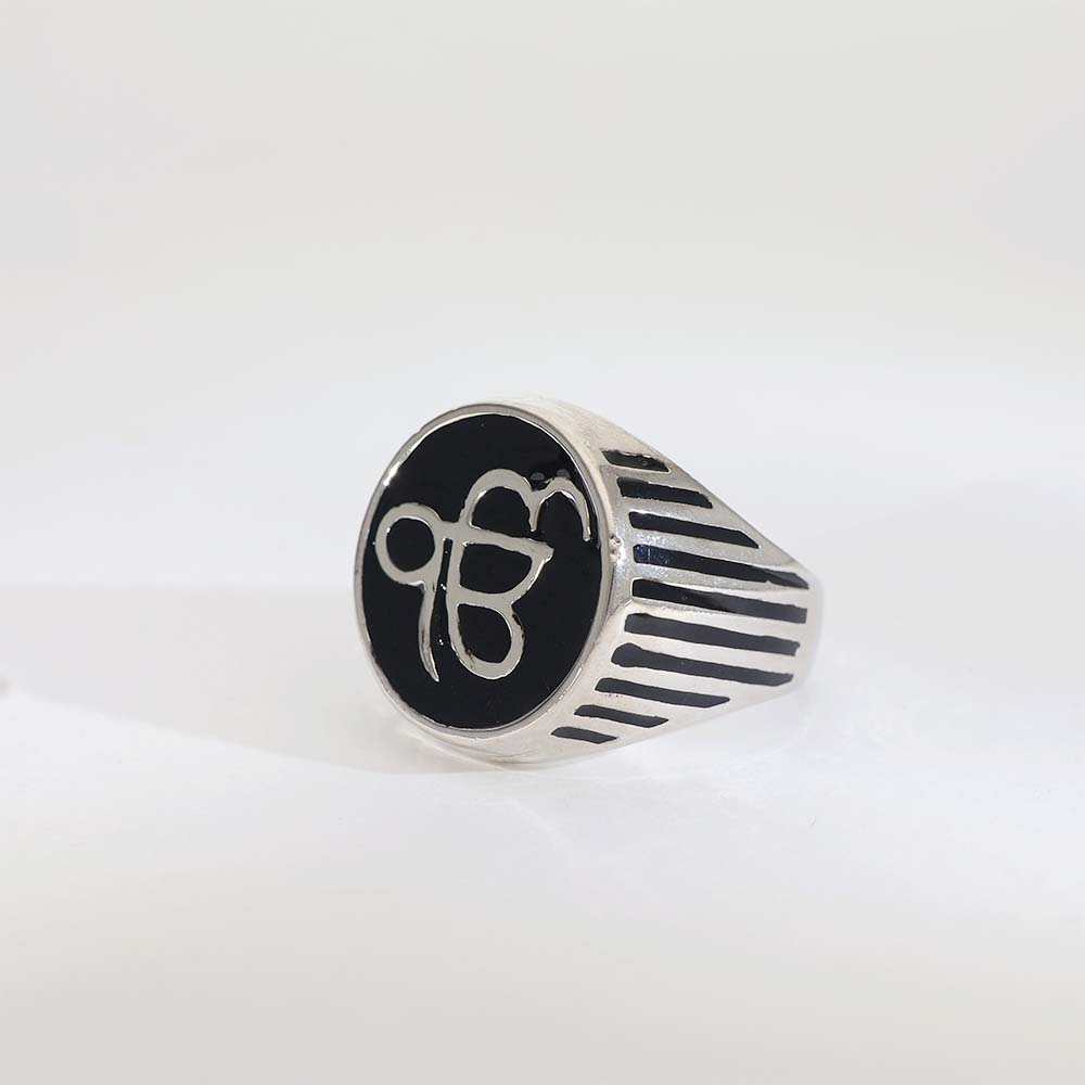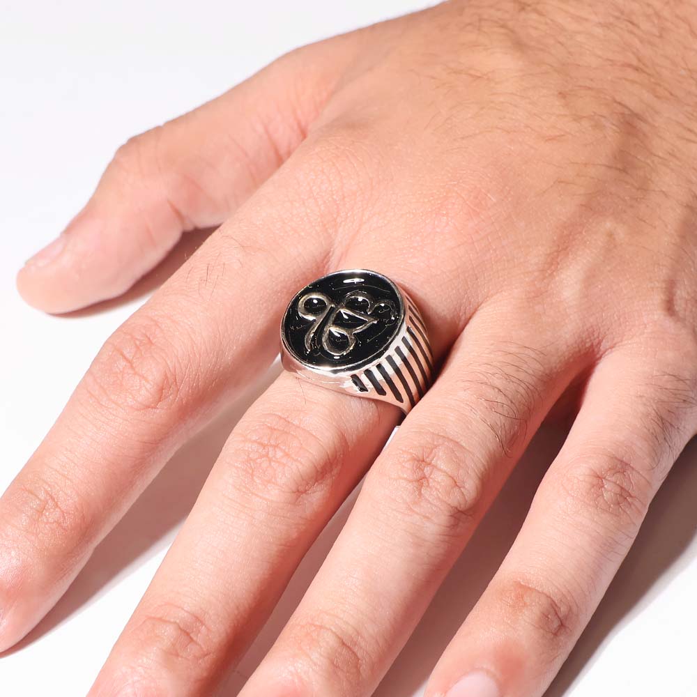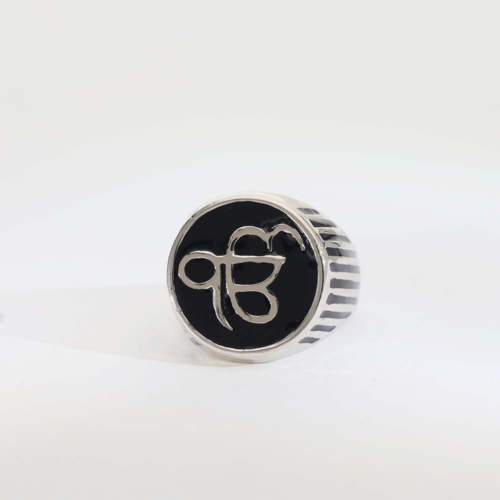 Design: Crafted in 92.5 sterling silver, the ring features a round black enamel center with a polished Ek Onkar. The shank is decorated with long vertical black stripes that give movement and edge to the design while keeping the inside smooth and comfortable.