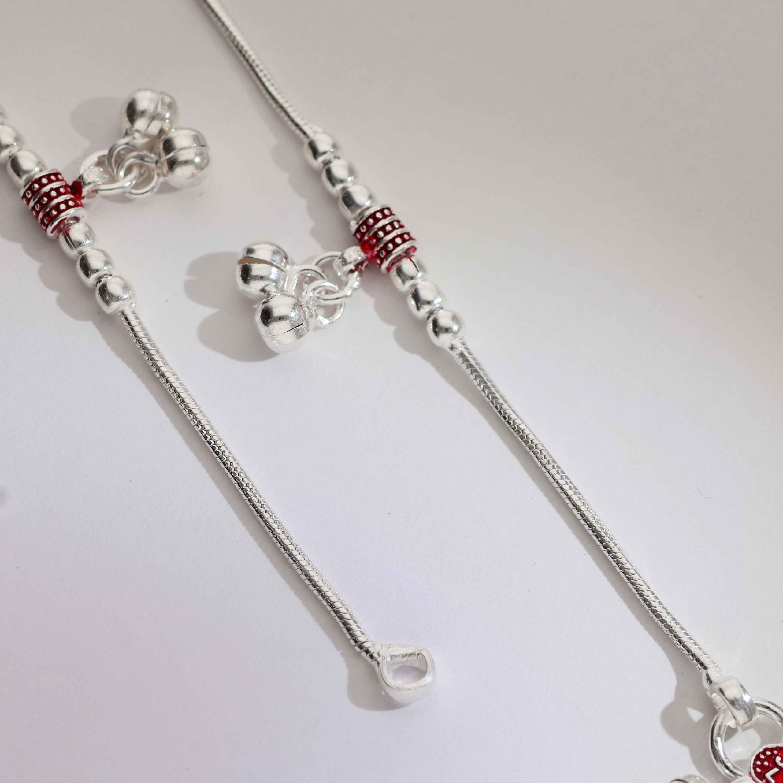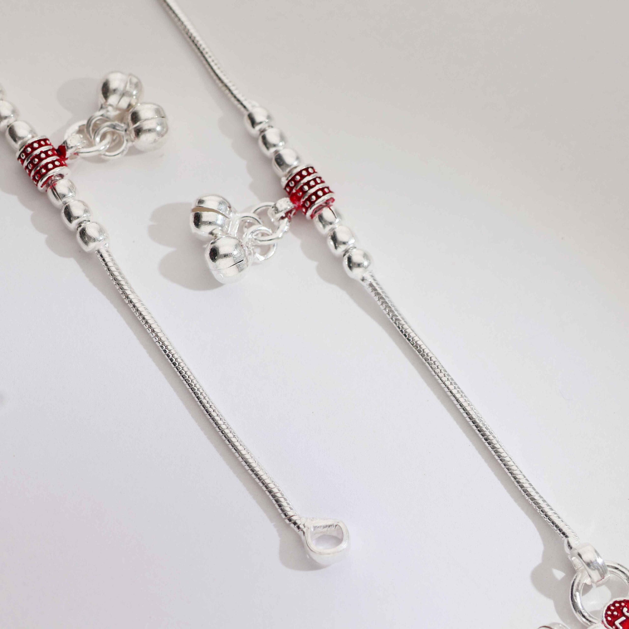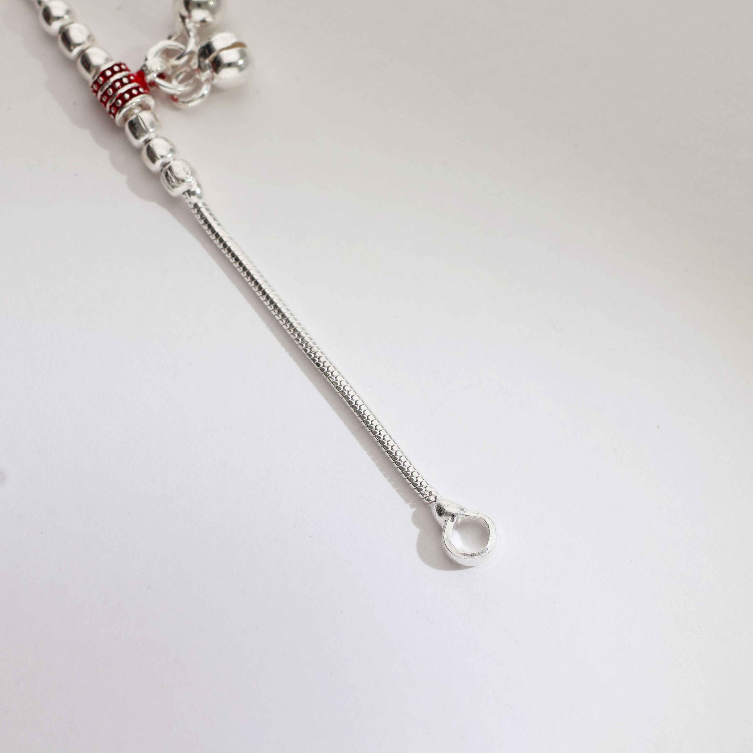 Crafted in pure silver with a smooth snake chain, red bead centerpiece, and gentle ghungroo bells.