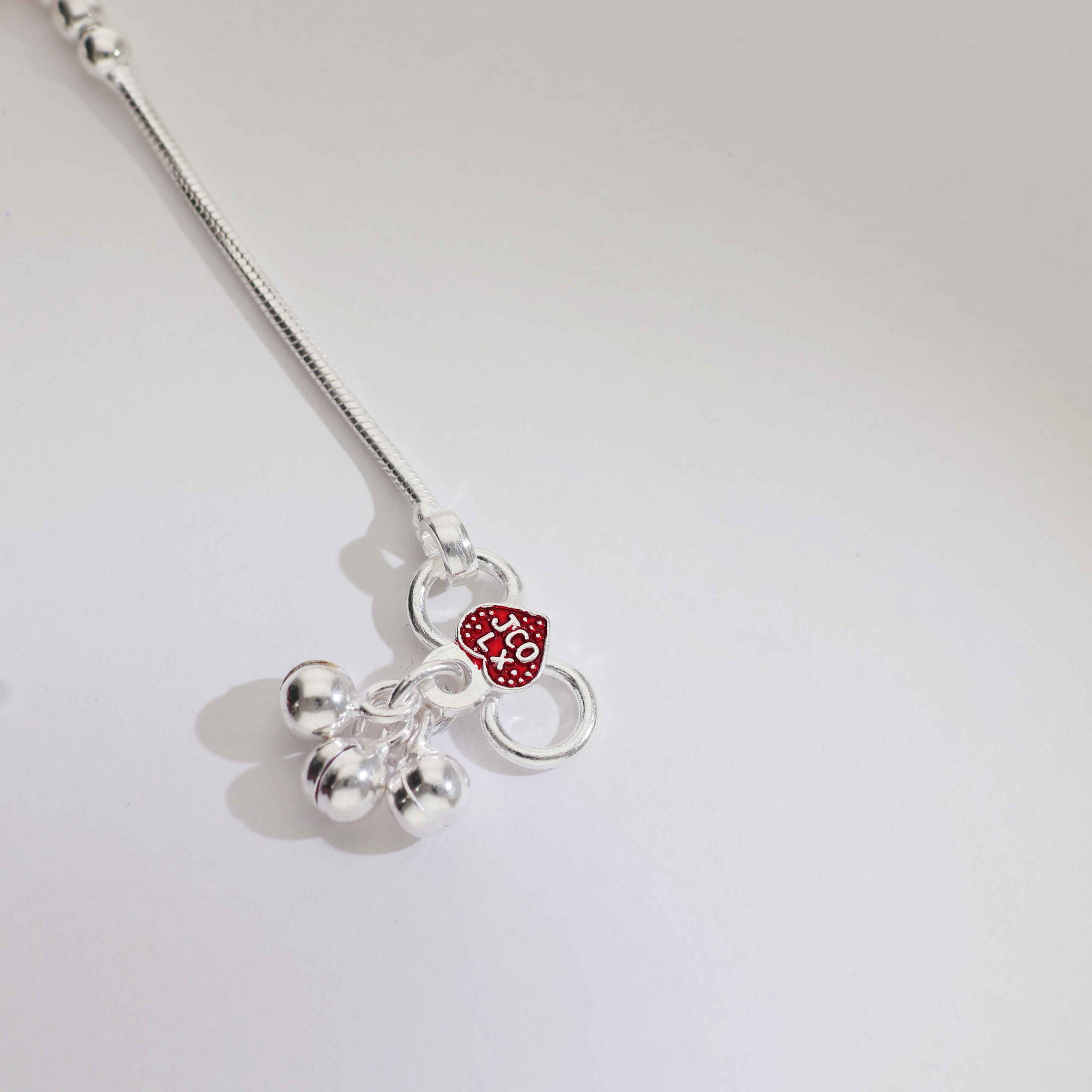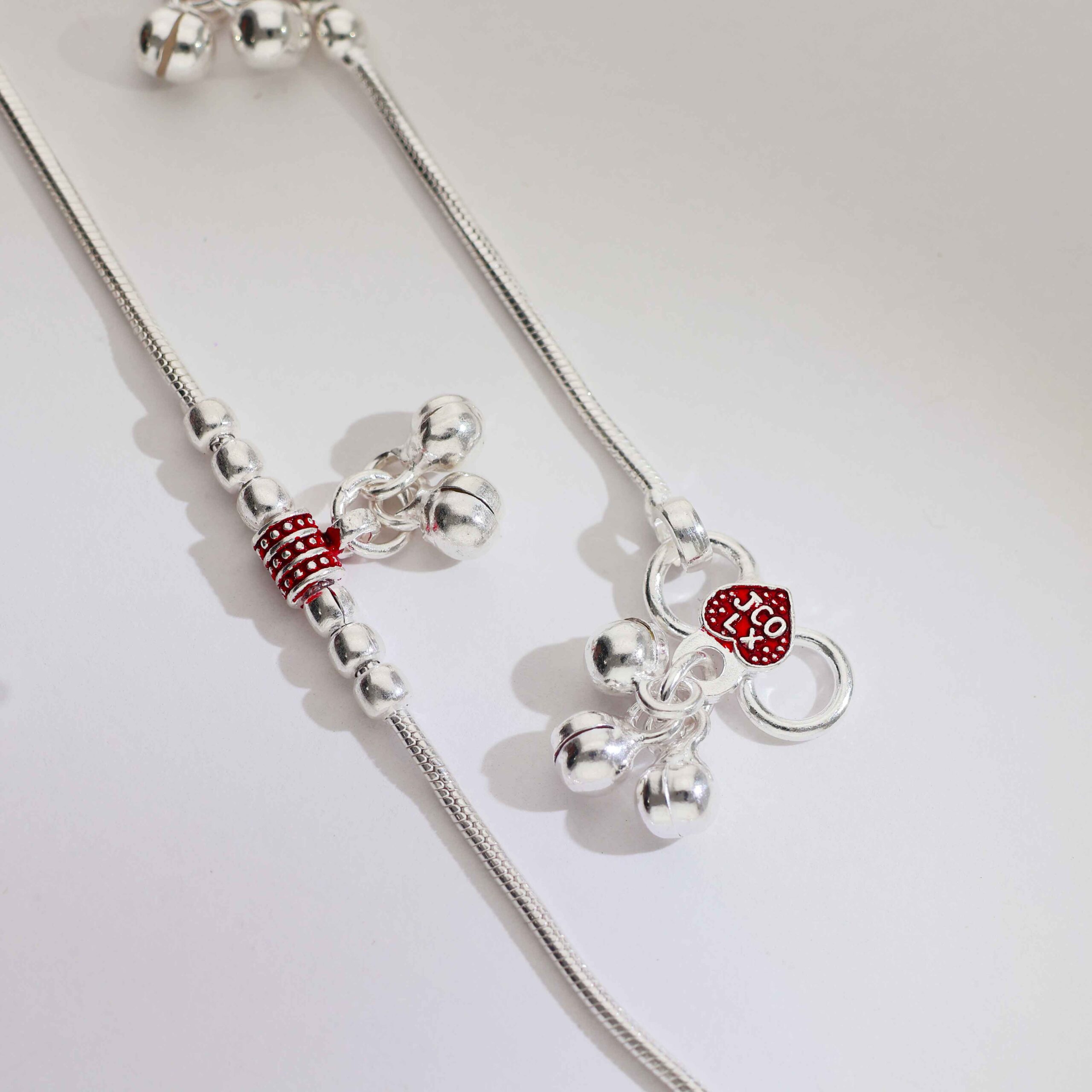 A sweet silver baby anklet designed with red bead charm and soft bells for tiny feet.