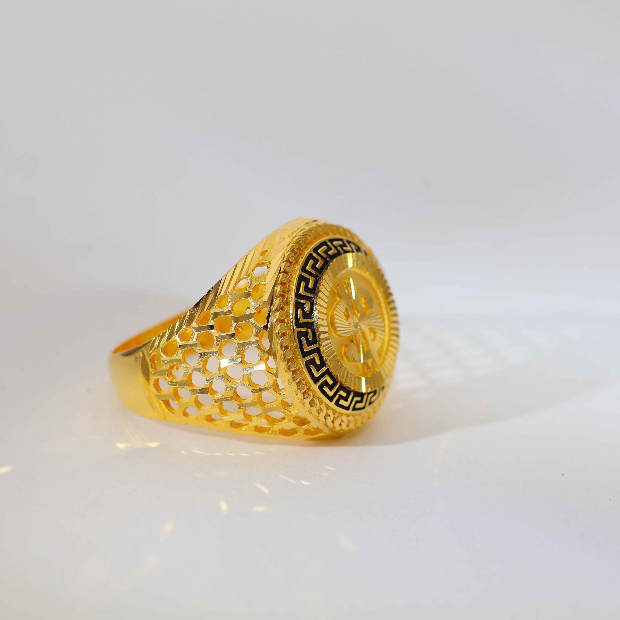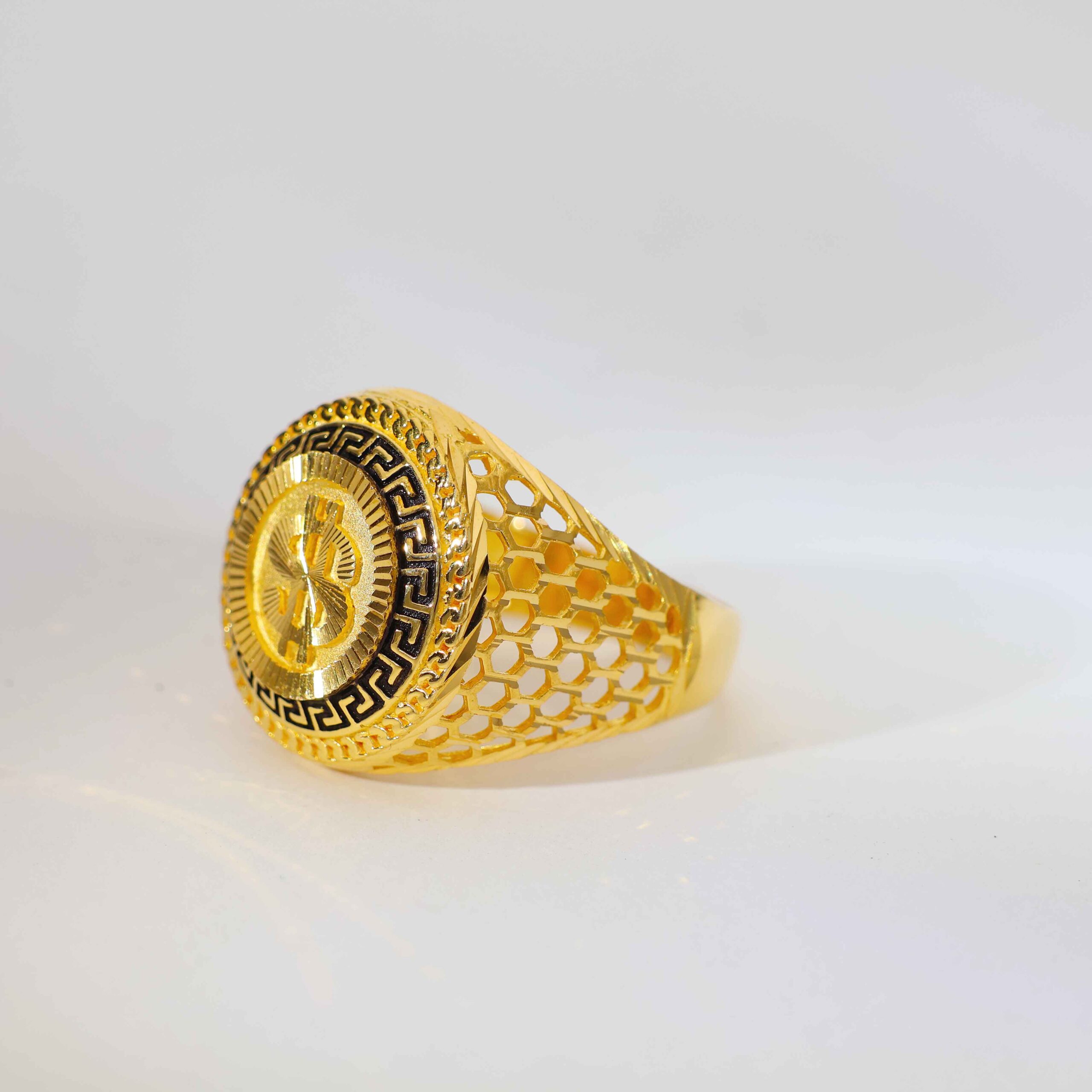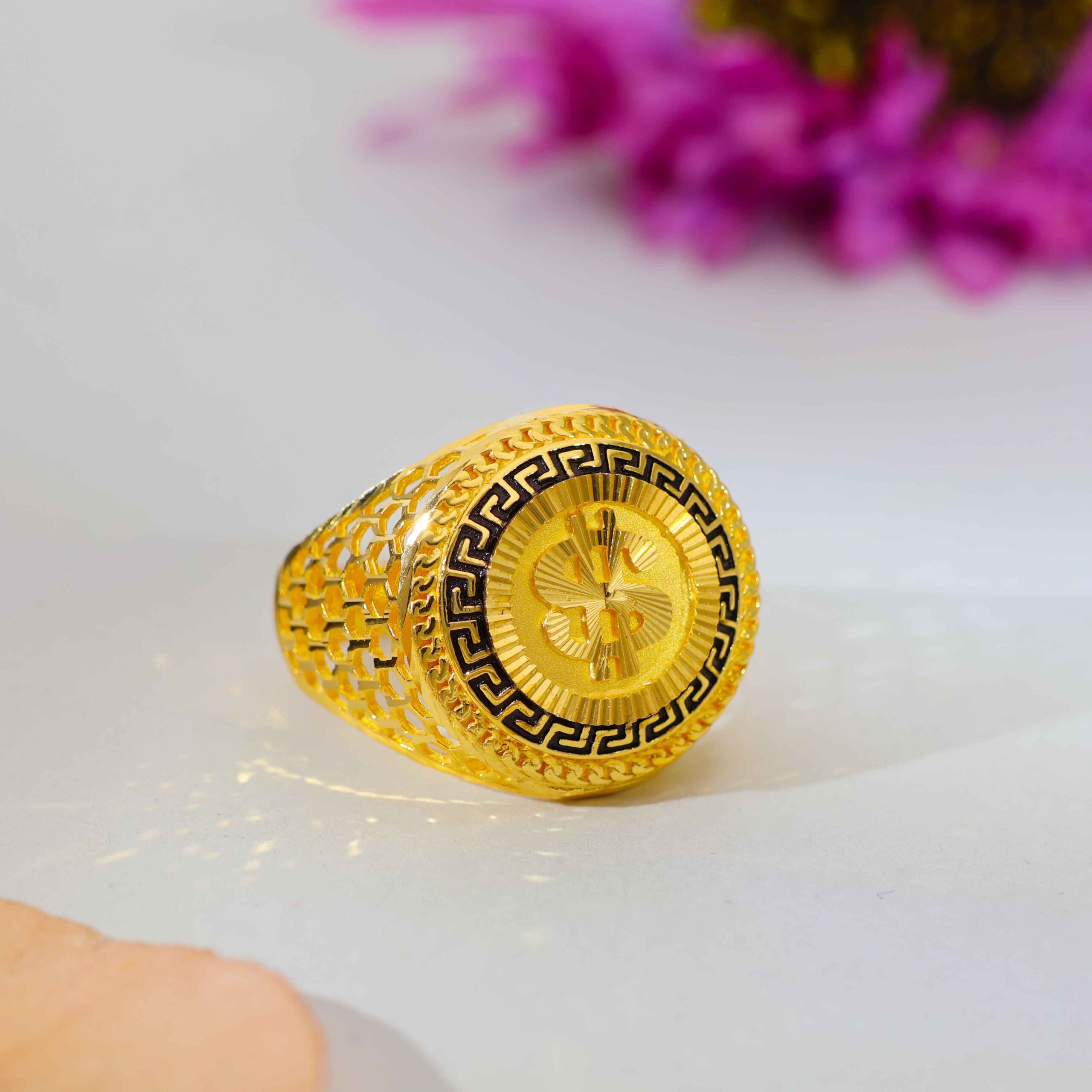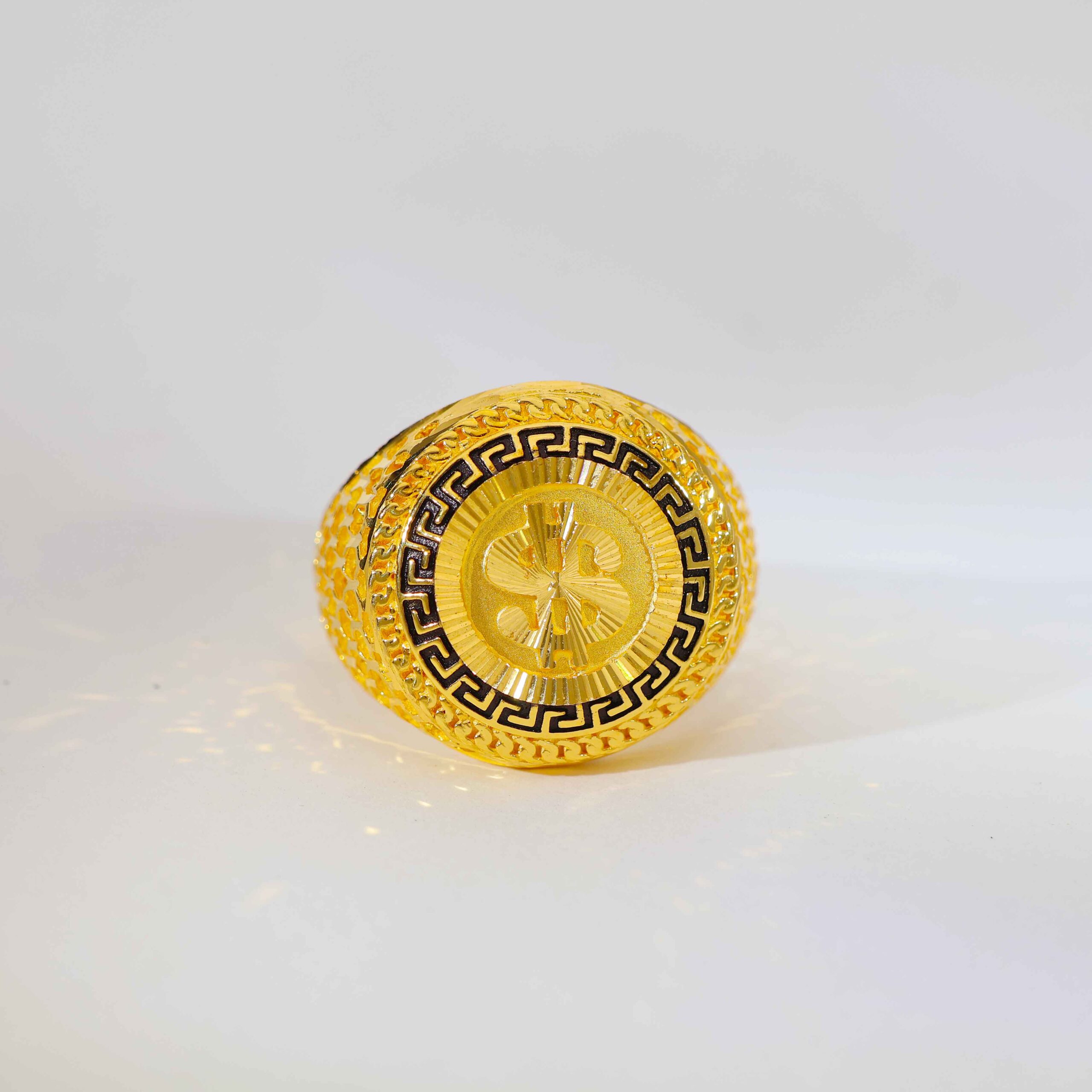 Design: Round textured face with a raised emblem, framed by a patterned border and a decorative open band that adds depth and shine.