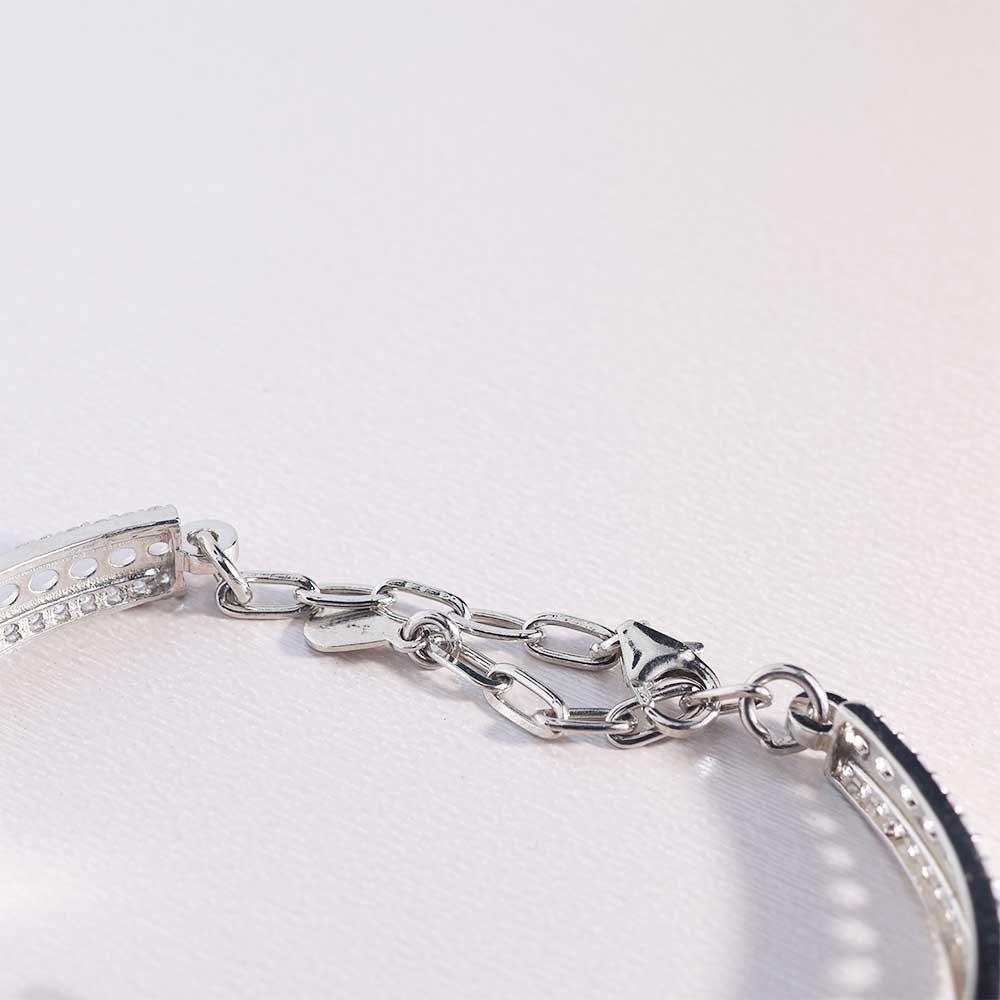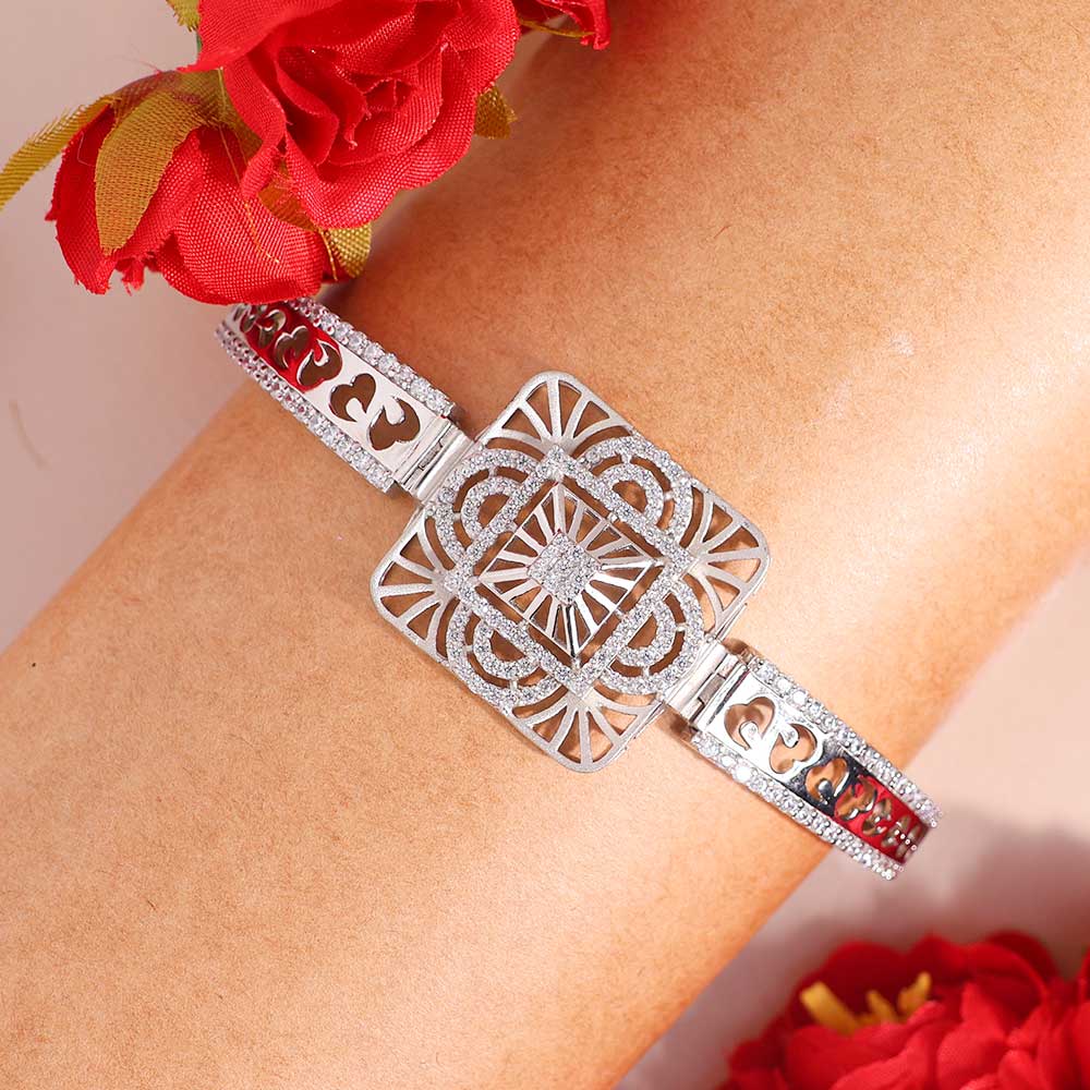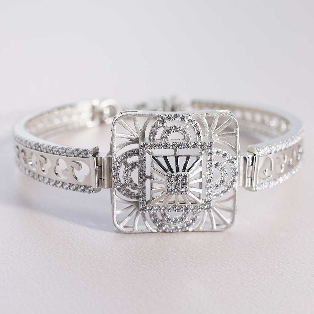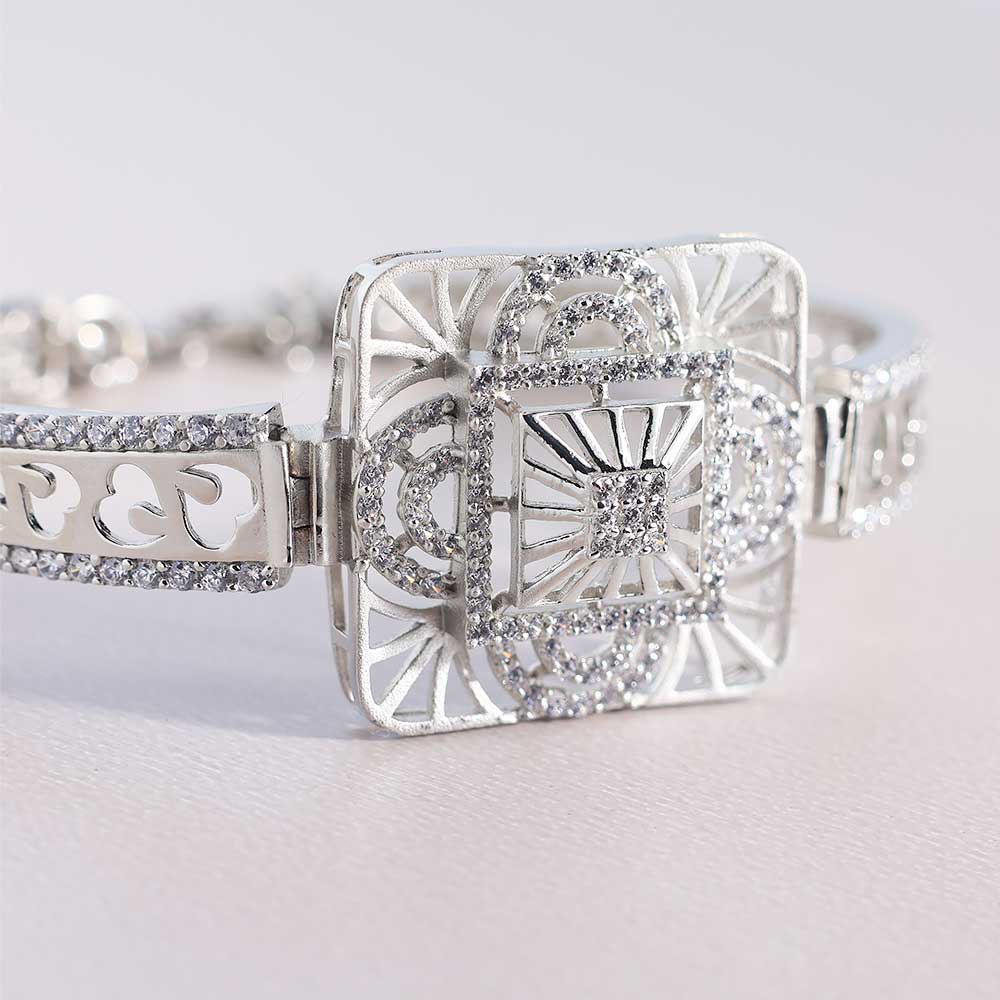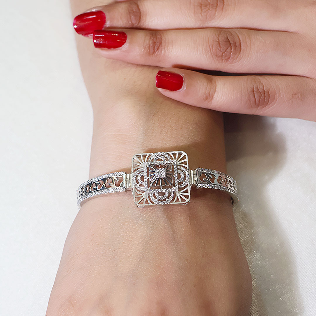 • Design: Crafted with a majestic square centerpiece adorned with pavé brilliance, delicate filigree patterns, and a structured band featuring intricate cut-out motifs, this bracelet exudes regal sophistication and classic beauty.